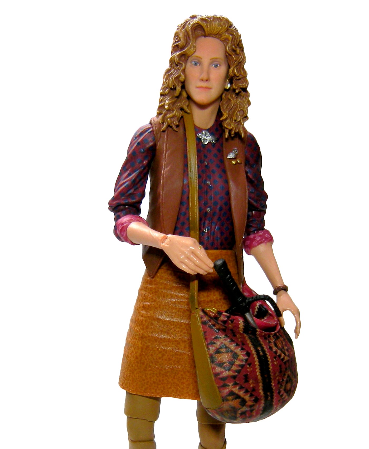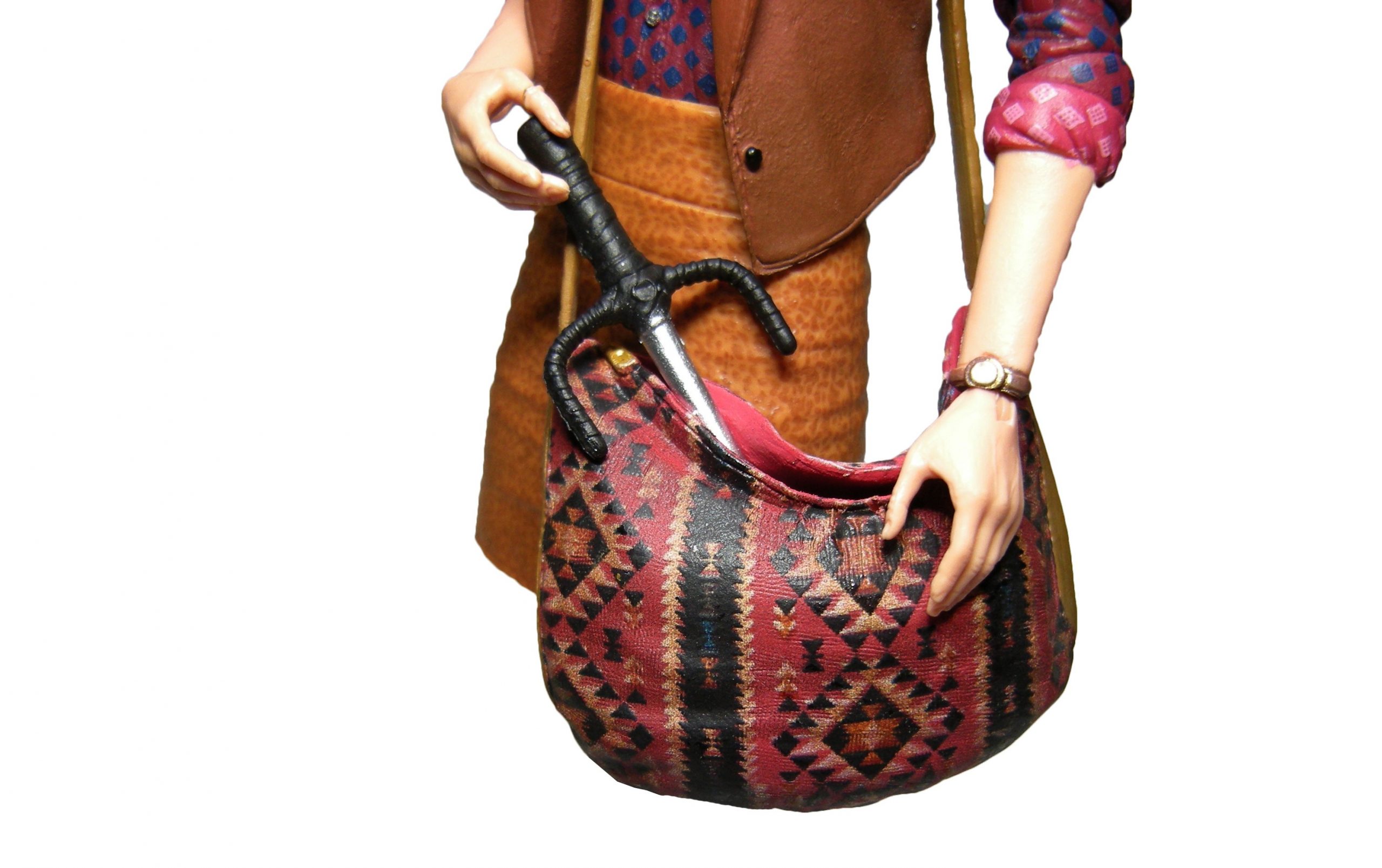 NECA a eu la très bonne idée de réaliser un sac malléable et creux avec une ouverture permettant d’y mettre à peu près tout ce que l’on veut. En revanche attention à ce sac ! Son plastique, souple, est fait pour l’ouvrir et mettre des objets à l’intérieur. Mais cela a tendance à écailler la peinture à l’avant. Très dommage, car les détails sont vraiment bons. Le sac est sculpté avec de très fines rainures imitant le tissu. La peinture (imprimée ?) accentue le réalisme de cet objet. Les imitations de cuir sur les côtés et la lanière sont excellentes. On retrouve même de fins liserais rappelant les coutures le long de la lanière. Le détail est poussé une fois encore à son maximum au vu de l’échelle.
