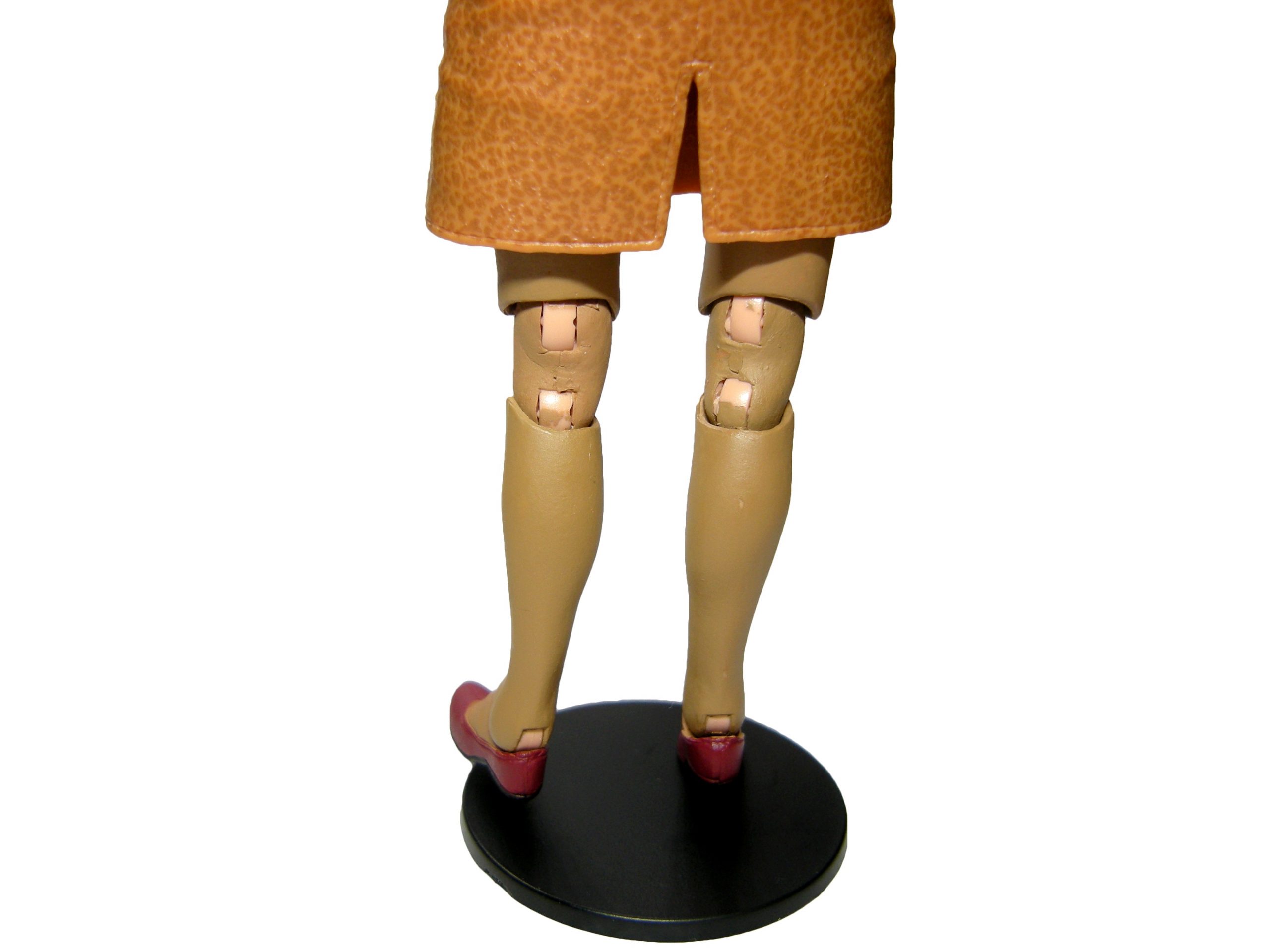 Ces articulations si disgracieuses qui ont fait polémique lors de la présentation de la figurine sont très problématiques. Ces doubles articulations permettent à la fois de plier les jambes pratiquement à 120°, mais aussi de tourner les genoux. Sur le papier c’est top ! En réalité c’est une plaie ! Ces articulations fragilisent la stabilité de la figurine et créent une arcature au niveau des jambes. Le problème est renforcé par l’articulation des chevilles, permettant de les bouger d’avant en arrière, mais offrent aussi une rotation légère sur le côté pour stabiliser le personnage au sol. Sauf que la finesse des chevilles déstabilise également à ce niveau l’équilibre de la figurine. En résulte une double déstabilisation genoux / cheville qui fait très facilement chuter April. L’ajout du socle ne change pas grand-chose, puisqu’il est très difficile de faire tenir les deux pieds dessus. Et dans tous les cas, la déstabilisation fait pencher la figurine vers l’avant (vous savez,