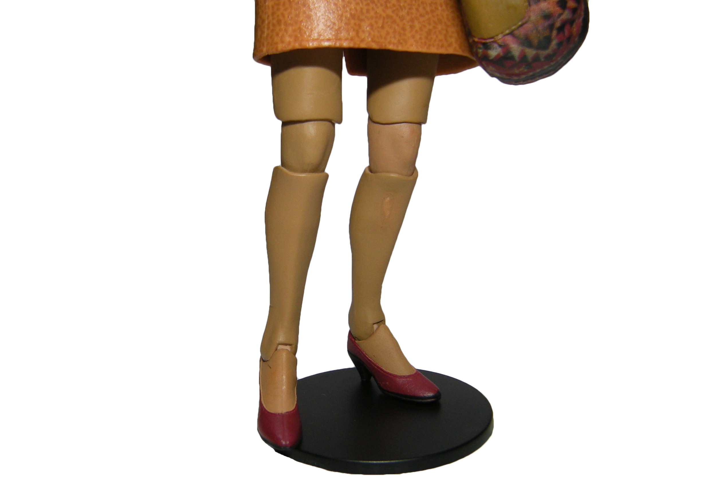 Nous arrivons au bas de la figurine. Aaaah ces jambes !! … L’articulation du bassin est en partie entravée par la jupe. Il est possible de bouger légèrement les cuisses d’avant en arrière et de les décaler sur le côté. Dommage que la jupe ne soit pas en tissu. Le rendu de peinture aurait peut-être été moins bon, mais il est quasiment impossible de bouger ces jambes.