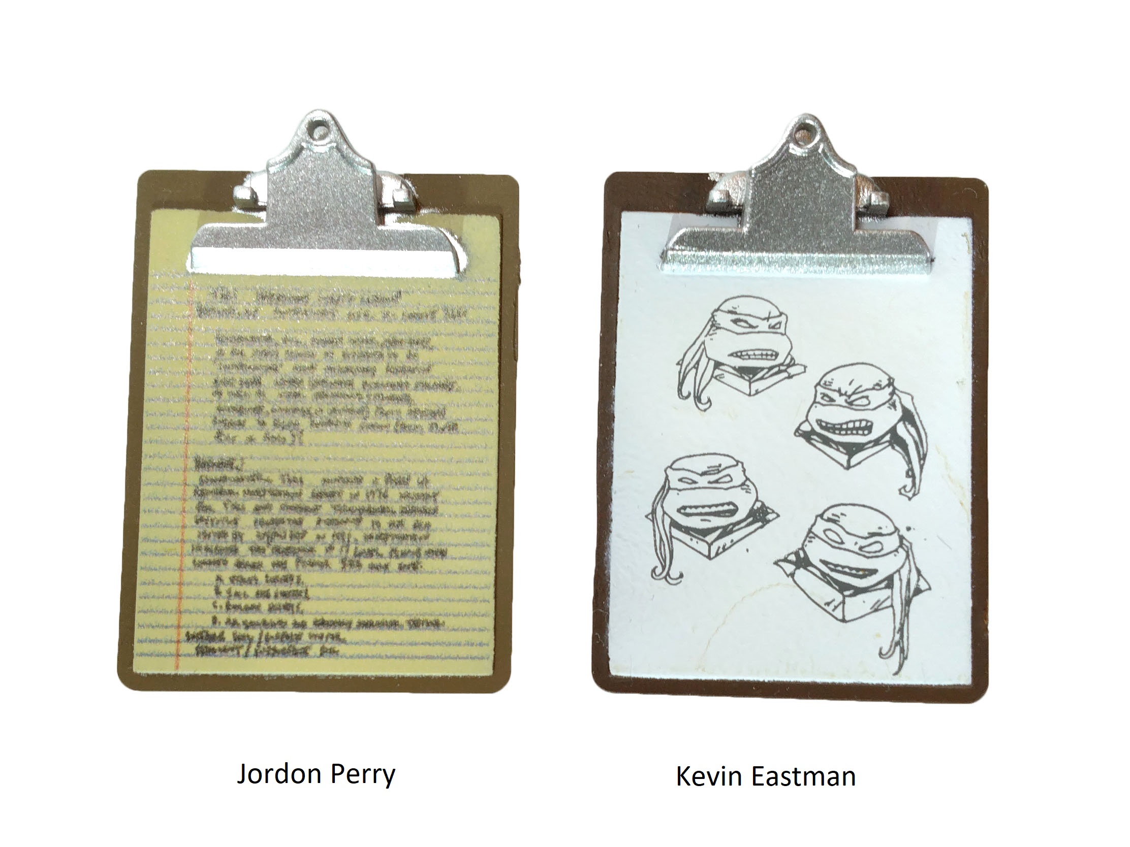 La planche à dessin est identique à celle de la figurine de Jordon Perry. Néanmoins, il ne s’agit plus d’une planche à notes, mais bien destinée aux dessins d’Eastman. Nous retrouvons l’esquisse des quatre tortues, dessinées de la main de l’artiste et imprimées sur cet accessoire.