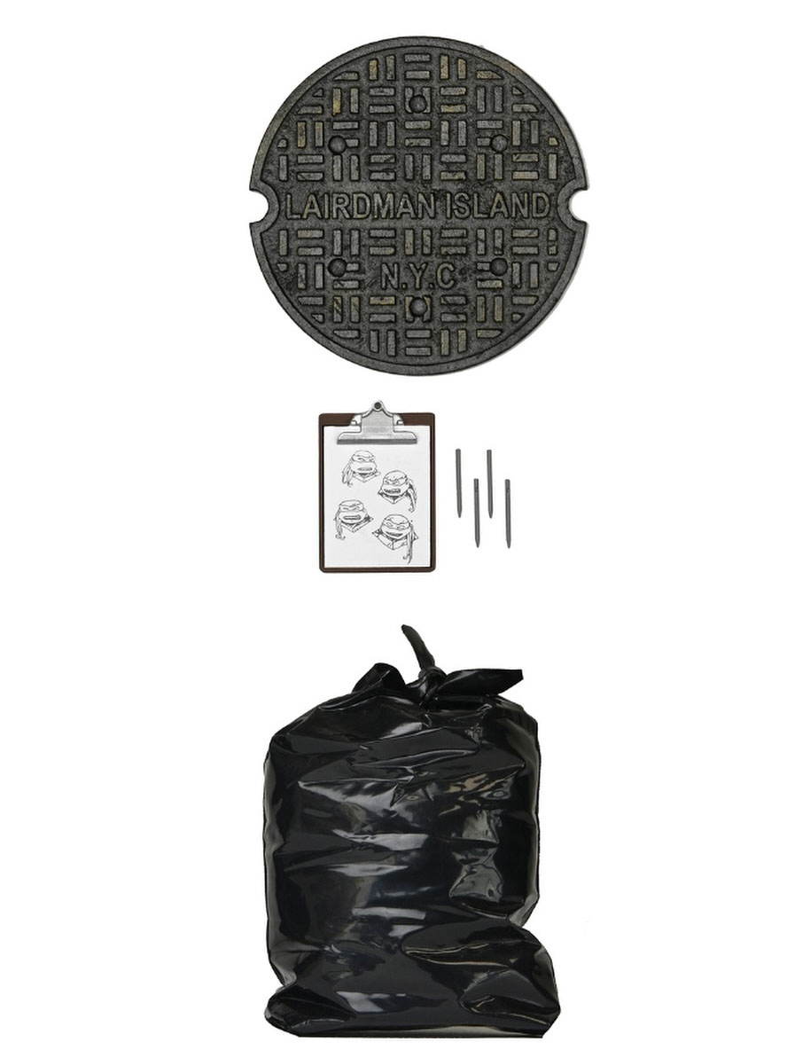 Enfin, NECA a glissé un ultime accessoire dans ce pack. Probablement mon préféré, une plaque d’égout ! Dessus, il est noté Lairdman Island, l’île où Shredder avait fait son refuge pour les délinquants qu’il endoctrinait. Cette plaque n’apparaît pas dans le film, mais c’est un très chouette clin d’œil, surtout lorsque l’on pense que Peter Laird n’aura hélas pas de figurine, n’étant pas apparu dans le film.