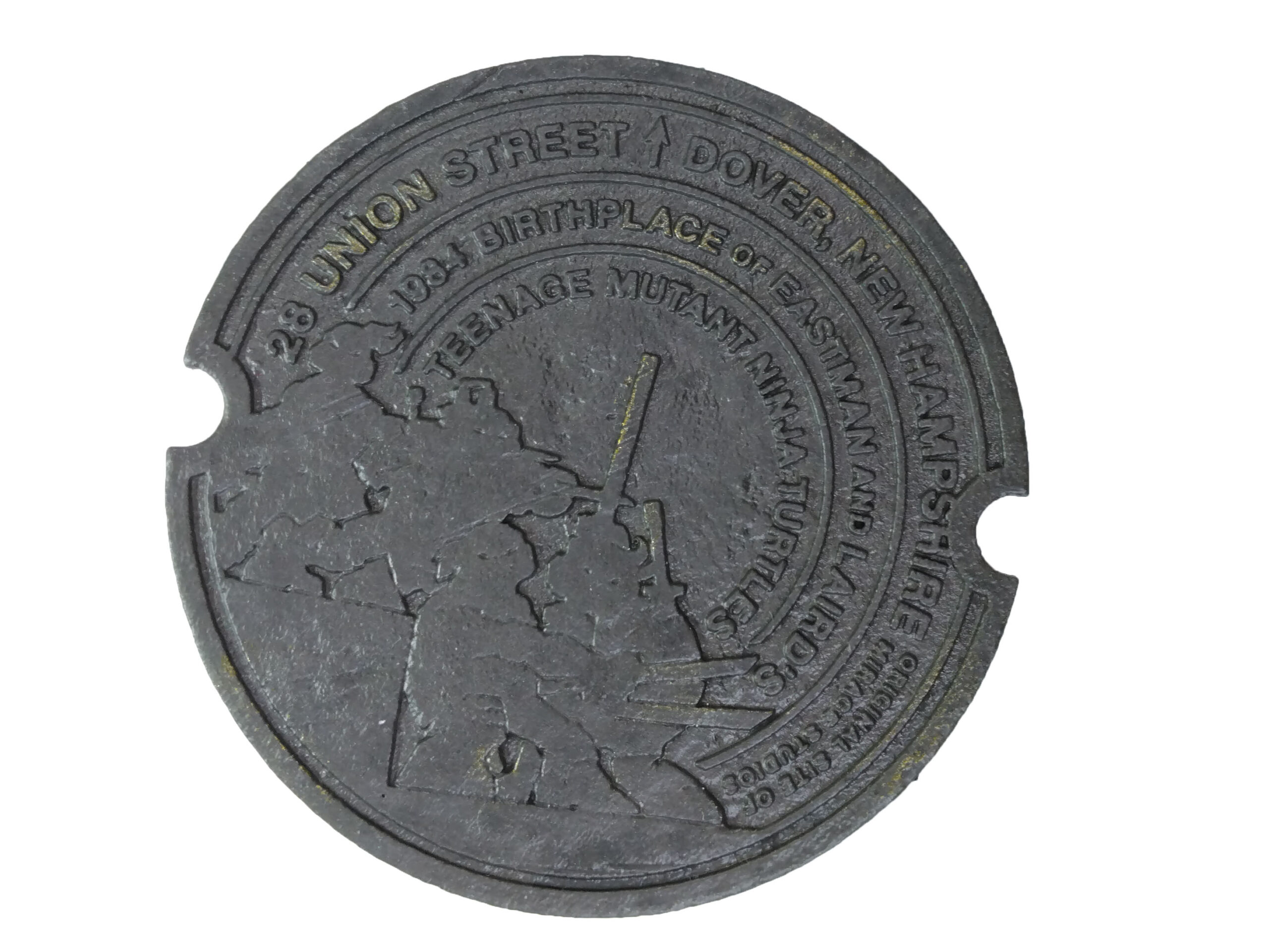Mais mon coup de cœur vient surtout du verso de cette plaque. Contrairement à la plaque fournie dans le pack d’accessoires de 2020, celle-ci est entièrement sculptée, et pas de n’importe quelle manière. Nous retrouvons l’image qui a été moulée pour la plaque d’égout commémorative, implantée devant l’emplacement de la maison où Eastman et Laird ont créés les Tortues Ninja en novembre 1983. Cette plaque a été inaugurée le 29 novembre 2023, pour les 40 ans, en présence d’Eastman (en savoir plus). Enfin, ironie de la chose, la maison a été rasée depuis de nombreuses années. Le terrain est resté dès lors inoccupé et un local à poubelles a été implanté à la place.