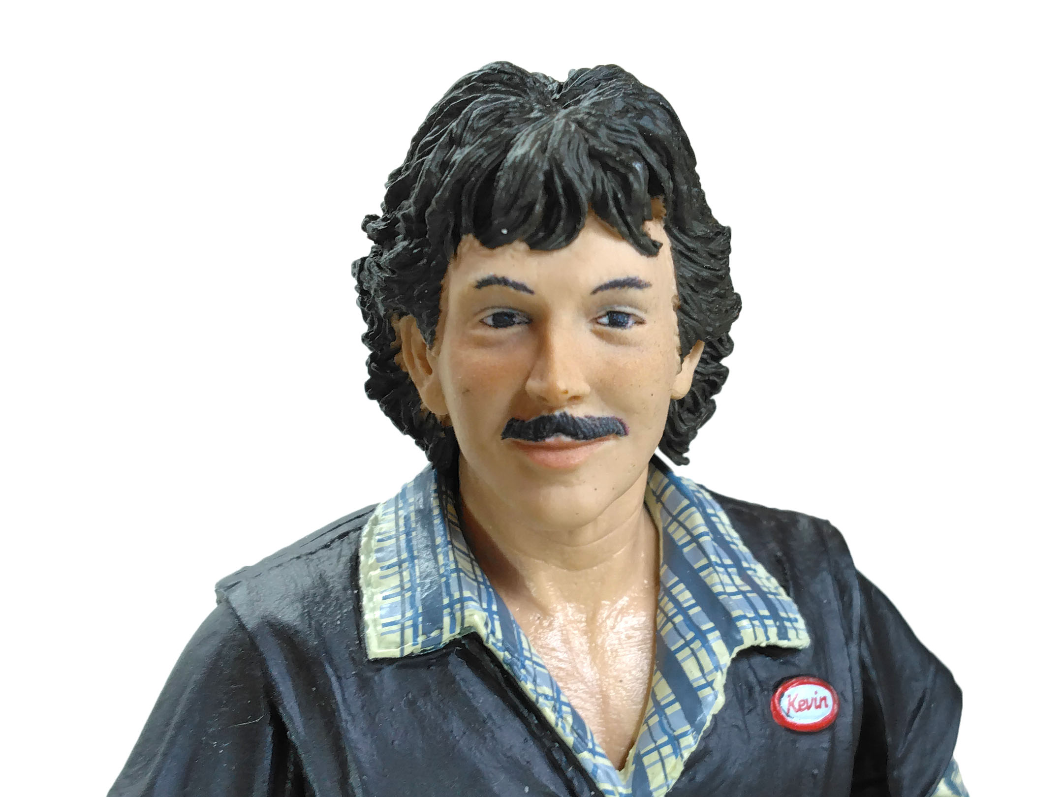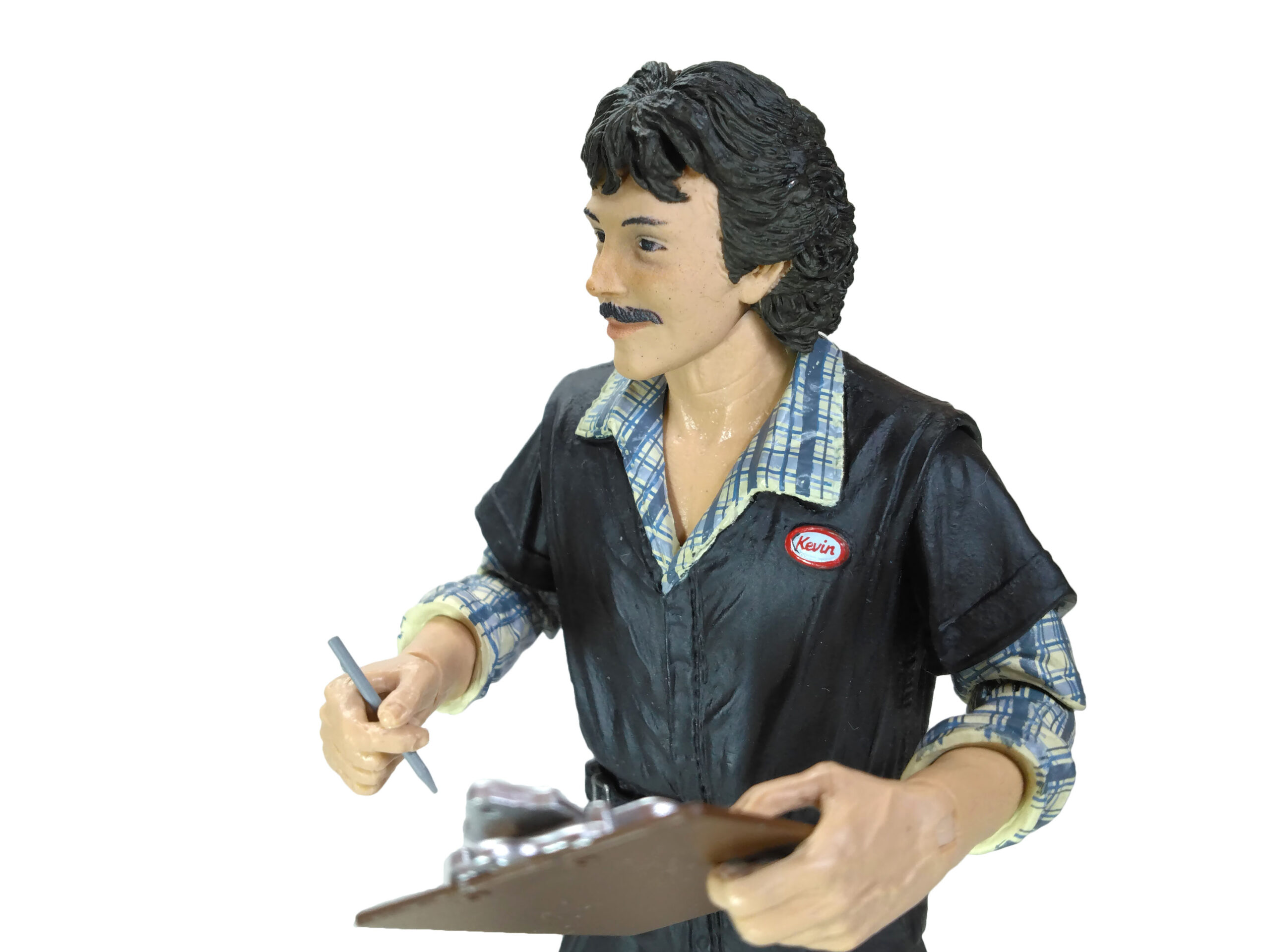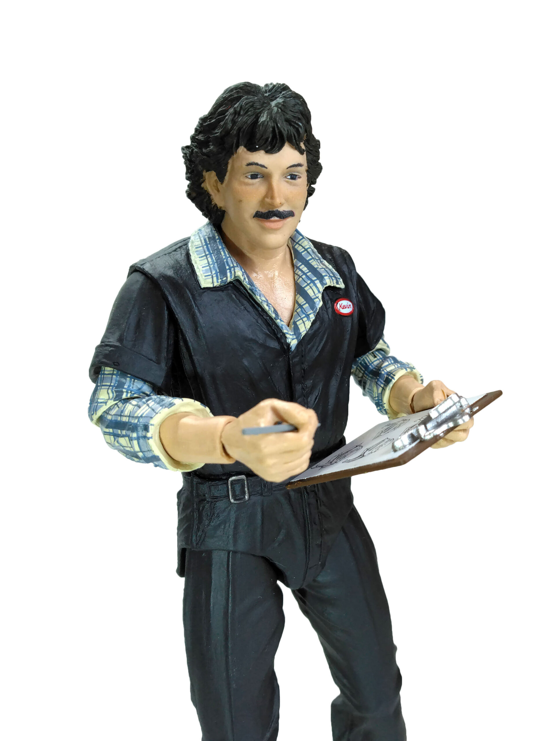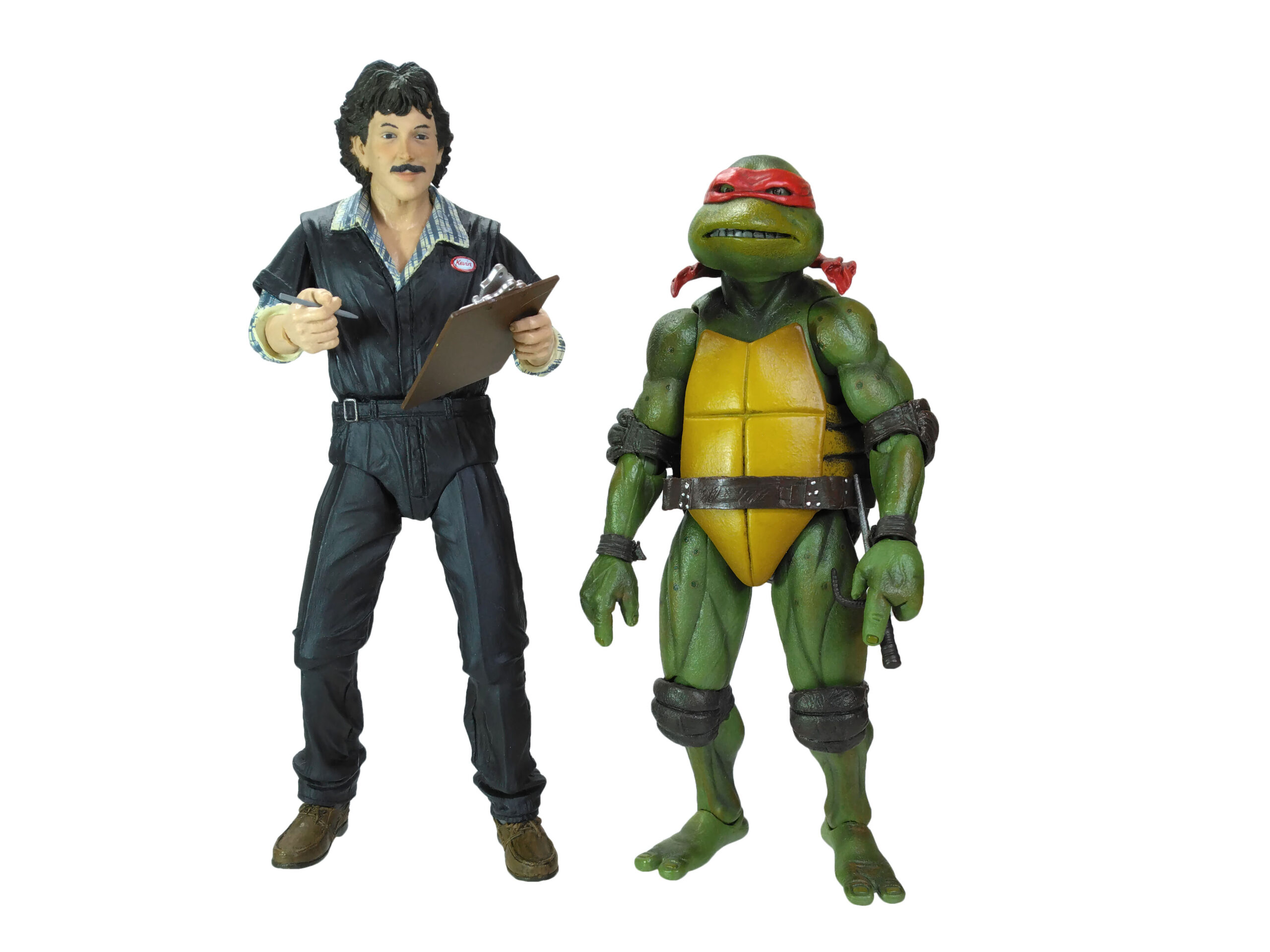 Au niveau de la poitrine, nous retrouvons un badge blanc, cerclé de rouge, avec le nom de l’employé, Kevin. Le visage est très réussi, comme les autres figurines tirées du film des Tortues Ninja. Nous n’avons pas un simple bout de plastique couleur chair. Les joues du personnage sont légèrement rosées pour donner un air vivant. De même le travail de peinture pour les yeux, la moustache, les lèvres ou encore les sourcils est très bons.