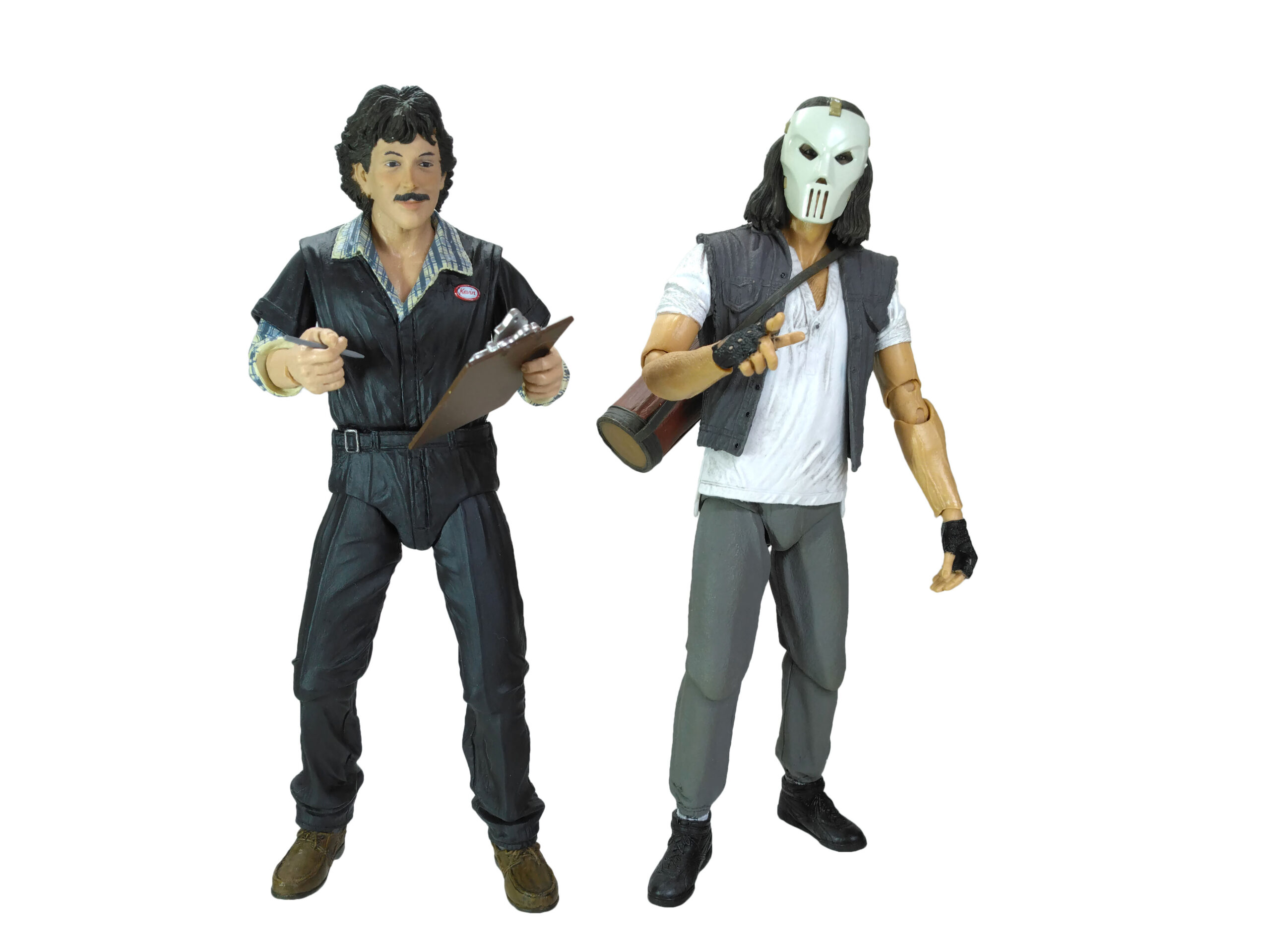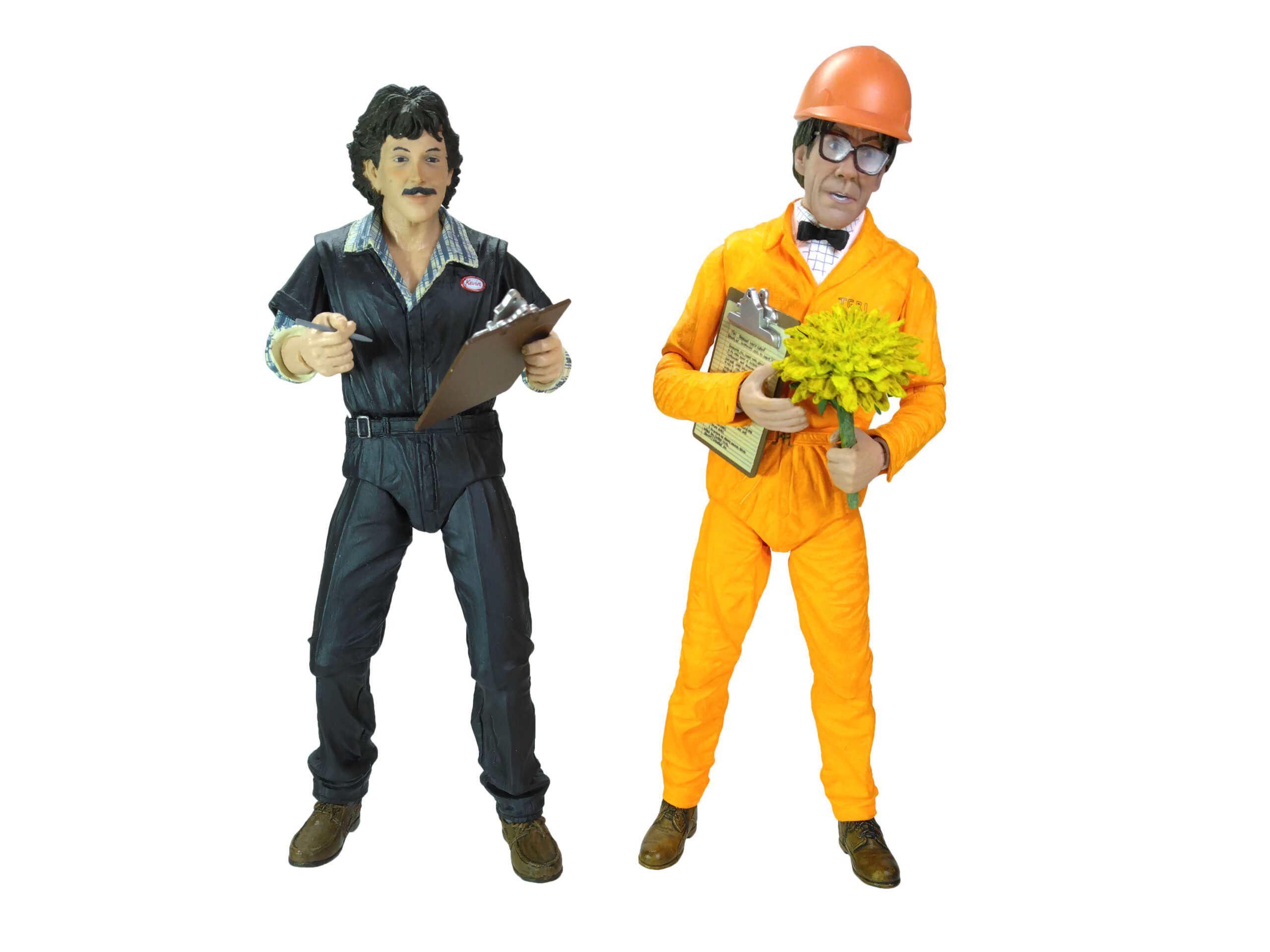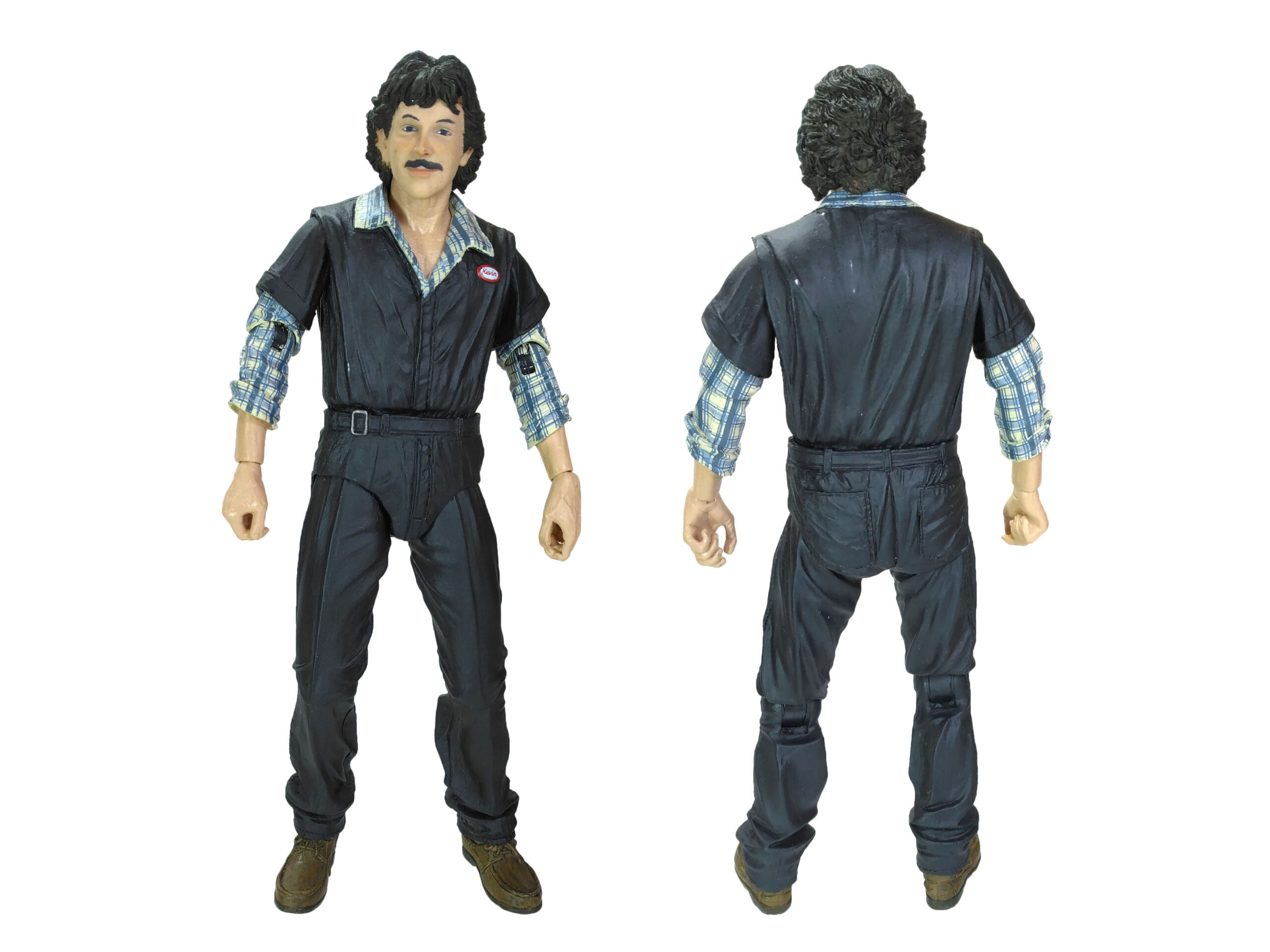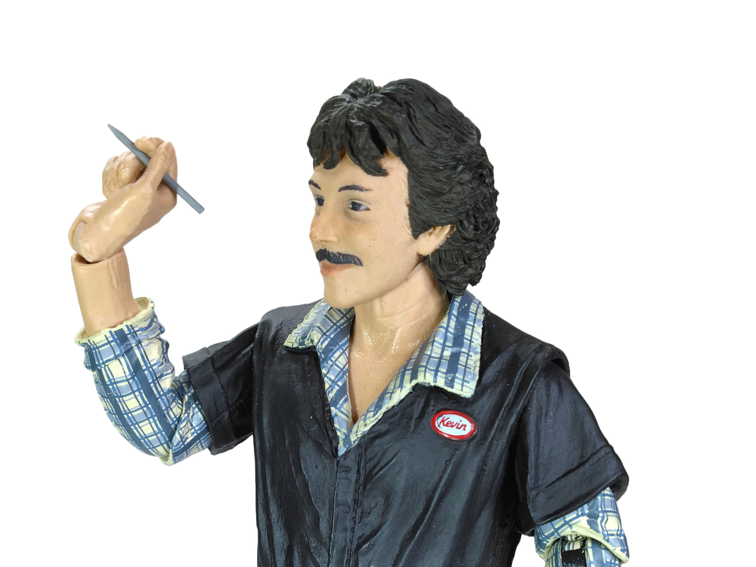Au niveau de la poitrine, nous retrouvons un badge blanc, cerclé de rouge, avec le nom de l’employé, Kevin. Le visage est très réussi, comme les autres figurines tirées du film des Tortues Ninja. Nous n’avons pas un simple bout de plastique couleur chair. Les joues du personnage sont légèrement rosées pour donner un air vivant. De même le travail de peinture pour les yeux, la moustache, les lèvres ou encore les sourcils est très bons.