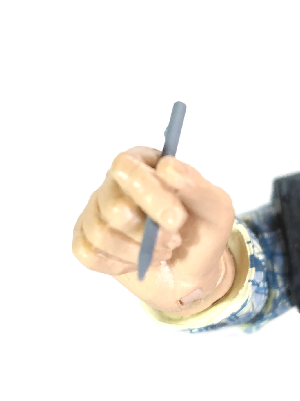La figurine d’Eastman est aussi grande qu’un autre humain pour ce film, comme Casey ou Shredder. Sa tenue est faite en grande partie avec du plastique rigide. Seule la partie du bassin, destinée à permettre aux jambes de bouger, est réalisée dans un plastique souple. Cette combinaison est truffée de détails, entre plis, coutures, boucle de ceinture, poches. La chemise qui en dépasse est sculptée directement dessus. Nous retrouvons également un petit badge au niveau de la poitrine du personnage. Les bras ne sont pas en reste, avec un très beau plissé de la chemise.