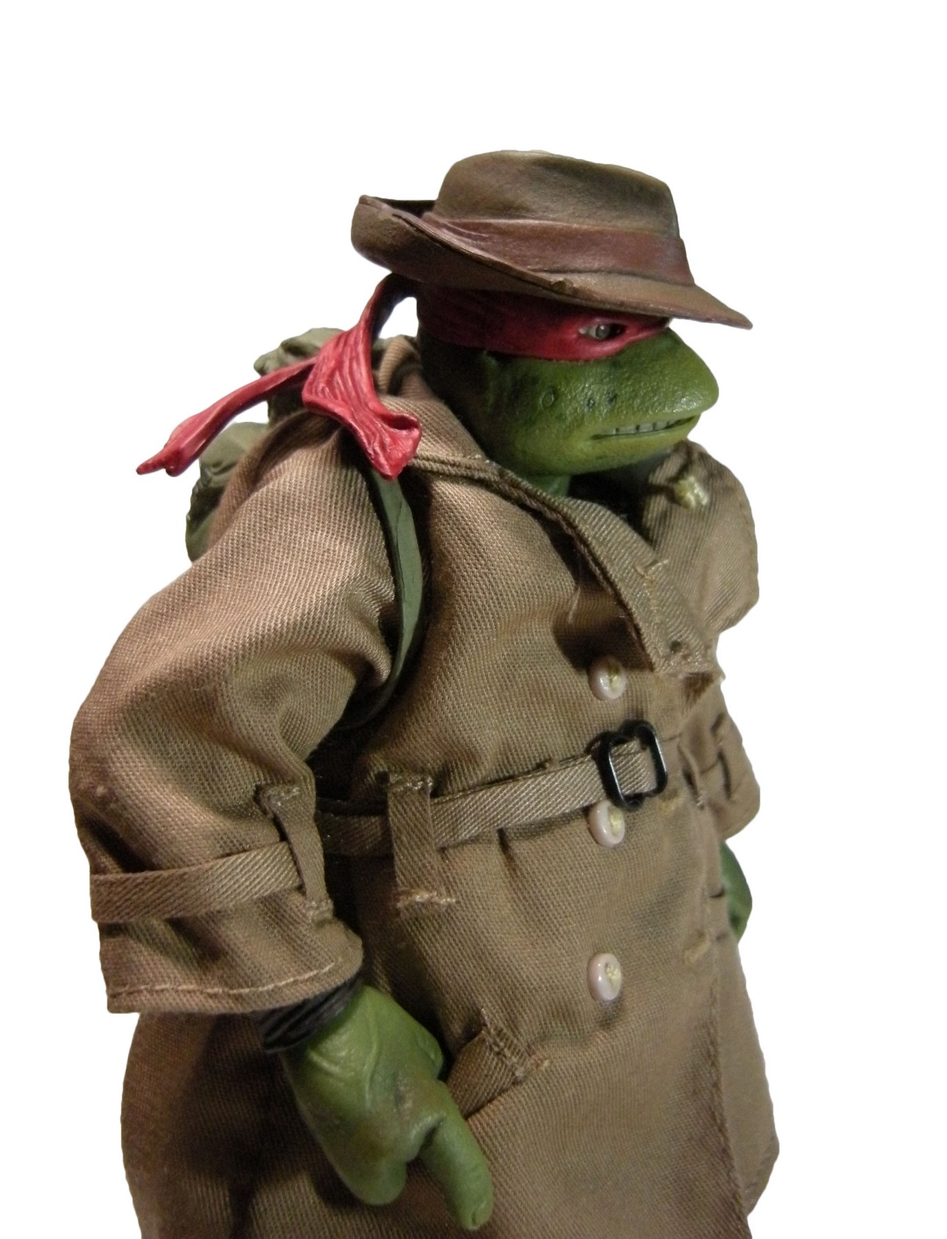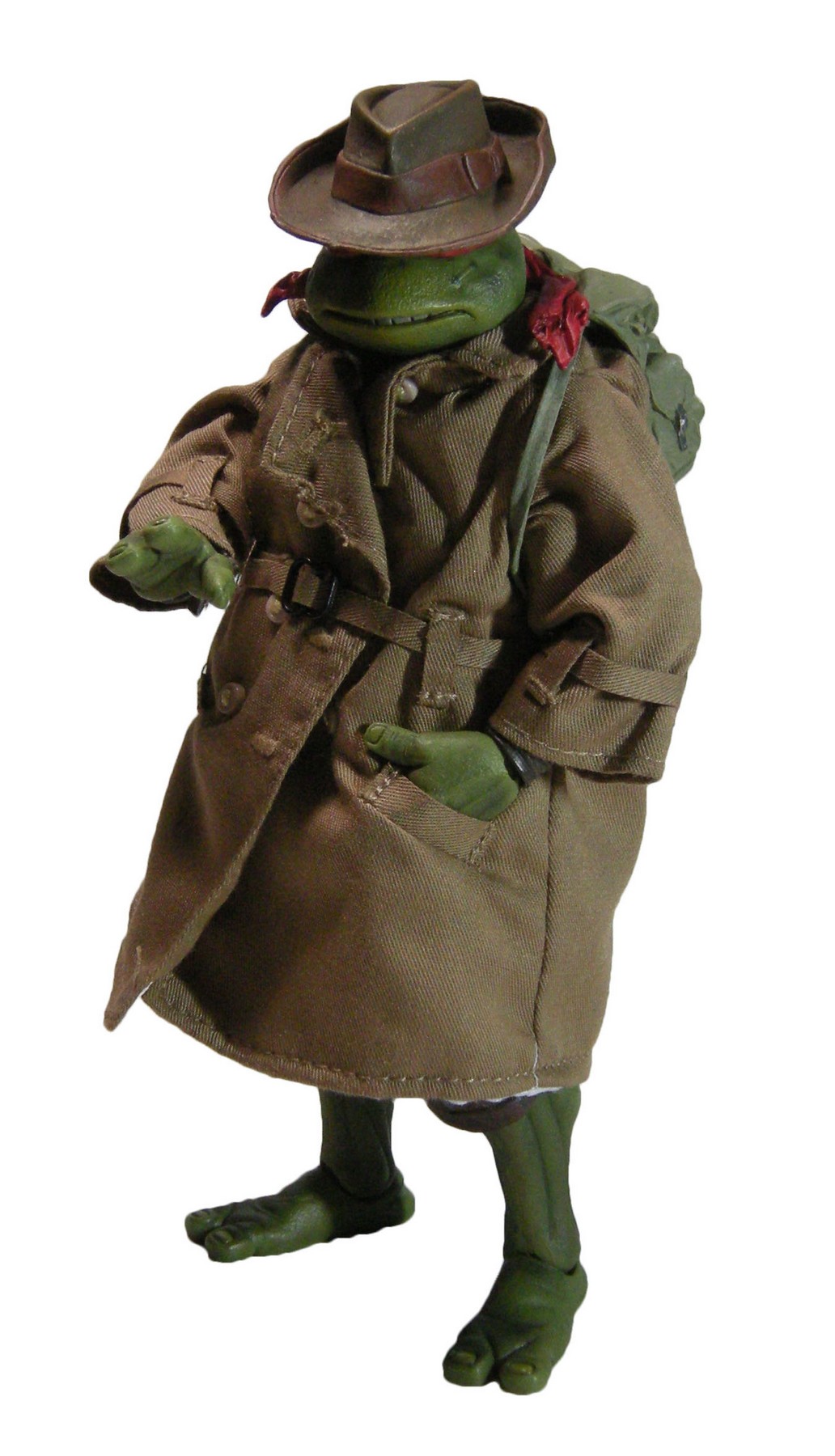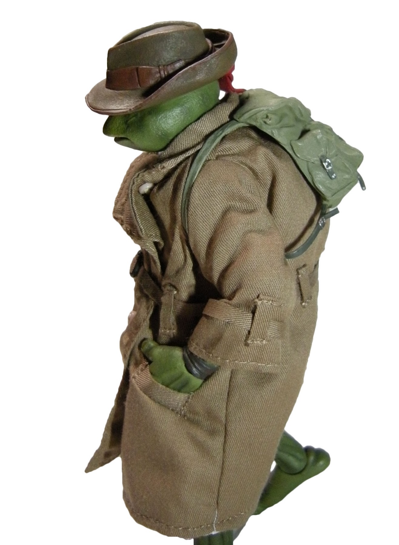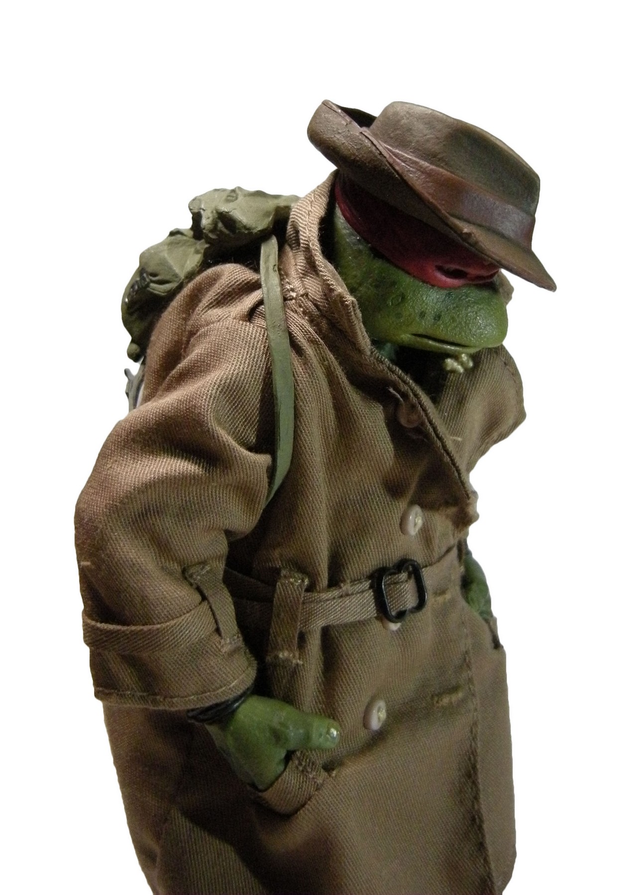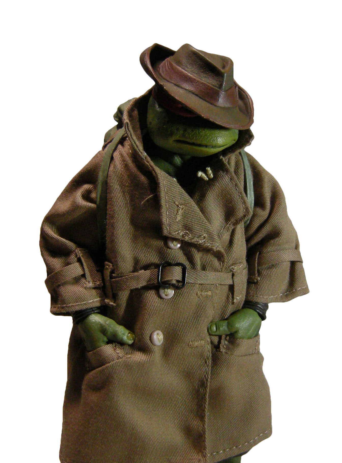 Enfin, le costume ! Le vêtement est réalisé entièrement en tissu. L’ensemble est très bien fini avec de nombreuses coutures. On pourrait peut-être regretter le tissu trop ample pour l’échelle, rendant la tortue « obèse » sous son manteau. Ce n’est pas vraiment le rendu d’un trench-coat, plutôt fin en général. Celui de la version Q Scale était peut-être plus réaliste à ce niveau.
