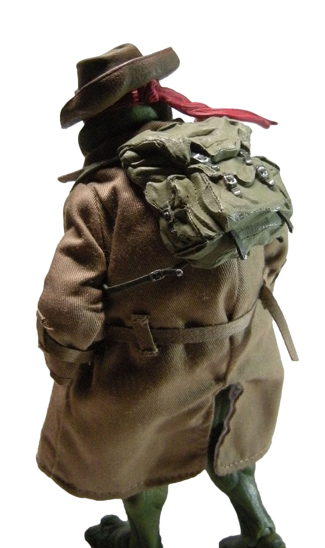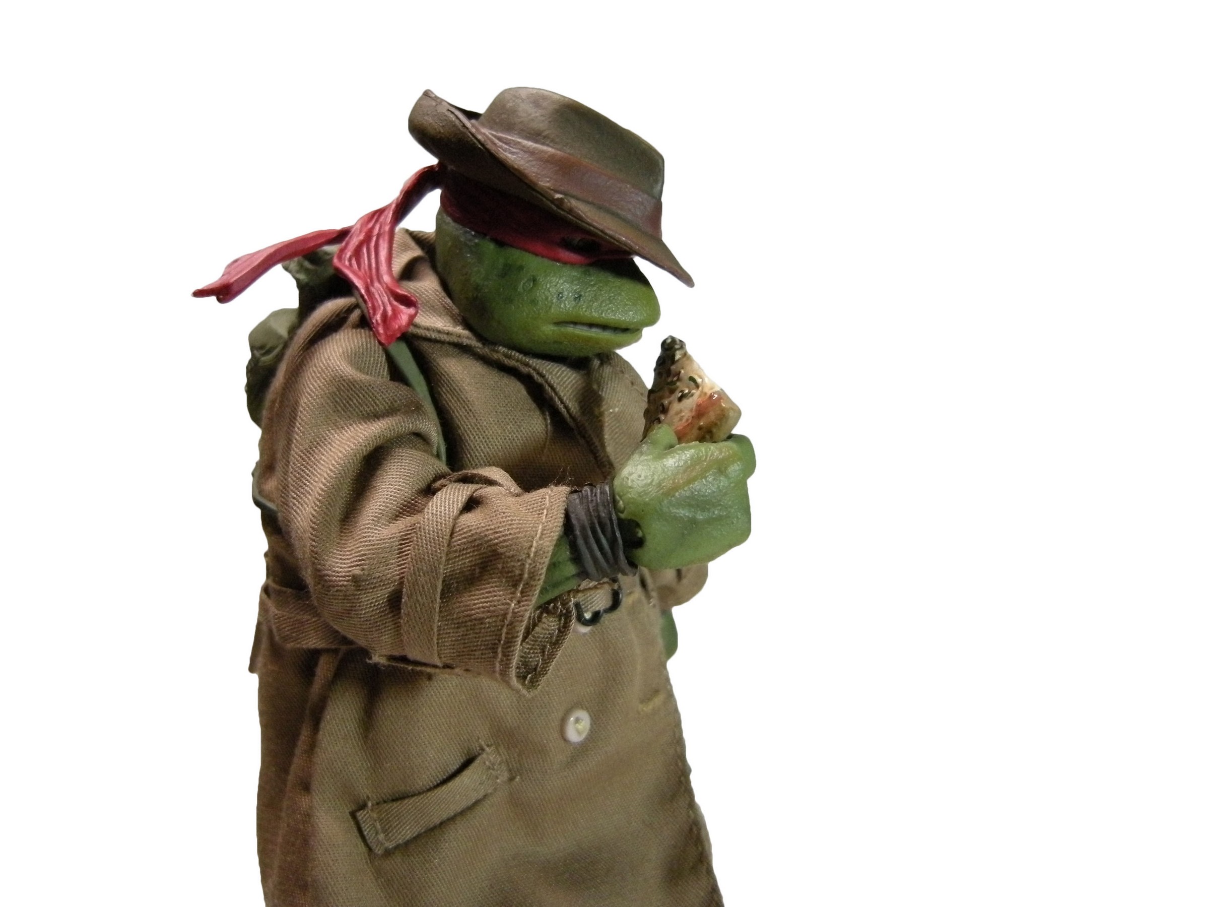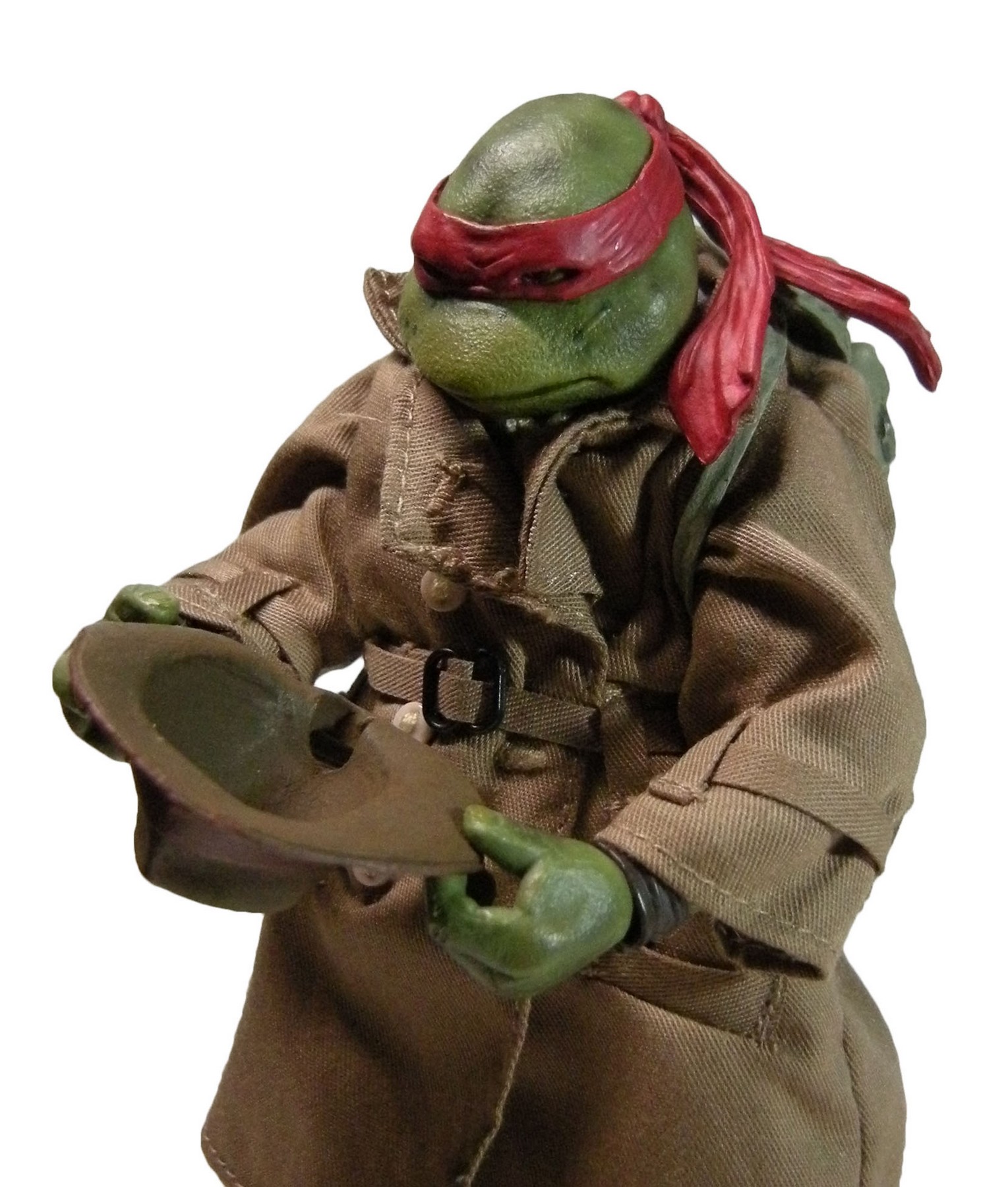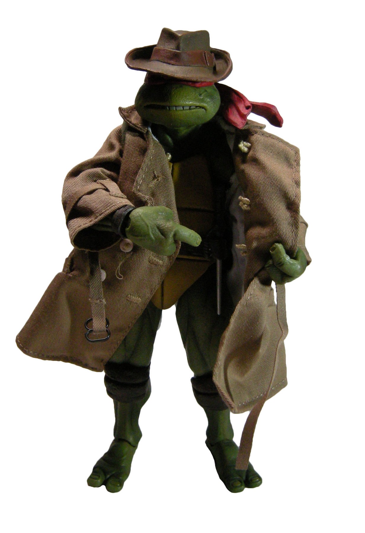 Enfin, le costume ! Le vêtement est réalisé entièrement en tissu. L’ensemble est très bien fini avec de nombreuses coutures. On pourrait peut-être regretter le tissu trop ample pour l’échelle, rendant la tortue « obèse » sous son manteau. Ce n’est pas vraiment le rendu d’un trench-coat, plutôt fin en général. Celui de la version Q Scale était peut-être plus réaliste à ce niveau.