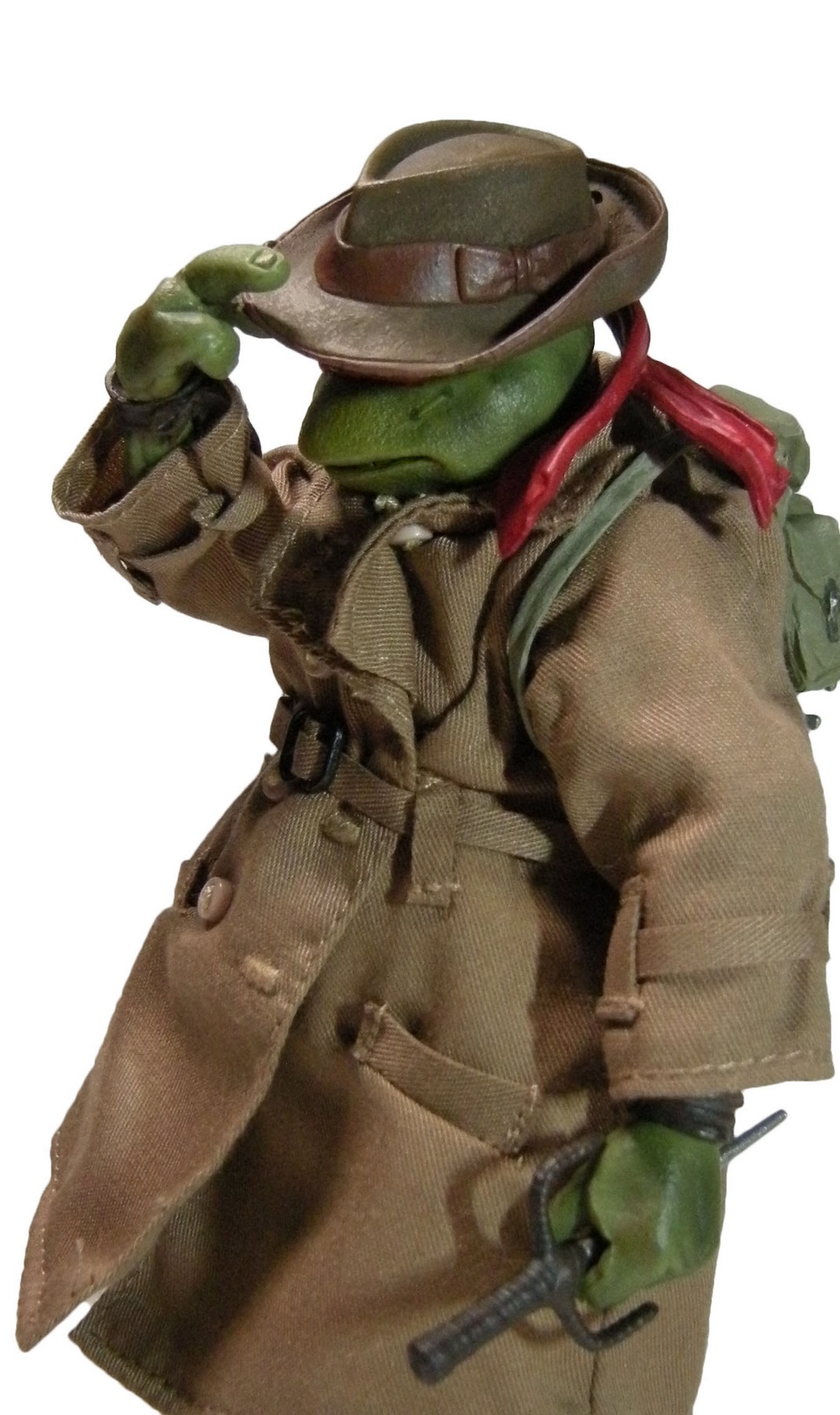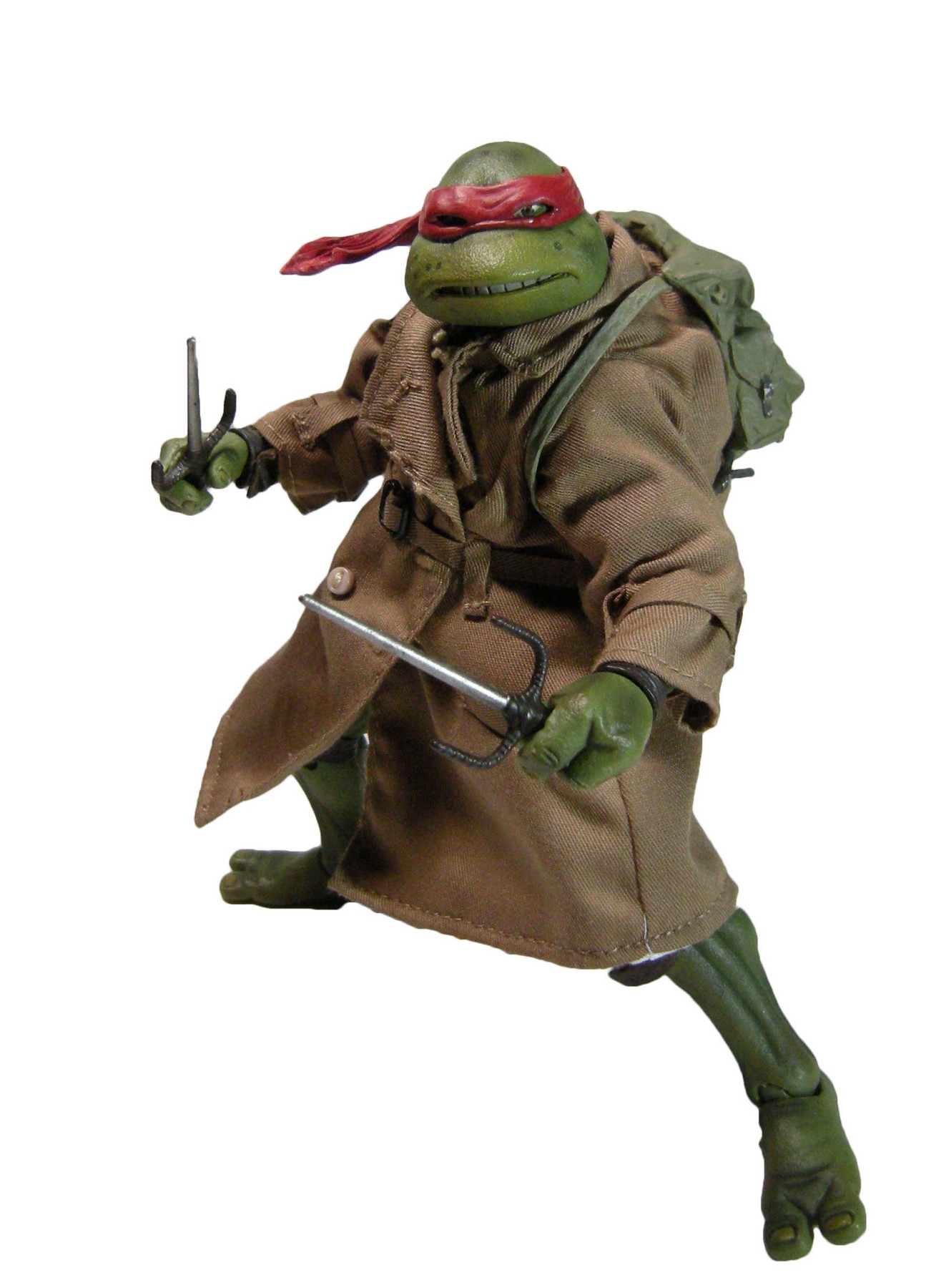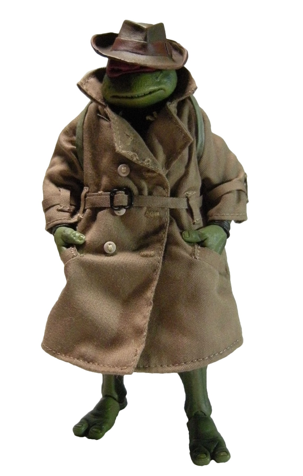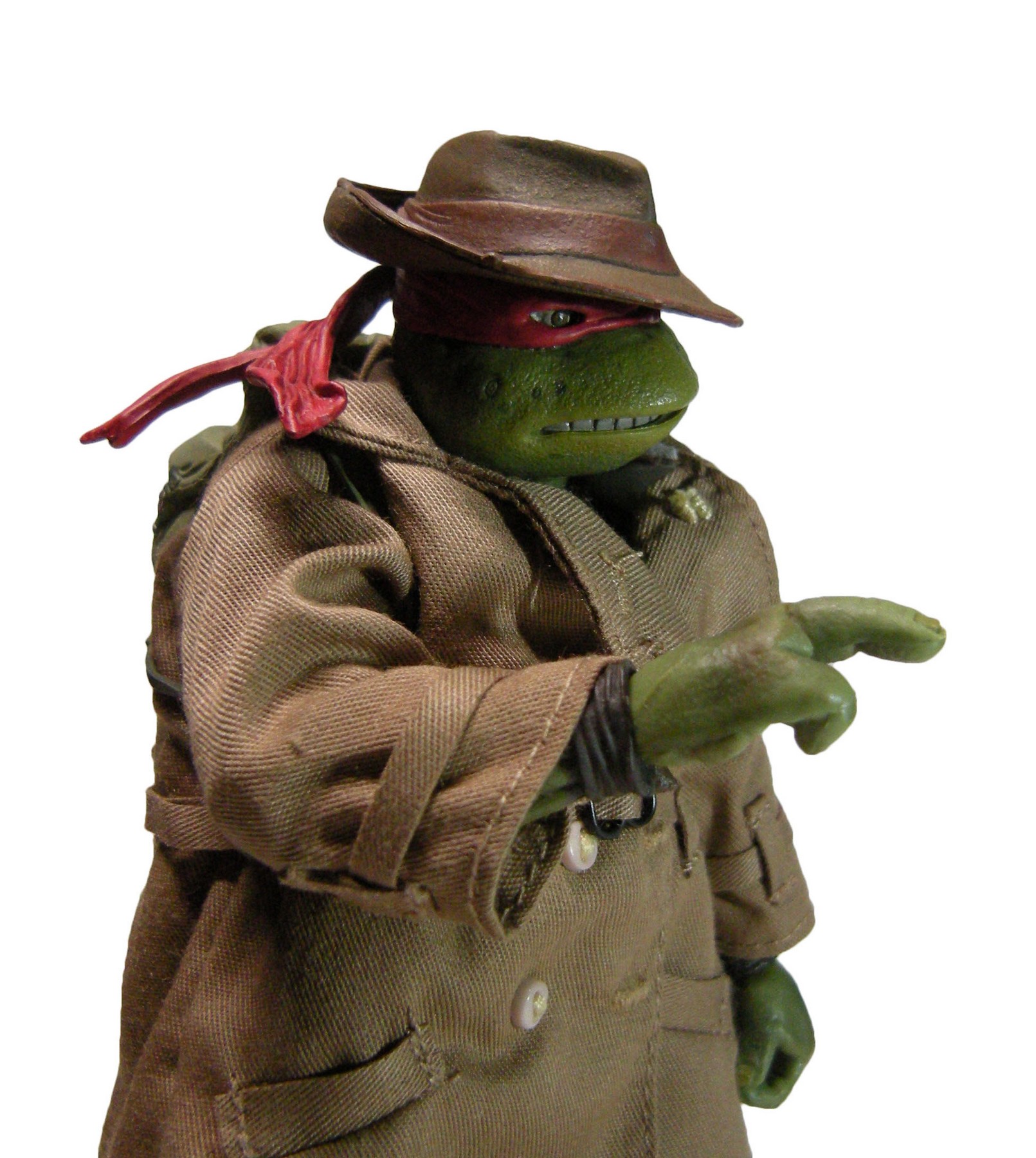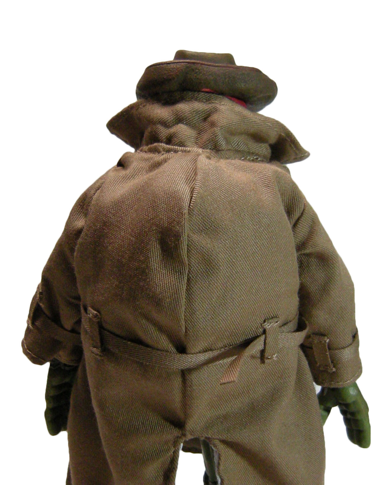 Enfin, le costume ! Le vêtement est réalisé entièrement en tissu. L’ensemble est très bien fini avec de nombreuses coutures. On pourrait peut-être regretter le tissu trop ample pour l’échelle, rendant la tortue « obèse » sous son manteau. Ce n’est pas vraiment le rendu d’un trench-coat, plutôt fin en général. Celui de la version Q Scale était peut-être plus réaliste à ce niveau.