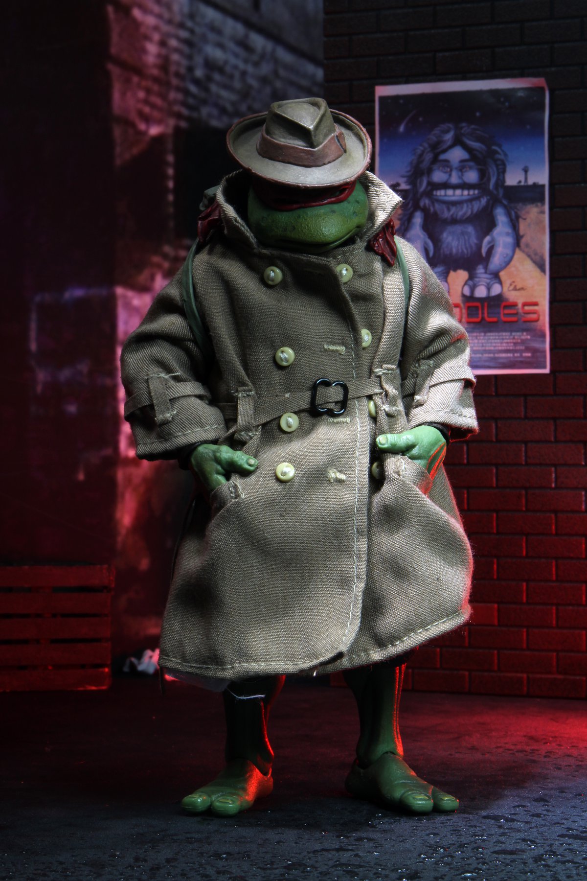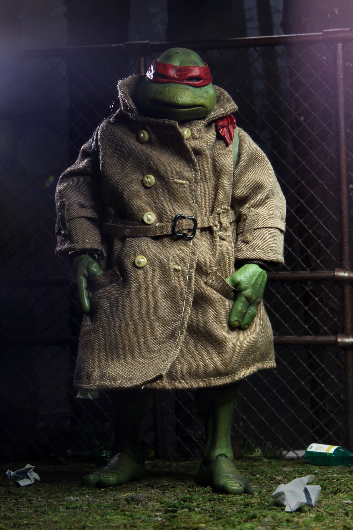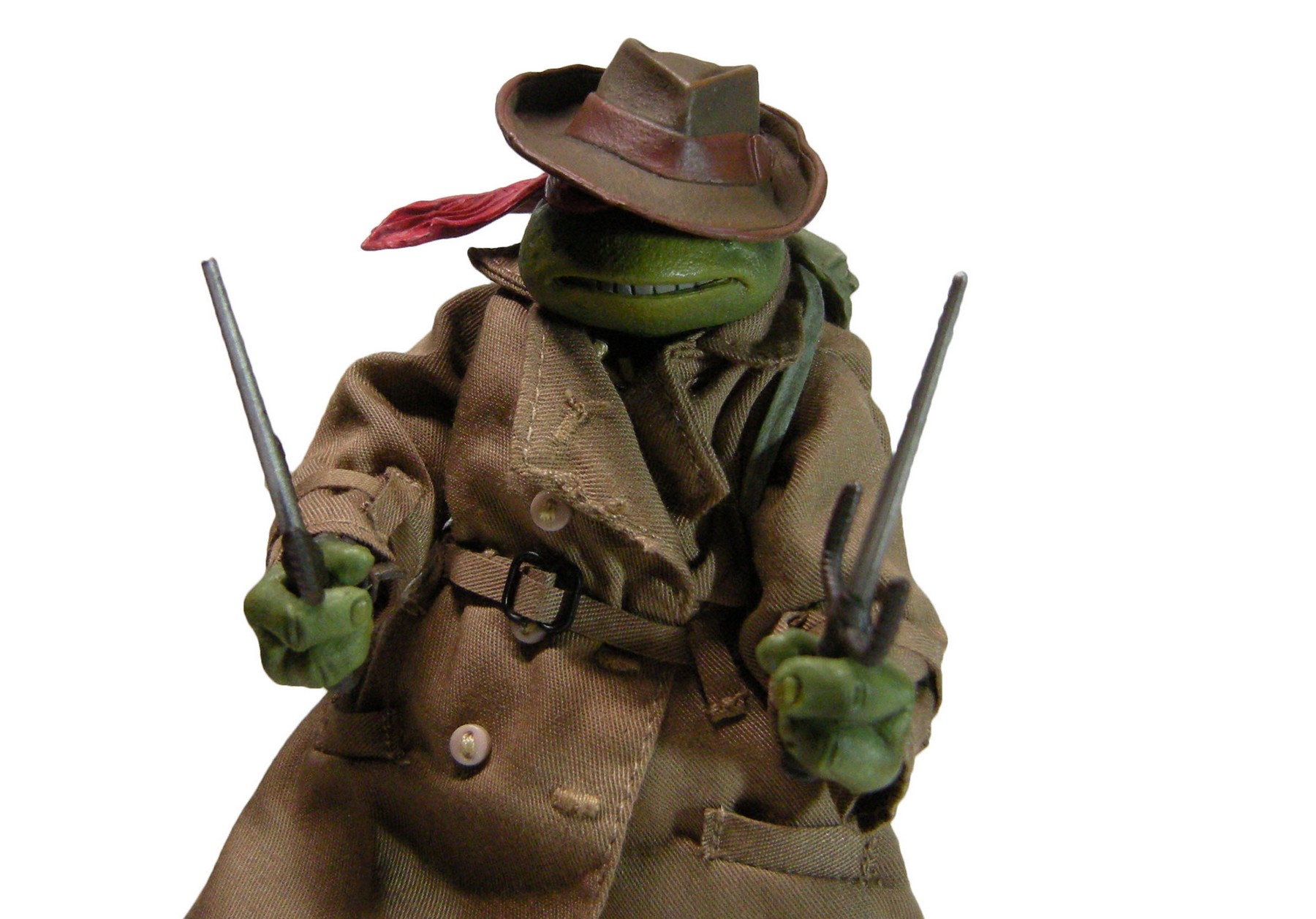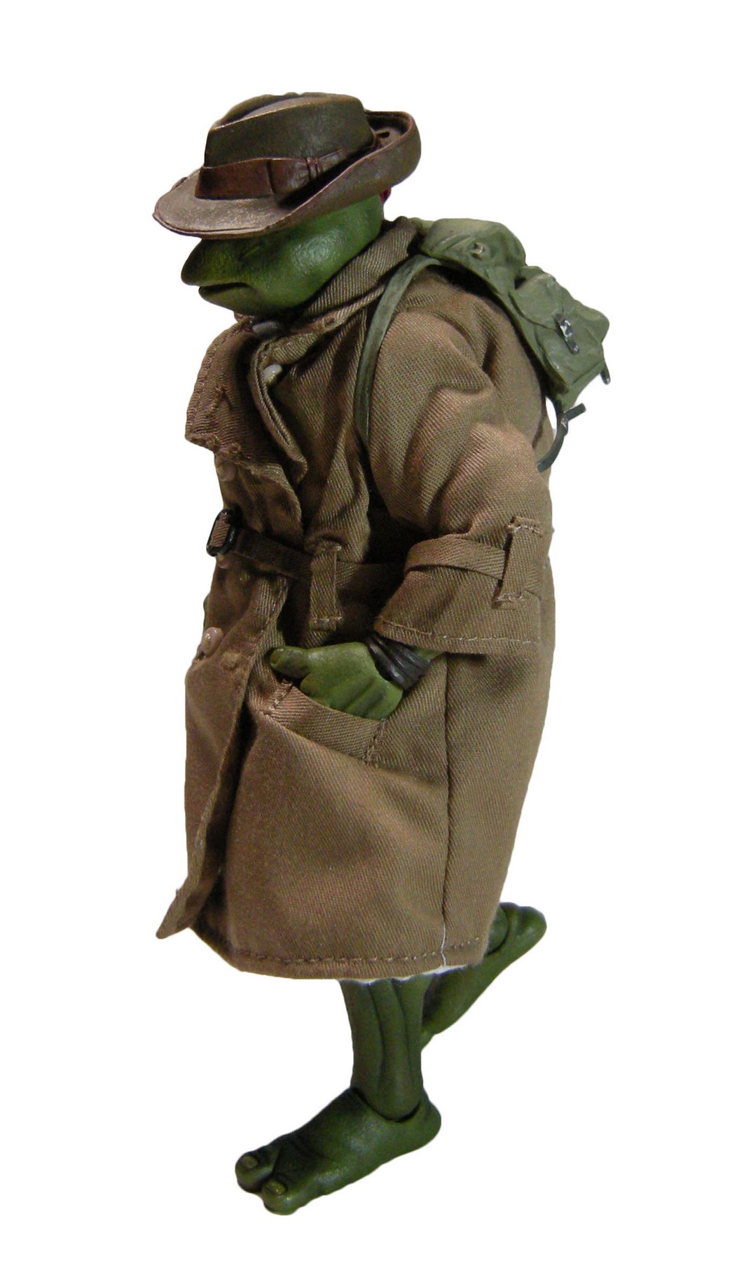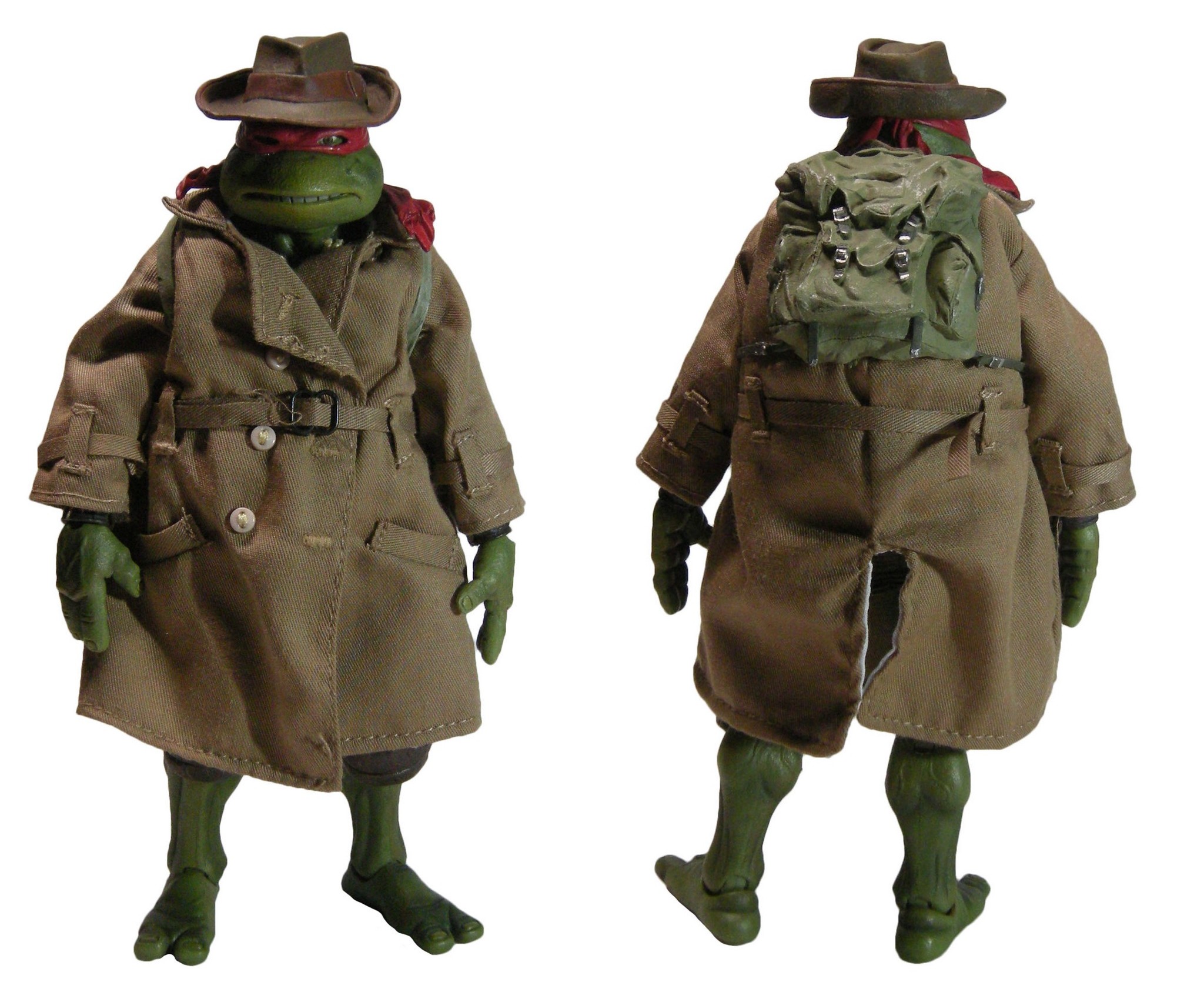 Enfin, le costume ! Le vêtement est réalisé entièrement en tissu. L’ensemble est très bien fini avec de nombreuses coutures. On pourrait peut-être regretter le tissu trop ample pour l’échelle, rendant la tortue « obèse » sous son manteau. Ce n’est pas vraiment le rendu d’un trench-coat, plutôt fin en général. Celui de la version Q Scale était peut-être plus réaliste à ce niveau.