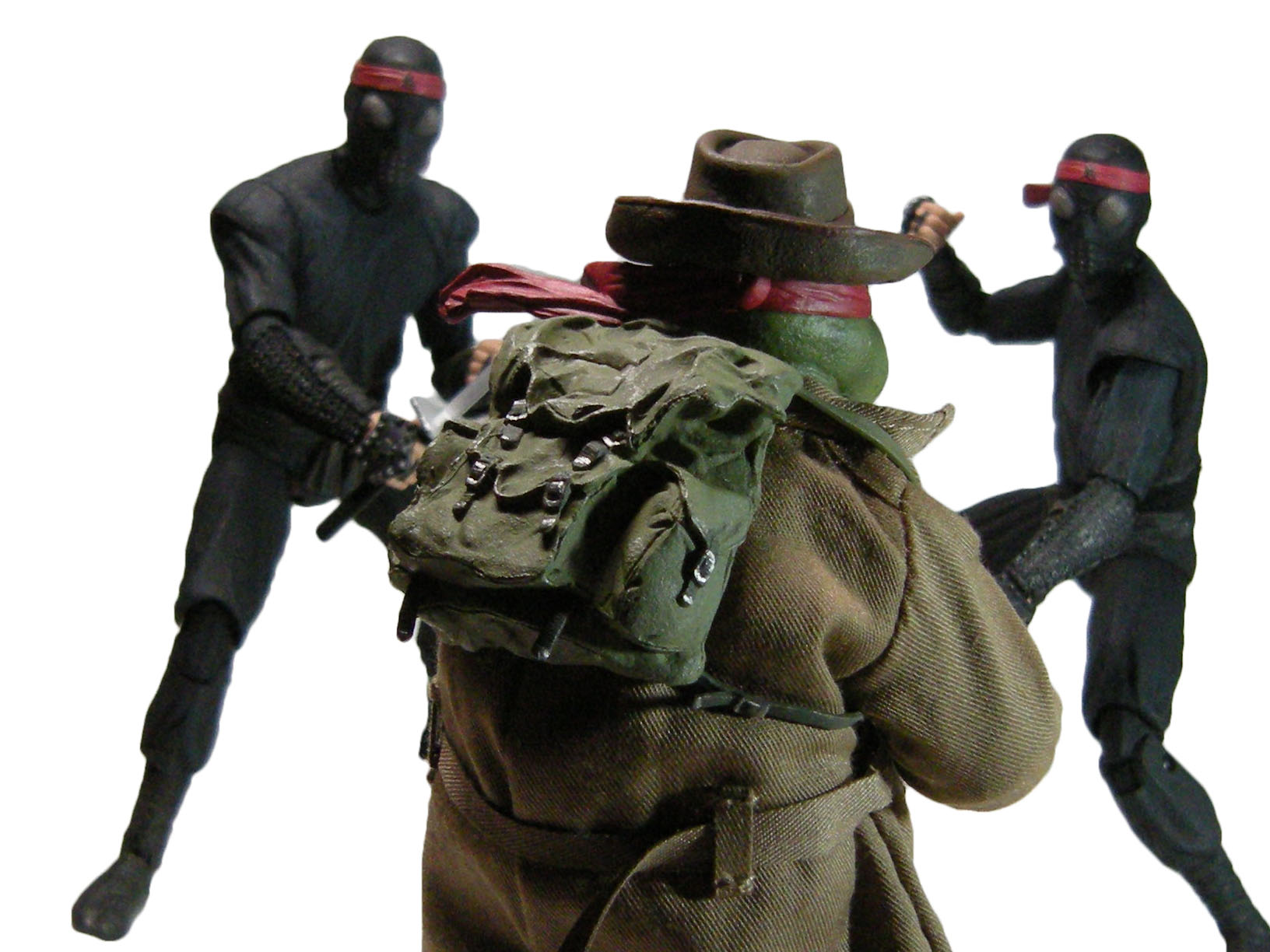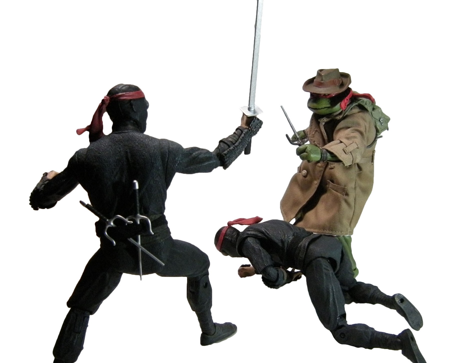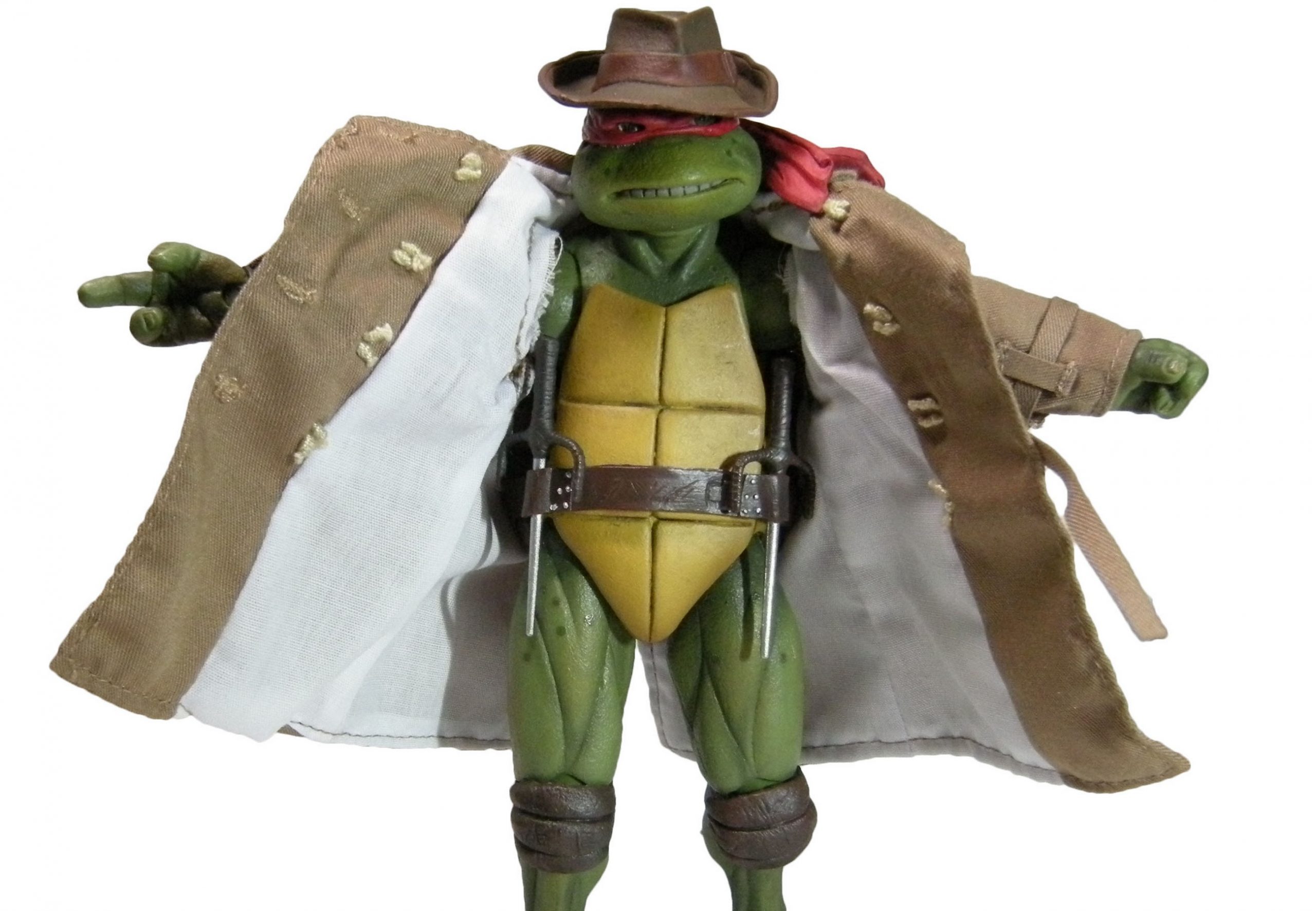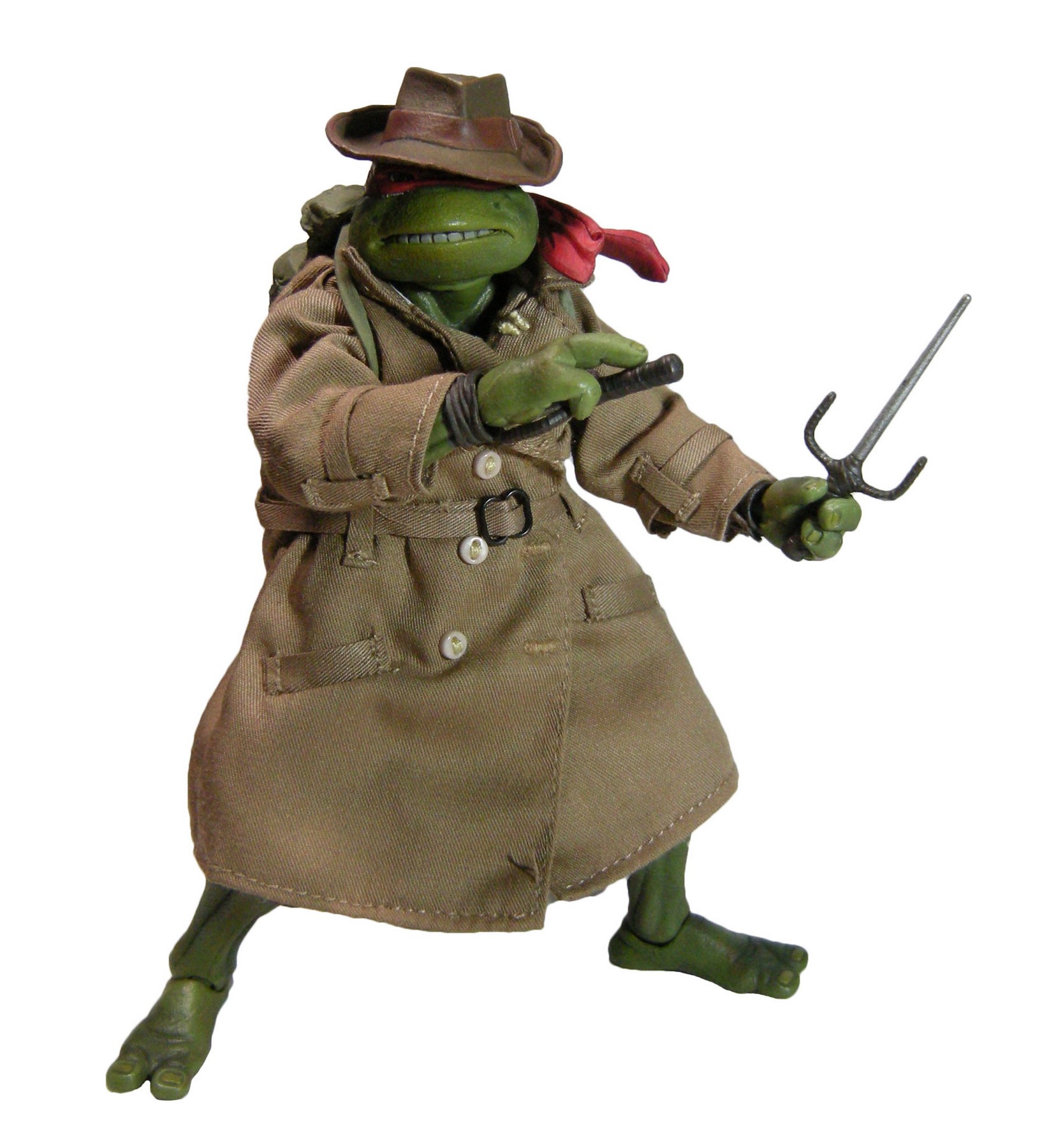 Si cette figurine de Raphael était identique à celle sortie précédemment, il fallait tout de même apporter quelques bonus pour rester attractive. Les fans n’allaient pas se contenter uniquement d’un trench-coat en tissu, un fedora et d’un sac. La tortue ne manque pas d’accessoires, c’est le moins que l’on puisse dire !