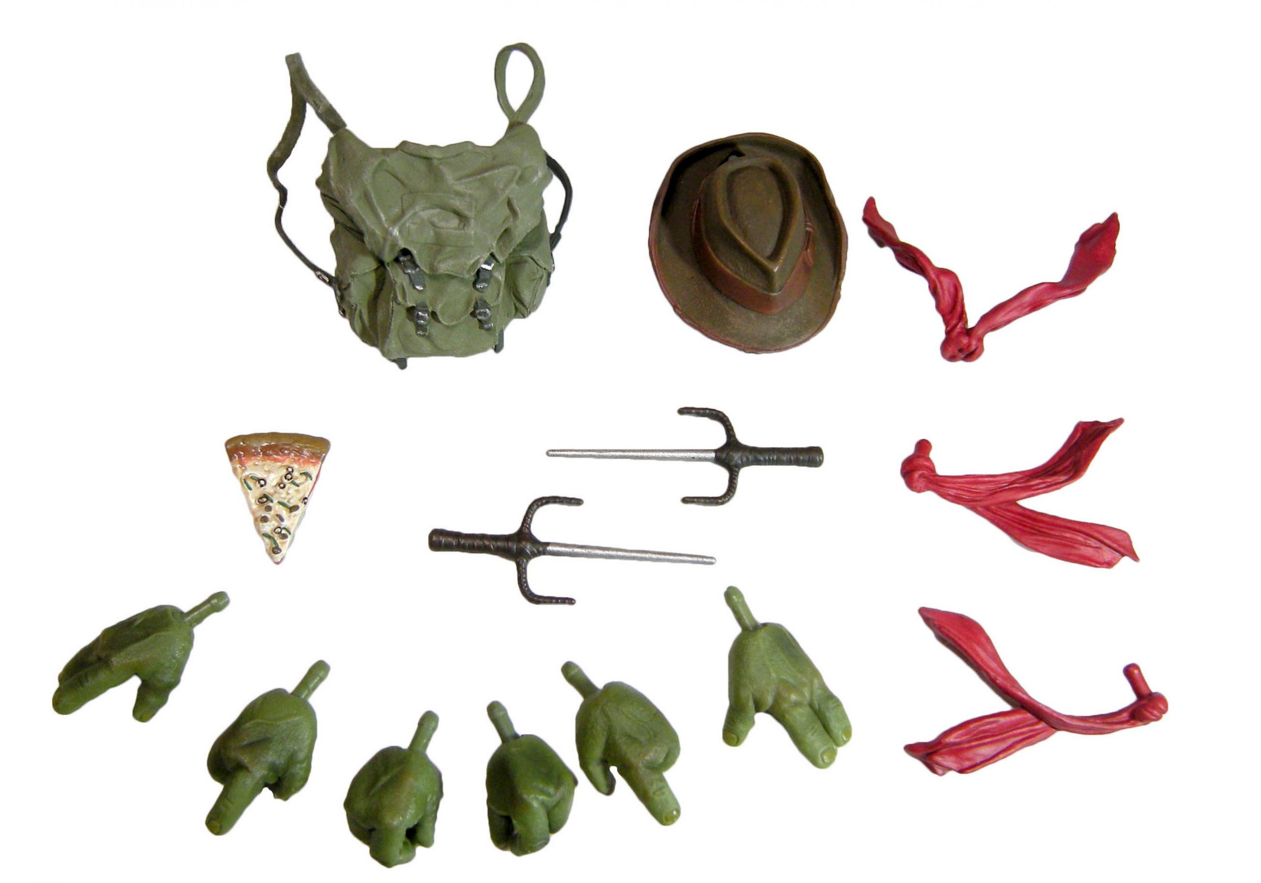 De la figurine régulière, nous retrouvons beaucoup d’accessoires. Deux bandeaux, la paire de saïs, la paire de mains classiques et une part de pizza. À ceux-ci, s’ajoutent deux paires de mains (non inédites) et un bandeau supplémentaire.