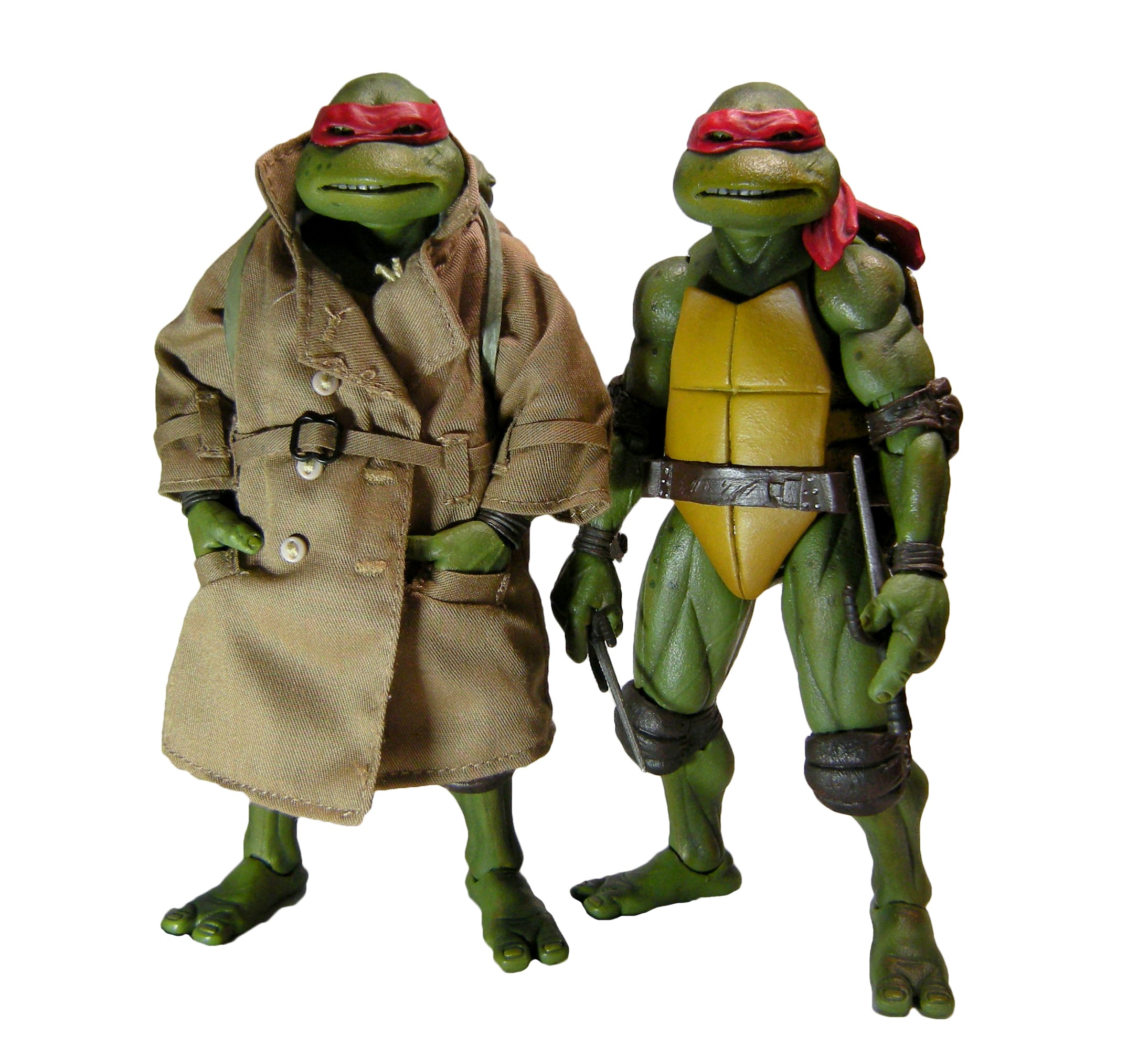 La peinture est l’un des très gros points forts de la gamme. La texture grumeleuse de la peau du personnage, en plus des variations du vert, confèrent un aspect caoutchouteux à la tortue, rappelant les costumes du film. Par ailleurs, la tortue est pourvue de nombreuses tâches noires parsemant son corps. Le paint job est relativement identique entre le Rapahel régulier et le Raphael in disguise.