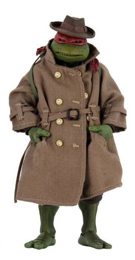 Cette figurine est l’exacte reproduction, en plus petit, de la version Raphael in disguise sortie chez NECA en 2018, au format Q Scale. Elle comporte cependant quelques petites différences, dues au format (à retrouver dans la section accessoires de cette review). La figurine était vendue en exclusivité chez Walmart en juin 2020, dans un double pack aux côtés de Casey Jones.