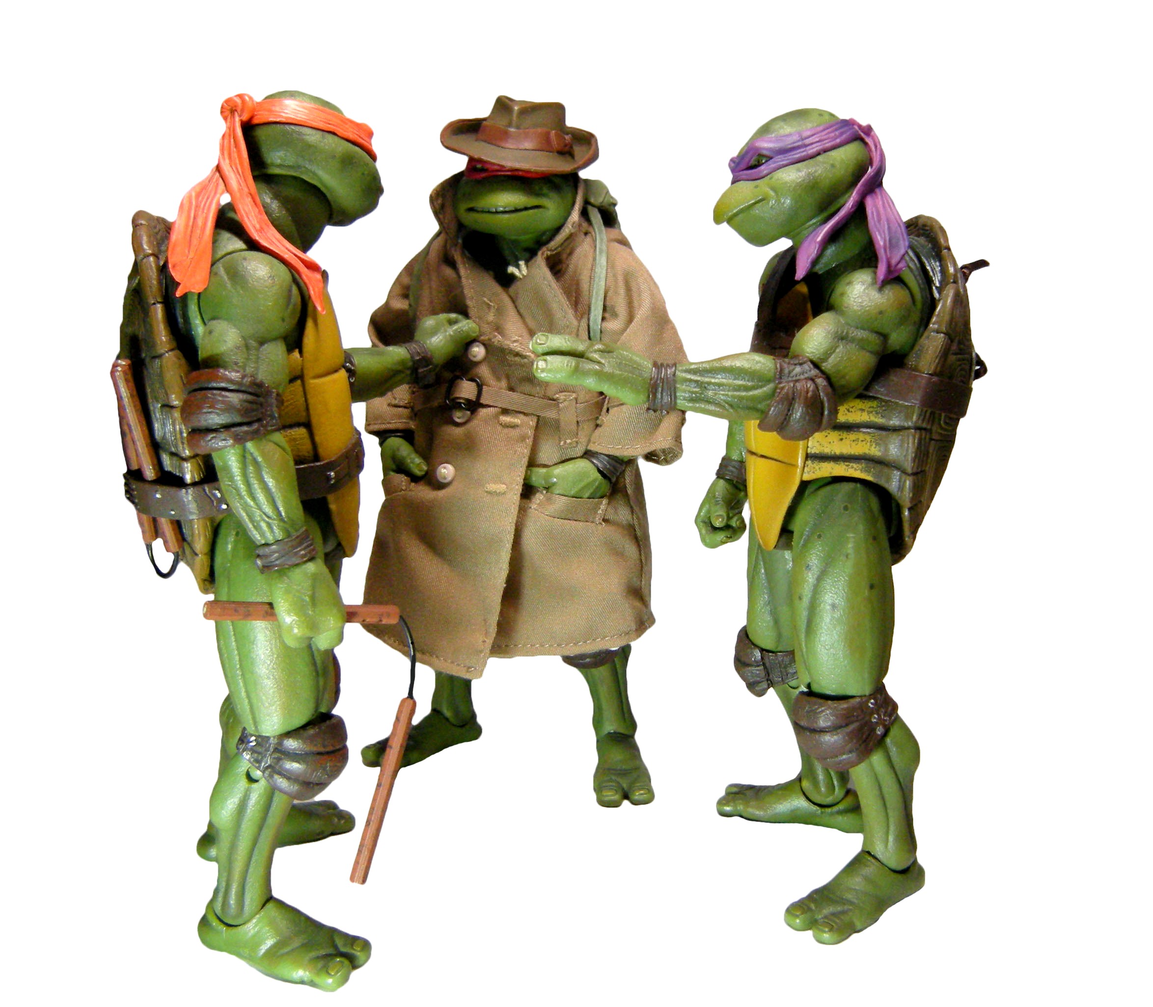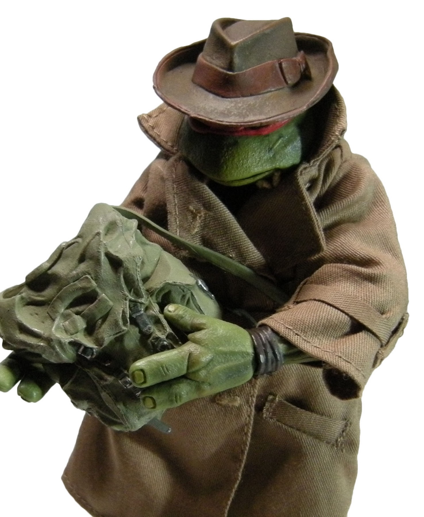 Pour le reste, la figurine fonctionne très bien. La tortue est accompagnée d’un grand nombre d’accessoires, notamment de mains permettant de varier les postures et surtout d’exploiter au mieux le manteau. Celui-ci aurait pu être plus fin pour le rendre plus réaliste. C’est le grand reproche que je fais aux figurines possédant des vêtements. Généralement ceux-ci sont trop épais, faute à l’échelle, ce qui enlève du côté réaliste recherché. Malgré tout, les coutures sont belles, le manteau est de qualité et les détails sont présents. On aurait pu espérer par exemple des boutons mieux finis, comme ceux de la version Q Scale. Mais ce n’est qu’un détail auquel on fini par ne plus y penser une fois la tortue en main.