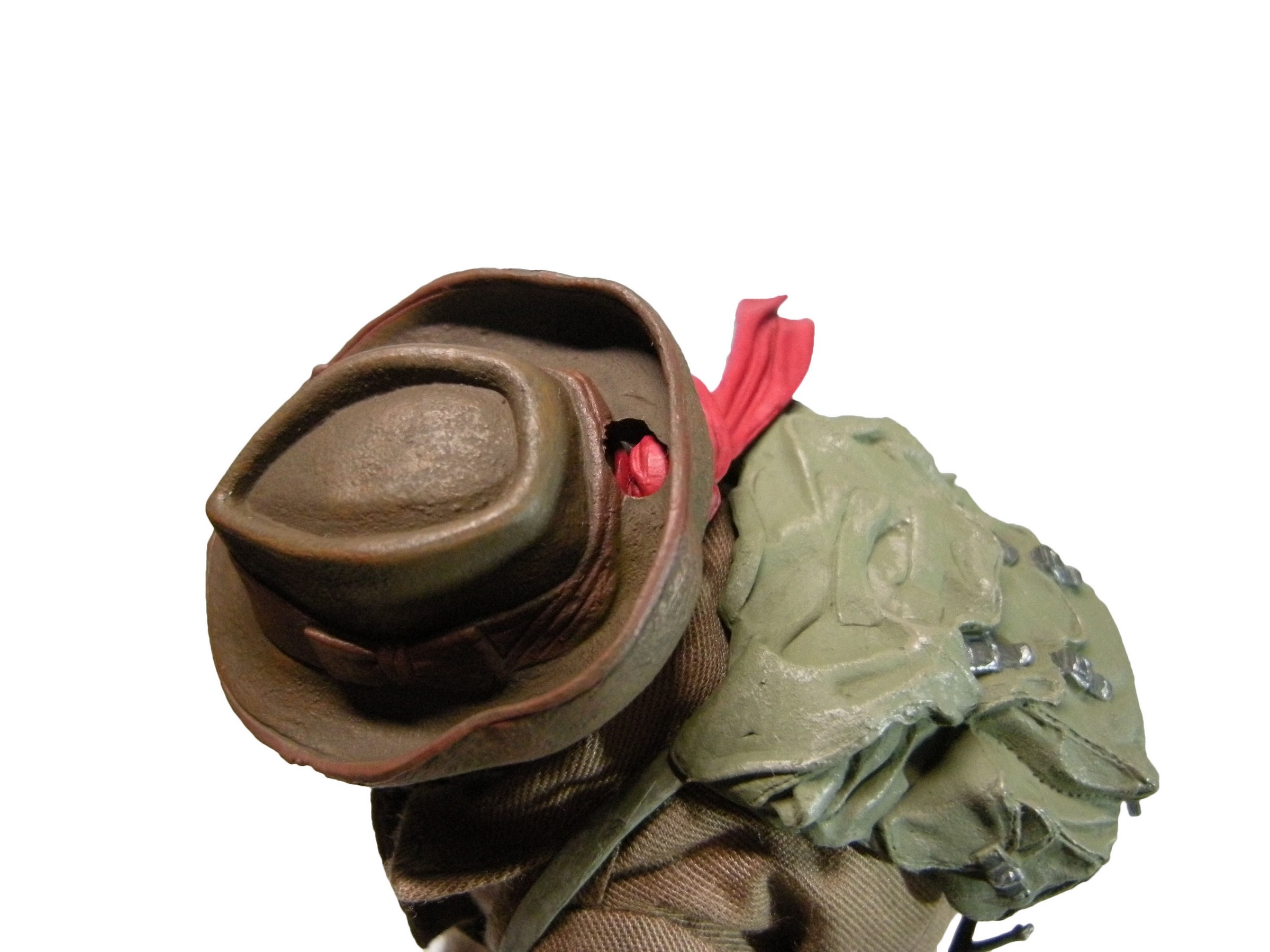 Le Fedora épouse la tête de la tortue, permettant soit de l’enfoncer et cacher les yeux, soit le lever légèrement. Cette possibilité offre différents rendus au visage de la tortue. Les jeux d’ombres sont alors excellents ! La lanière est sculptée à même le chapeau et ne peut être retirée. À l’arrière, un trou est taillé pour permettre de fixer le chapeau sans être gêné par le nœud du bandeau de Raphael. C’est un détail que j’adore, car le chapeau de la tortue est exactement comme ça dans le film ! Lorsque la tortue sort du cinéma, on voit le nœud rouge dépasser de l’arrière du chapeau. Vous pouvez également ne pas mettre de bandeau à la tortue !