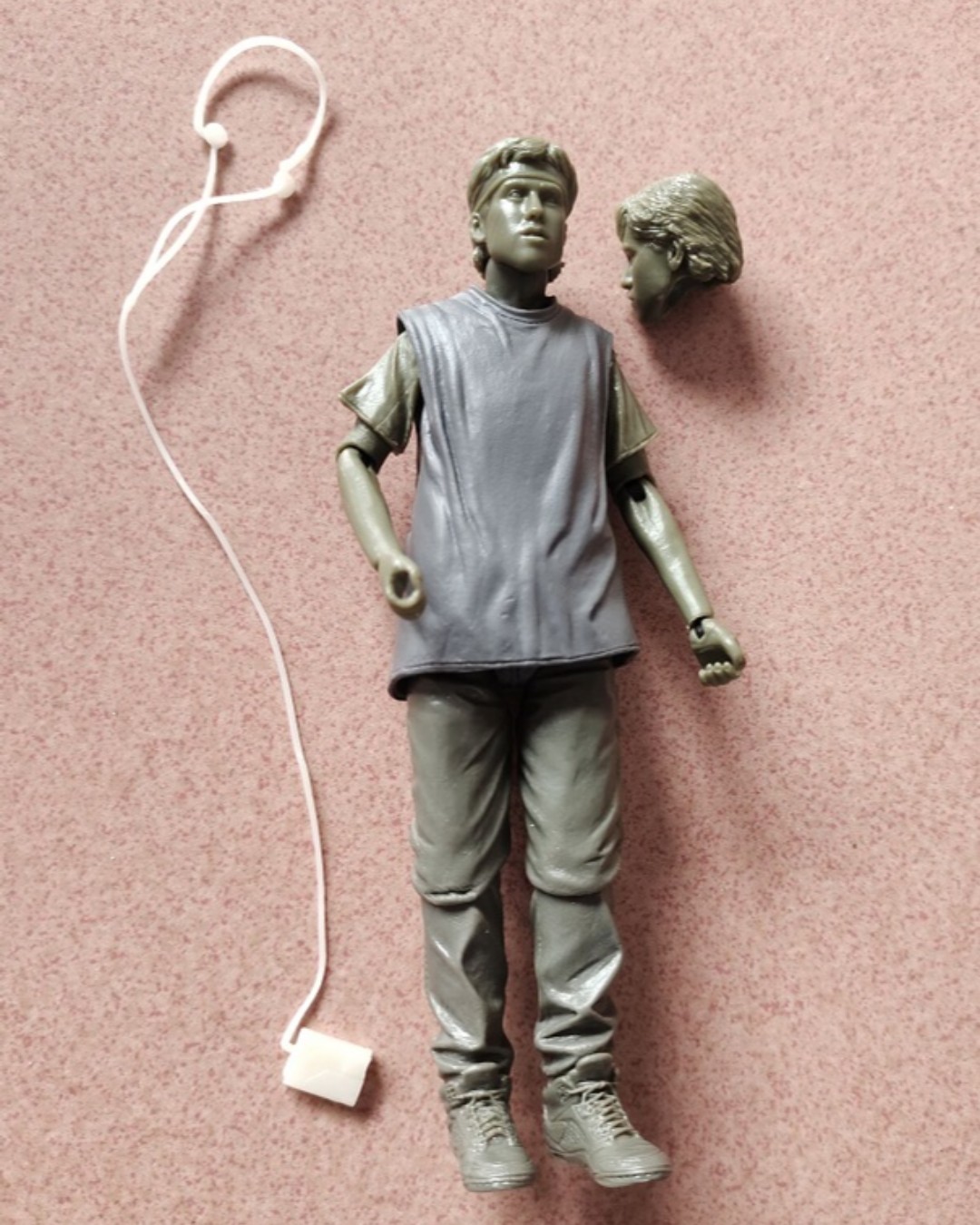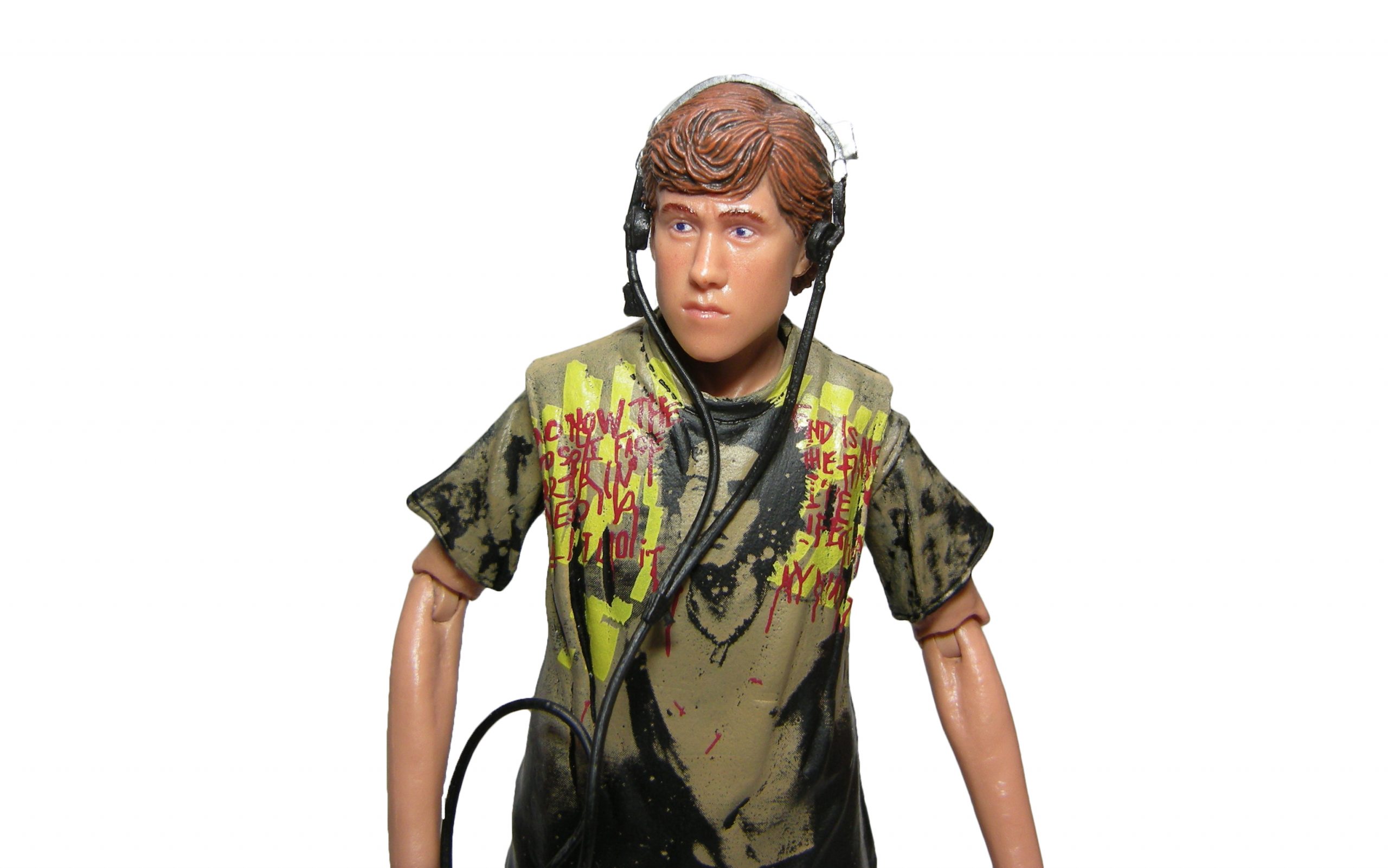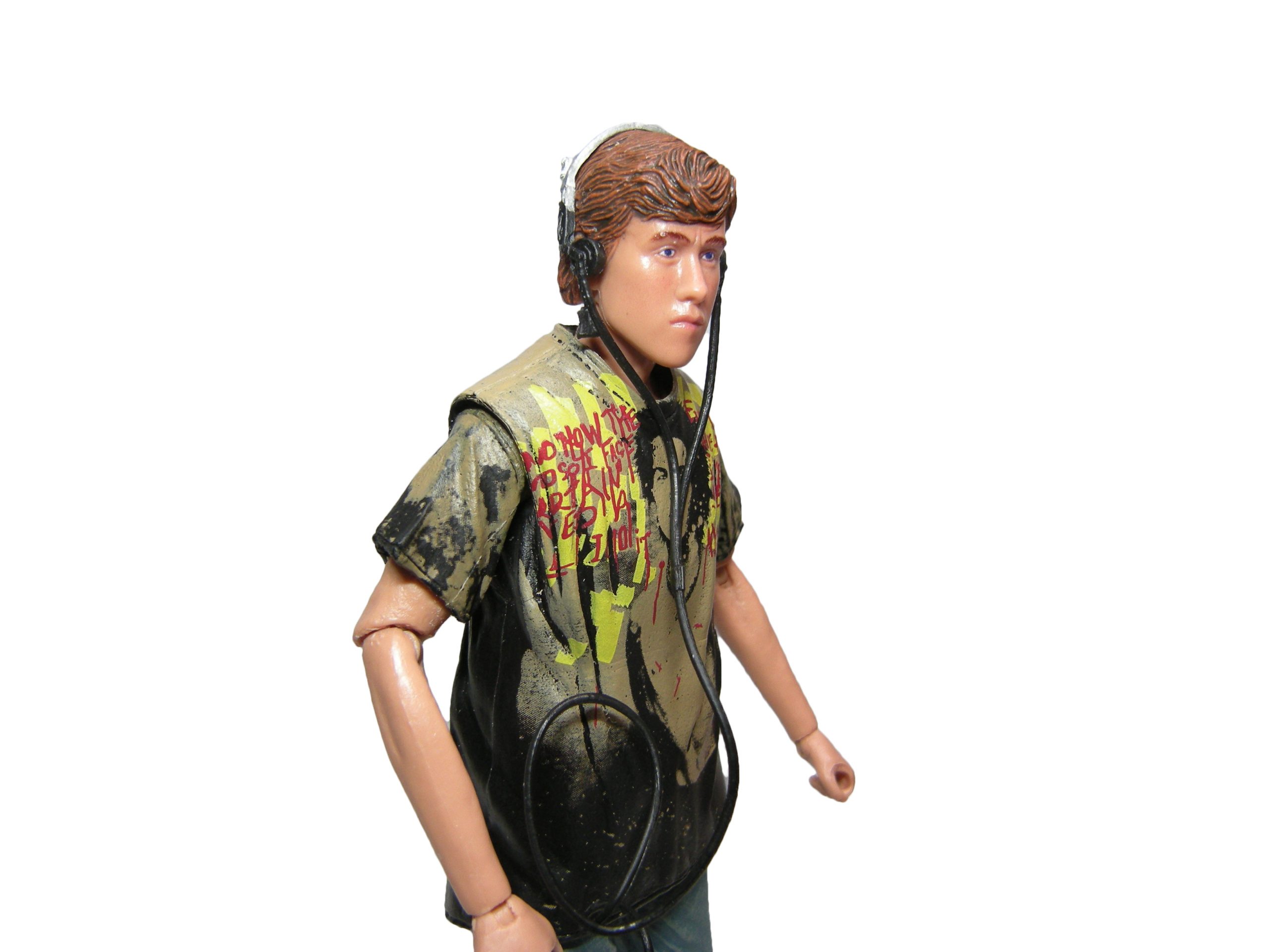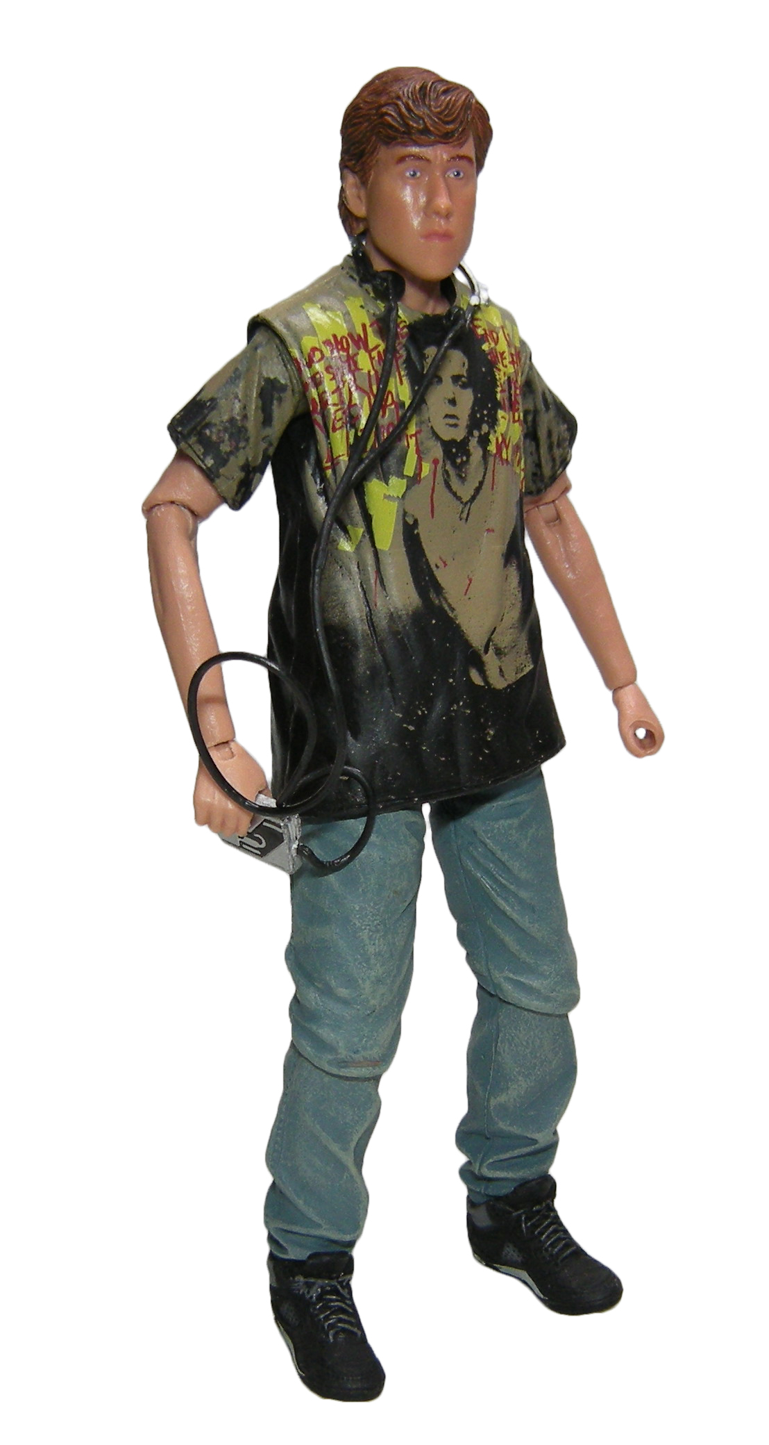 L’autre accessoire est le walkman. L’objet est entièrement moulé dans un plastique extrêmement souple. Si souple qu’il est roulé en boule dans le blister et a pris de mauvais plis… Pas très pratique. La meilleure solution pour le démêler est l’eau chaude. Il retrouvera sa bonne forme. Placez le casque sur la tête de Danny pour qu’il conserve la forme voulue au refroidissement. Hélas, il n’est pas très simple à fixer sur la tête de la figurine.
