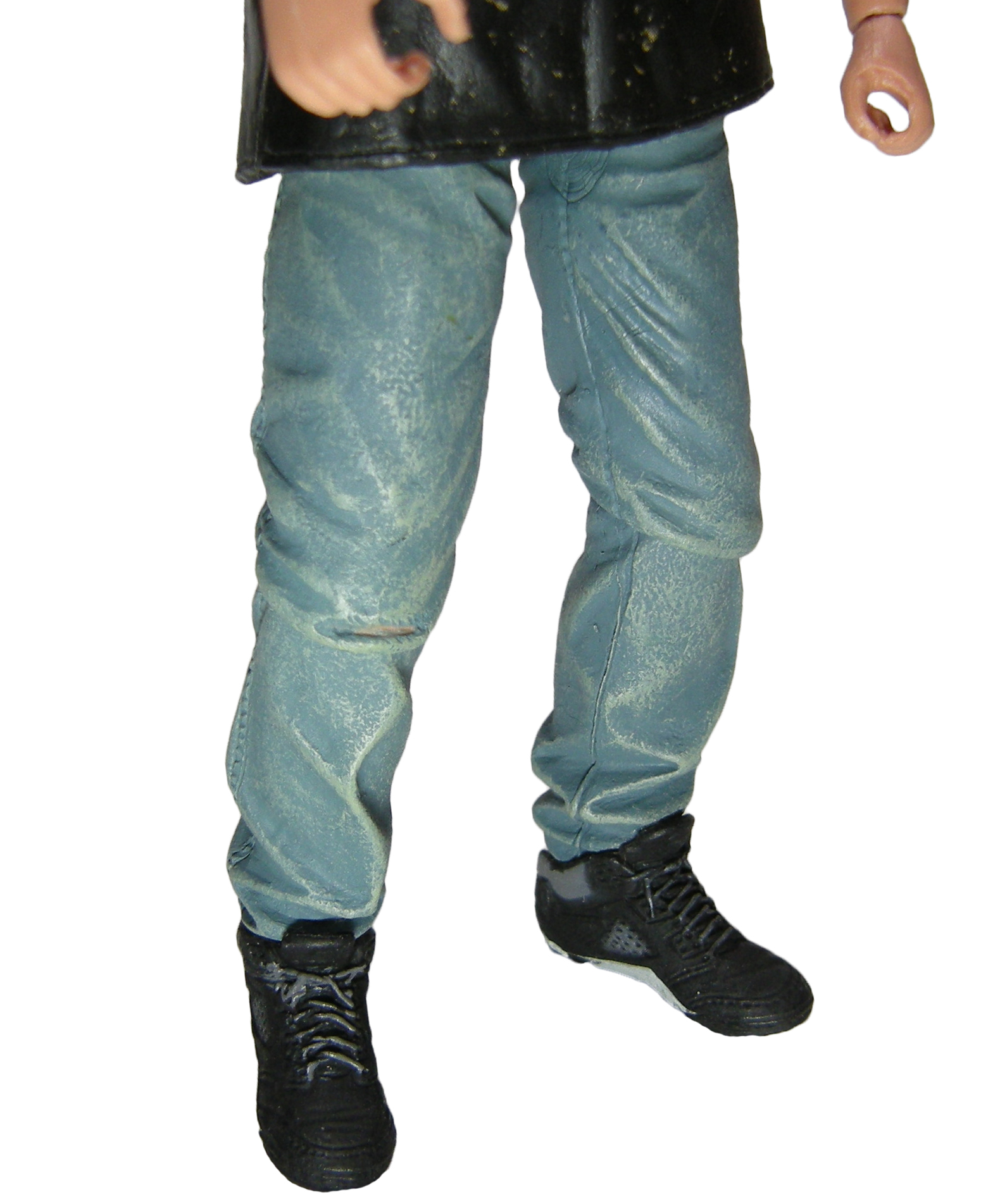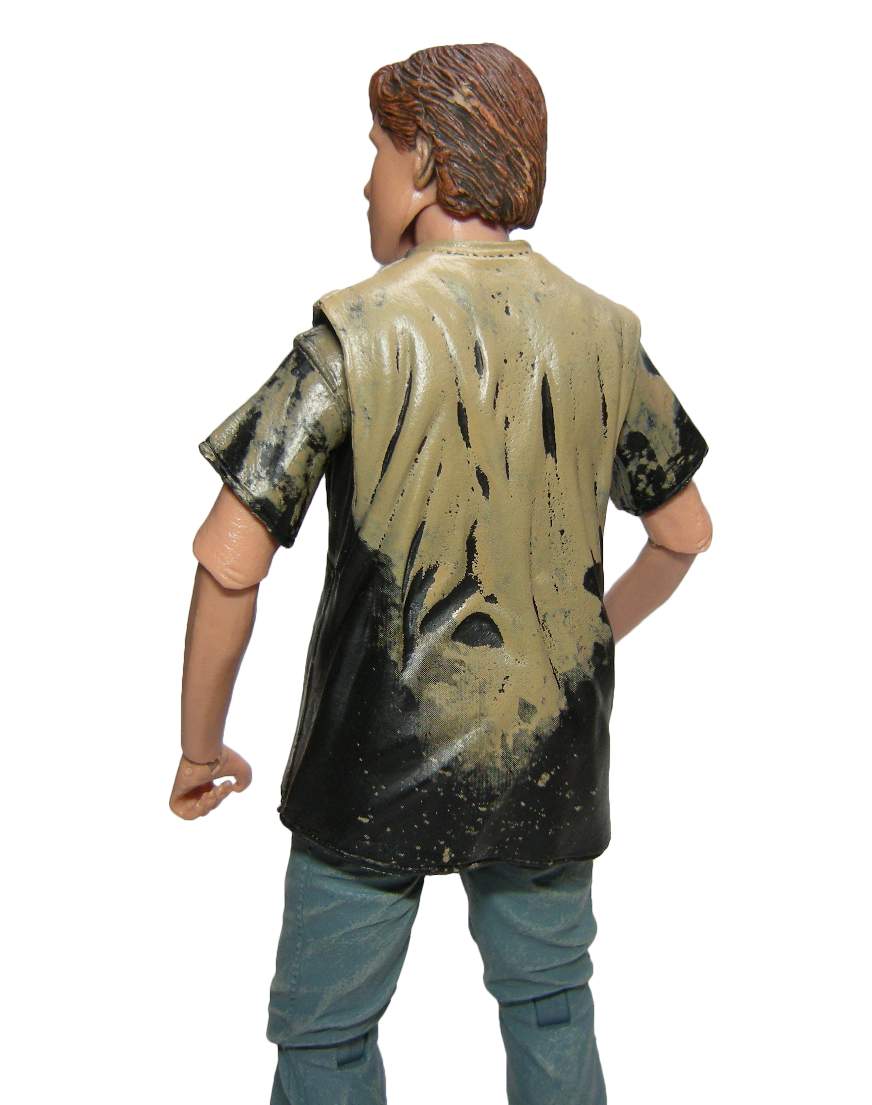 La sculpture de la figurine est très simple. Il s’agit d’ailleurs en partie d’une reprise d’ancienne sculpture, celle de John Connor pour la licence Terminator 2. C’est le cas des jambes, certainement du buste (caché par le t-shirt) et de la paire de mains. Et cela pose d’amblé un gros problème, celui de l’échelle ! Danny est beaucoup trop petit ! John Connor était plus jeune que Danny dans son film, et donc plus petit. Ici, Danny devrait être presque de la taille d’April. Ce n’est pas vraiment le cas… Sa figurine mesure 14 cm, contre 18 cm pour la jeune femme. Et à cette échelle, la différence est colossale.