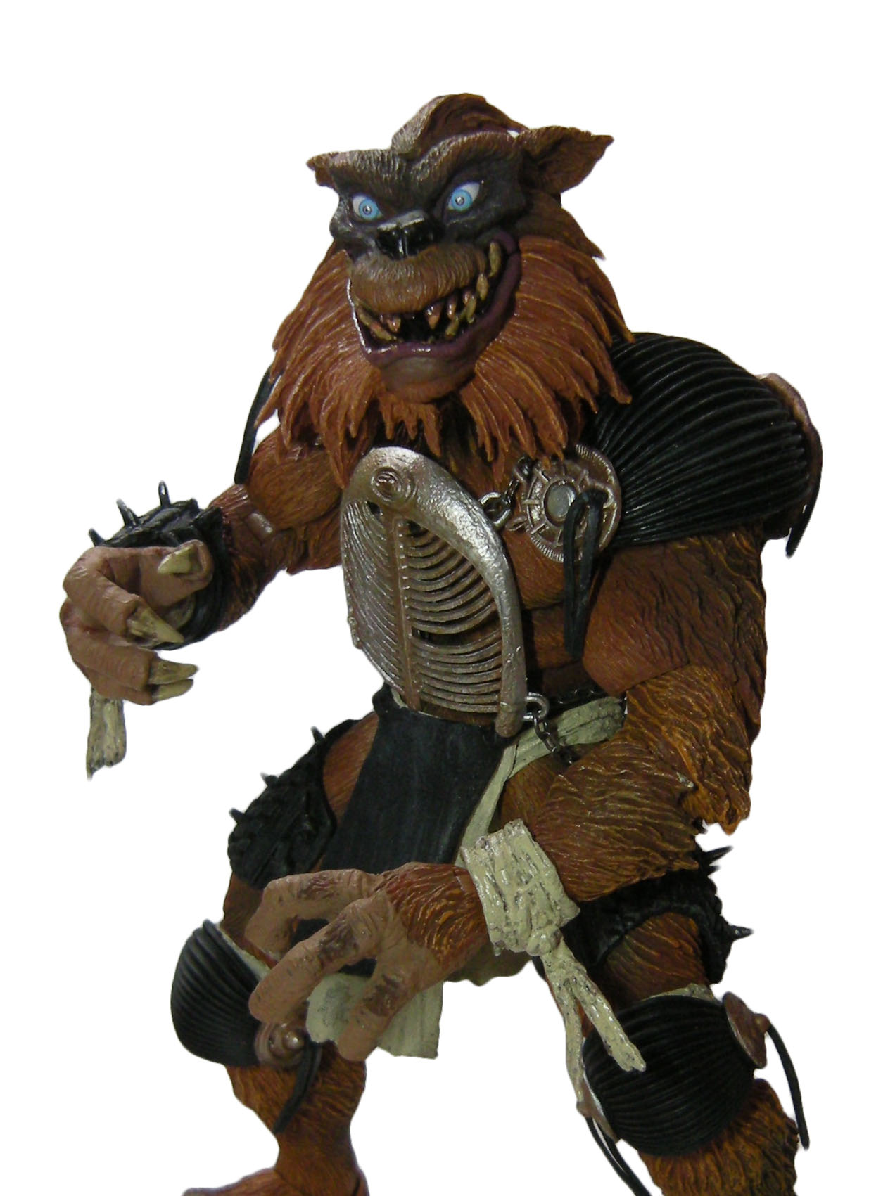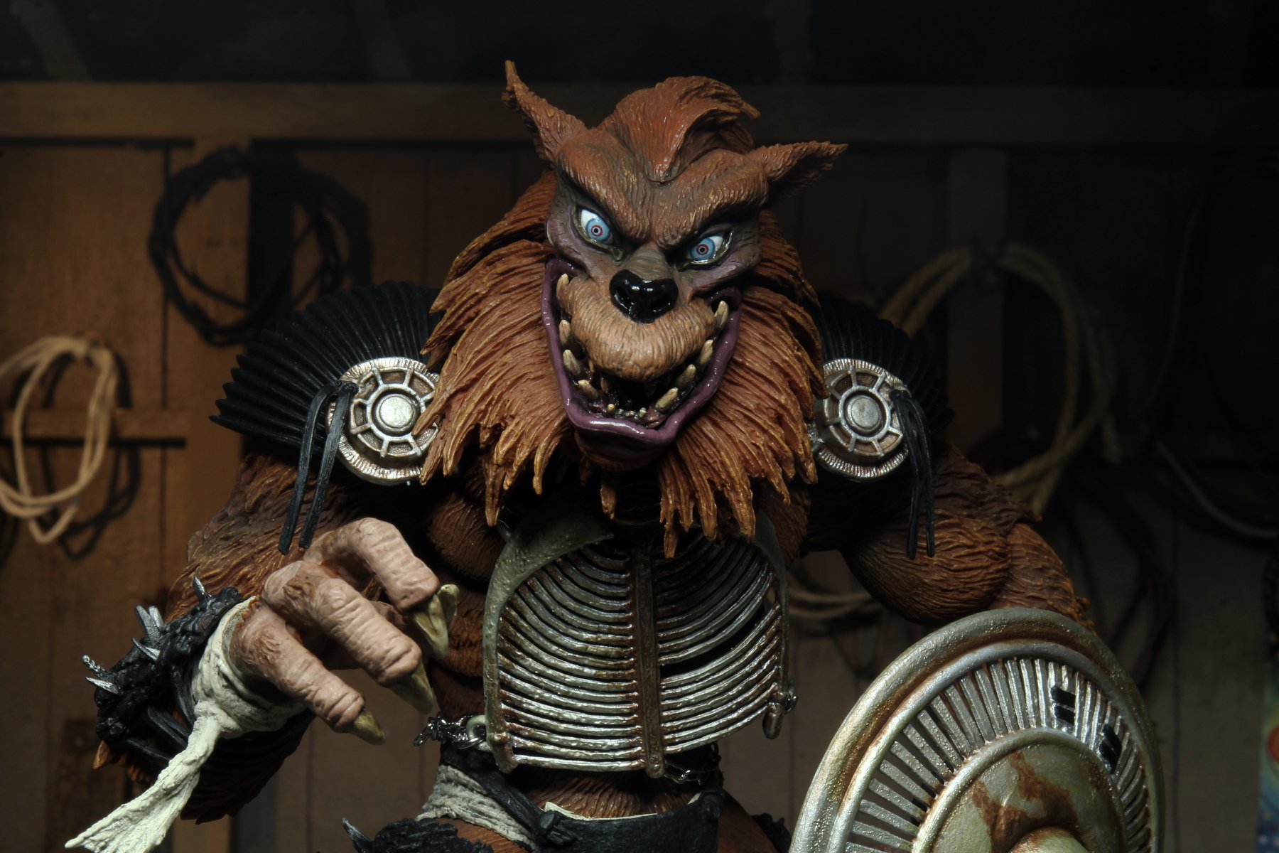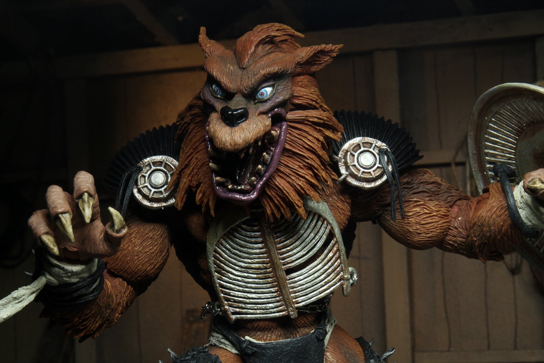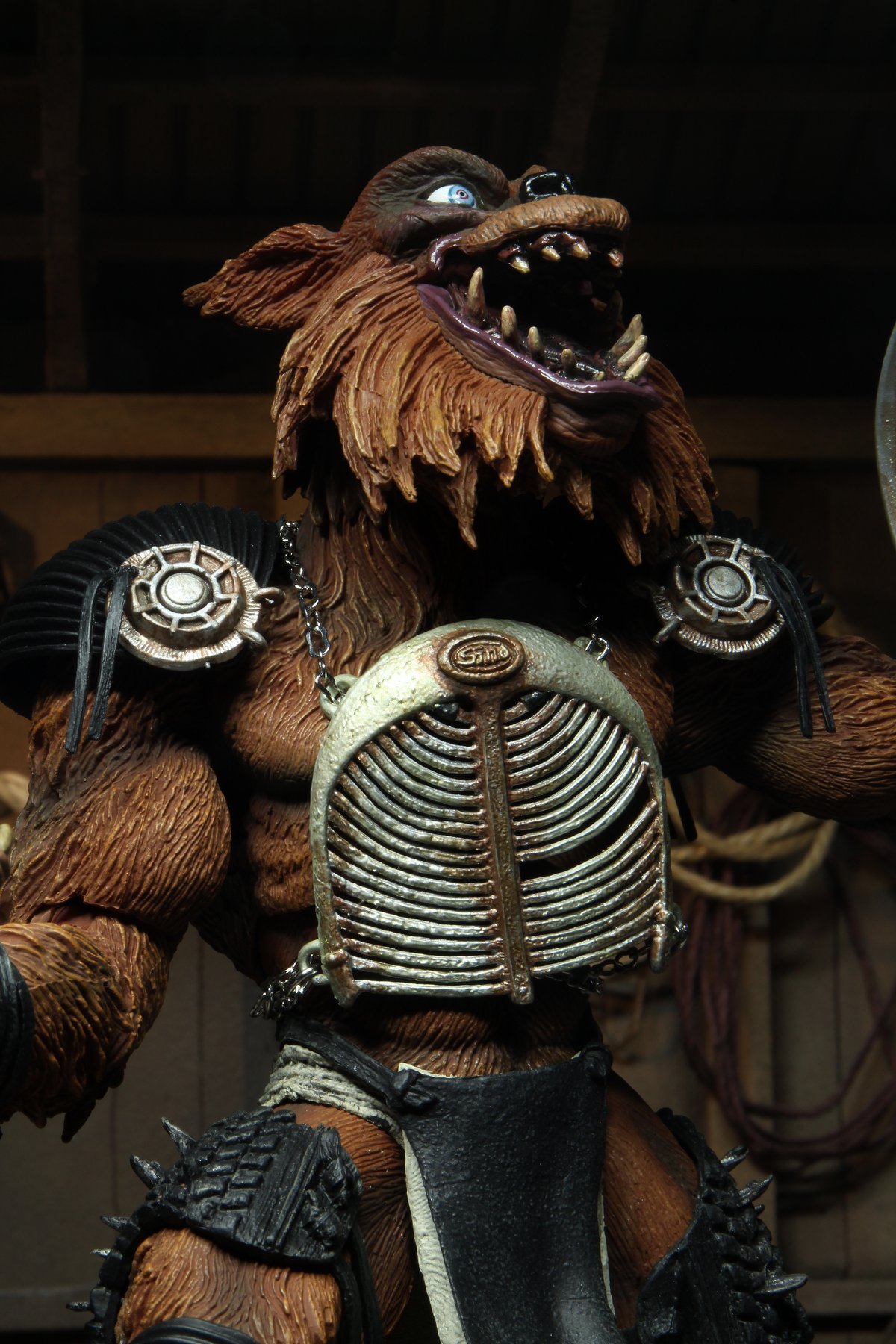 Une fois encore, c’est une très grande réussite pour NECA. Jamais encore nous n’avions eu un Rahzar aussi bien réalisé. Il n’est certes pas aussi réaliste que Tokka, l’absence de vraie fourrure y est pour beaucoup hélas. Mais en dehors de ça, le résultat final est tout simplement superbe. Le détail des finitions de Rahzar fait de cette figurine une œuvre d’art. Je m’emporte ? Peut-être un peu. Mais le travail sur son pelage et la peinture qui vient compléter le tout est génial. L’expression du visage, bien que plus statique que celle de Tokka est très bonne. Mon seul regret est l’impossibilité de retirer l’armure du loup. Je pense que c’est surtout pour des raisons techniques, et ça se comprend finalement.
