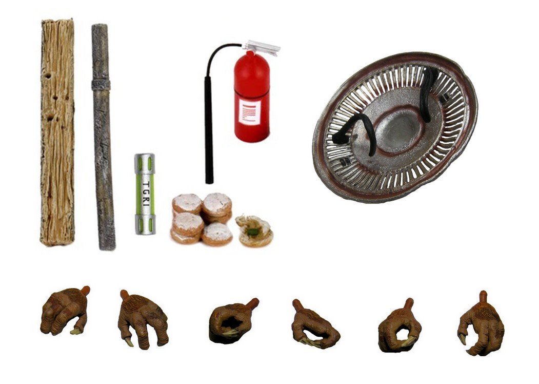 Les figurines sont accompagnées dans ce pack de deux « armes », un tuyau et un morceau de bois. Le tuyau est celui qu’utilise Rahzar pour frapper Tokka sur la tête, au moment où Shredder discute de les tuer avec le professeur Perry, car trop stupides. Le morceau de bois est un demi-rondin, renvoyant peut-être aux poteaux électriques détruits par les deux mutants lors du saccage d’une rue pour provoquer les tortues.