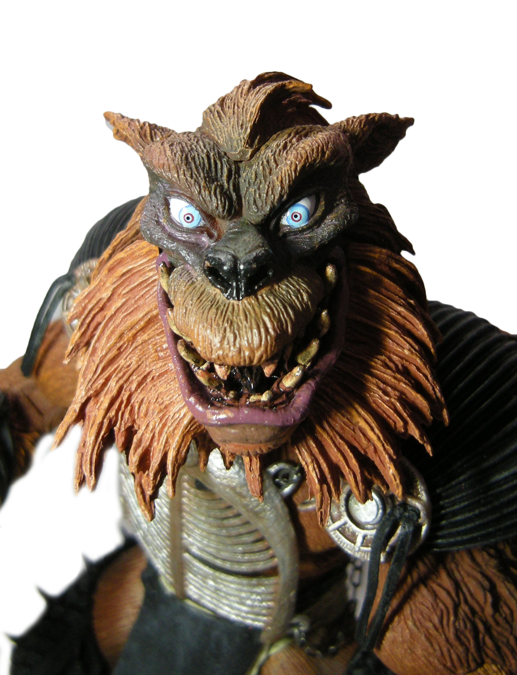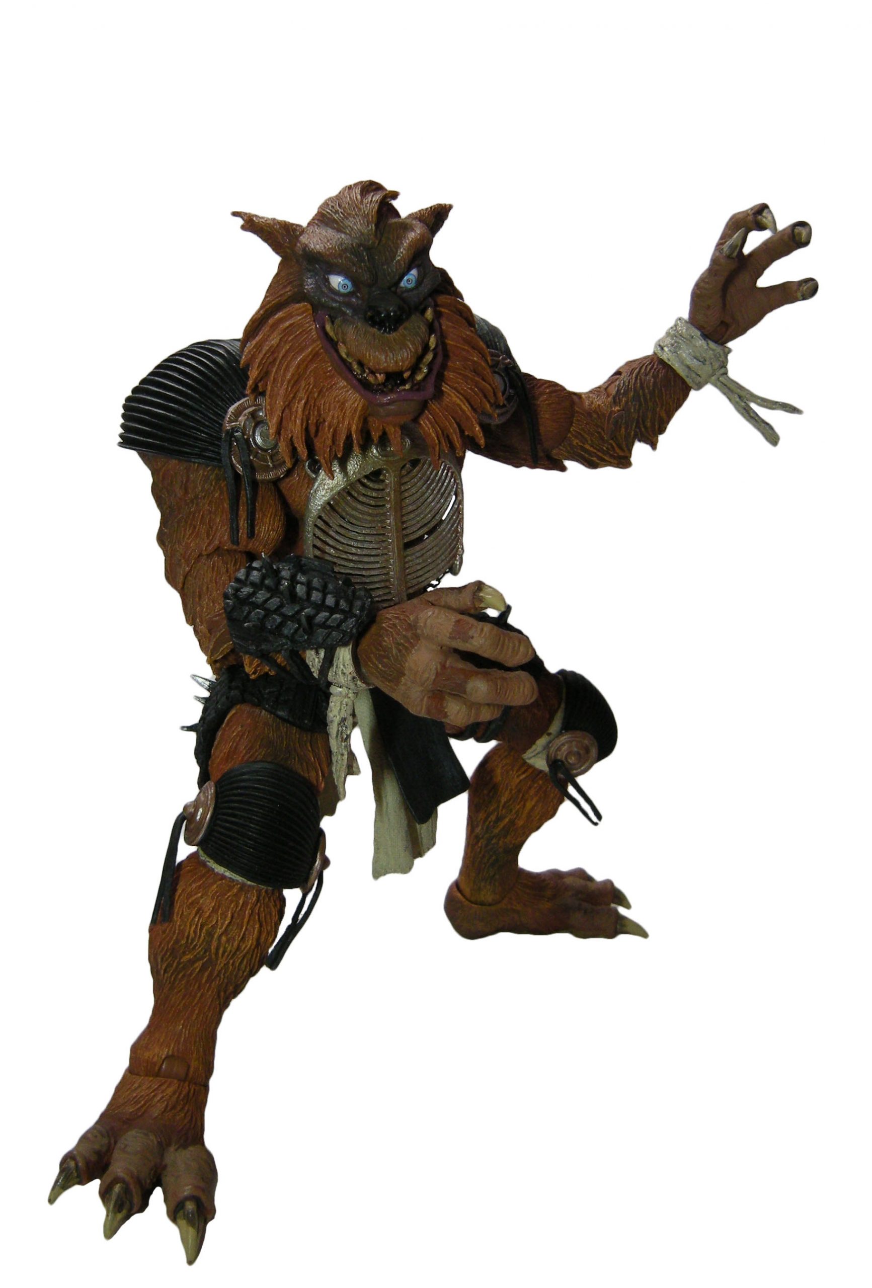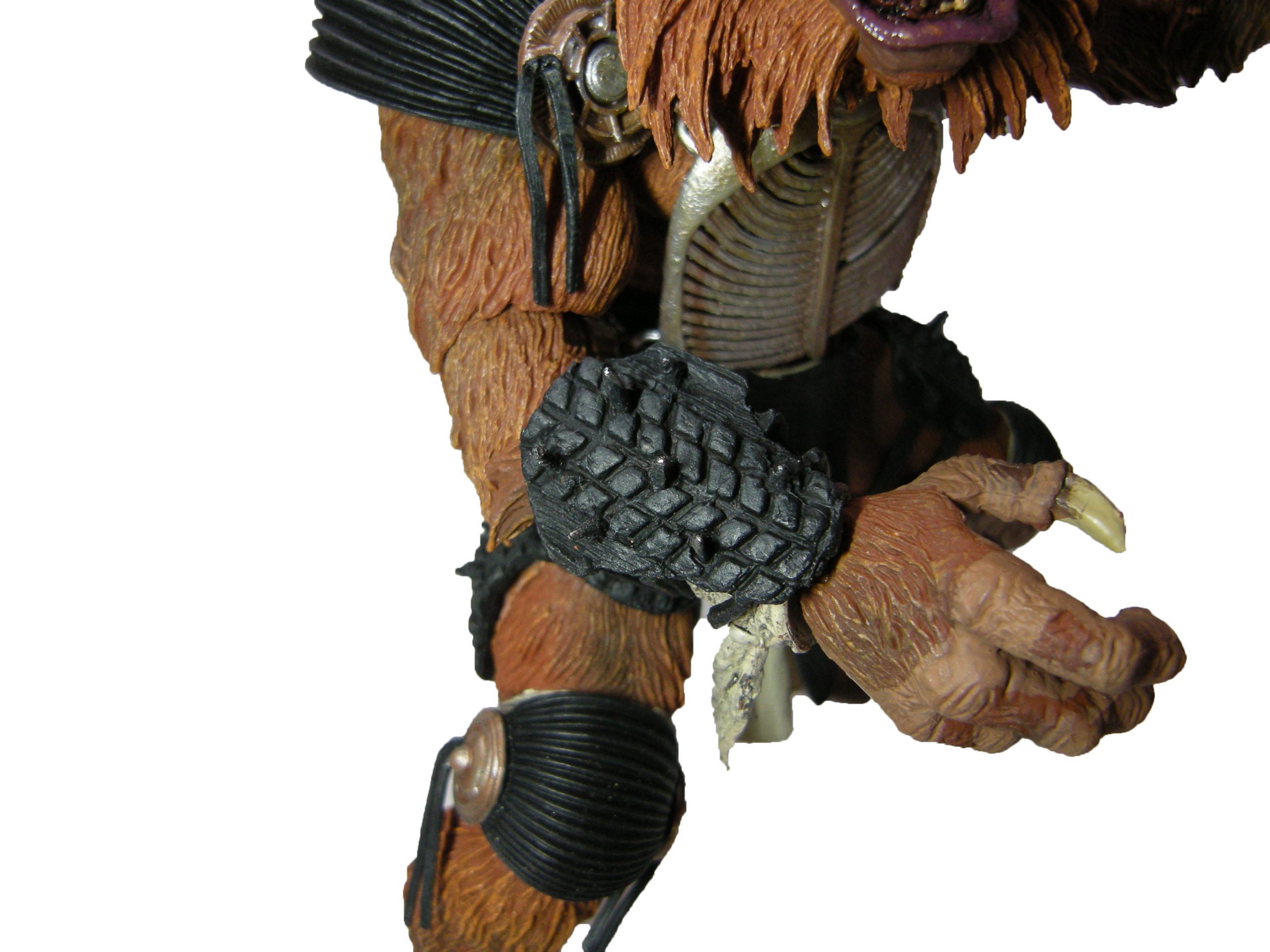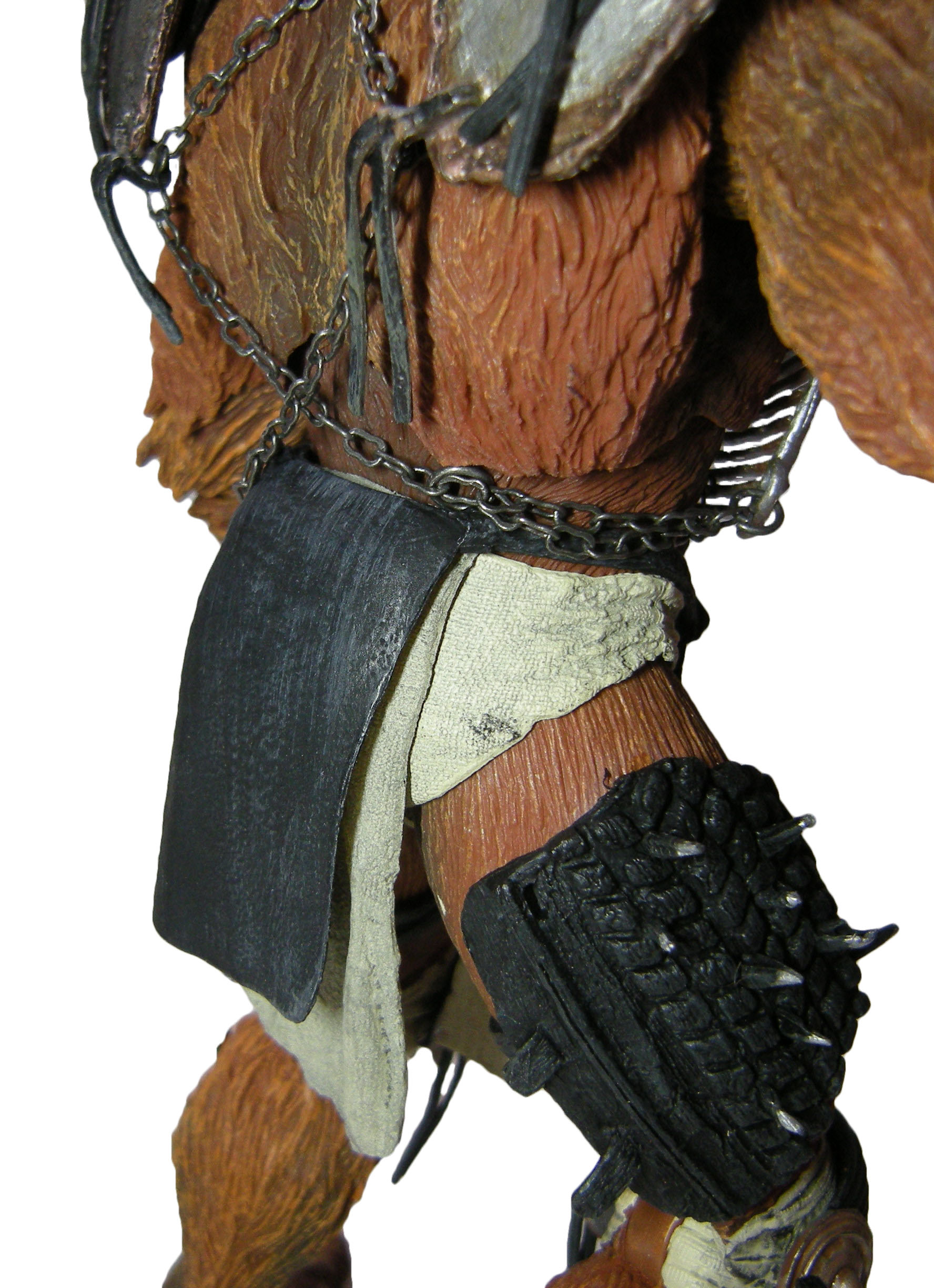 Là encore, le travail de NECA est excellent. Les artistes ne se sont pas contentés de faire un bête brossage sur les poils afin de leur donner du volume en alternant une teinte claire sur une base sombre. On retrouve en effet des effets de profondeur, à l’aide d’un brun plus sombre, permettant d’accentuer les reliefs de la musculature du loup. Cela se voit au niveau des jambes, des bras, mais aussi de sa poitrine. Et c’est vraiment dommage que l’armure ne se retire pas. Cela permettrait de vraiment mettre en avant ce très beau travail. Une fois encore, bien sûr ce ne sont pas de vrais poils, et ça donne un effet plastique au personnage, là où Tokka frôle le réalisme. Mais le rendu est tout simplement plaisant à l’œil !