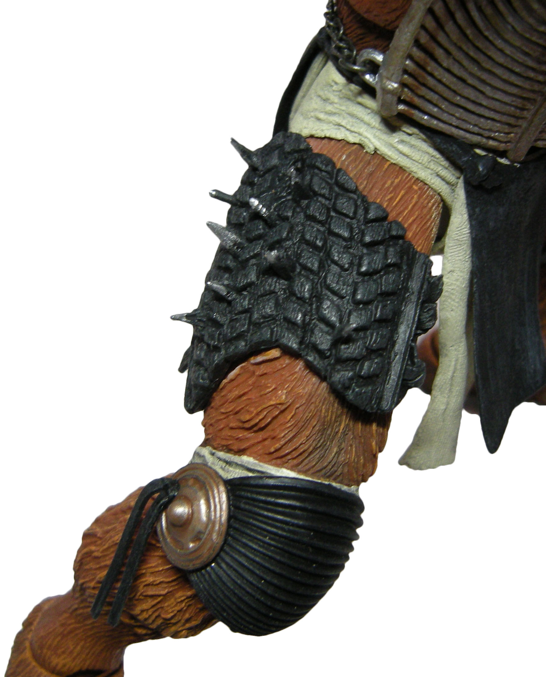 Le travail sur les détails des textiles est impressionnant. Les fibres ont été sculptées au niveau du pagne et des genoux ! On ne retrouve malheureusement pas le même traitement sur les tissus aux poignets du loup.  Avec la peinture, ces derniers donnent un aspect grossier. Peut-être le détail le moins soigné de la figurine.