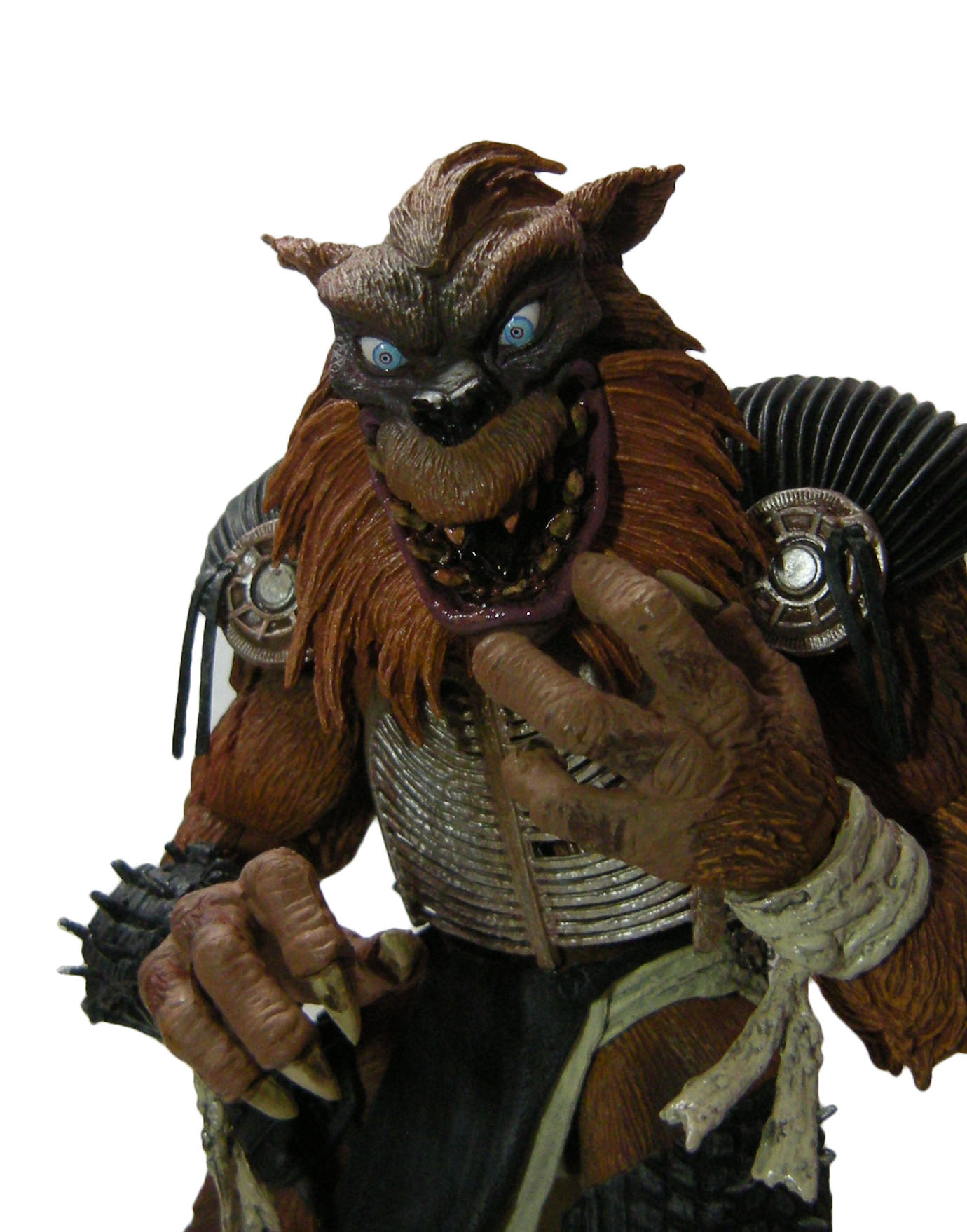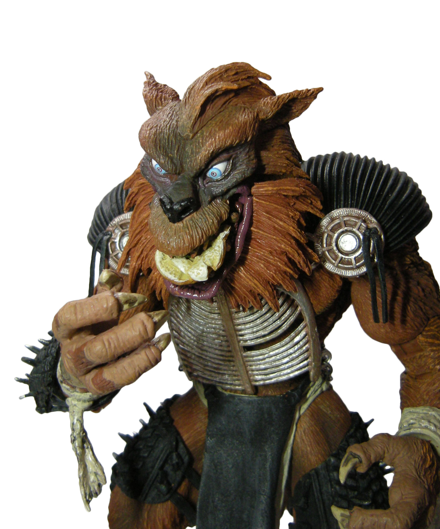 Chez Rahzar, seule la mâchoire est articulée, permettant d’ouvrir et de fermer la bouche. À celle-ci s’ajoute deux points d’articulations, à la nuque et à la base du cou, ce qui est amplement suffisant. En revanche, du fait de la présence de poils sculptés à même le plastique autour de la mâchoire du loup, il est impossible de lui faire ouvrir la gueule tout en tournant la tête en direction des épaules. Le plastique butte contre les épaulettes, fermant sa gueule.