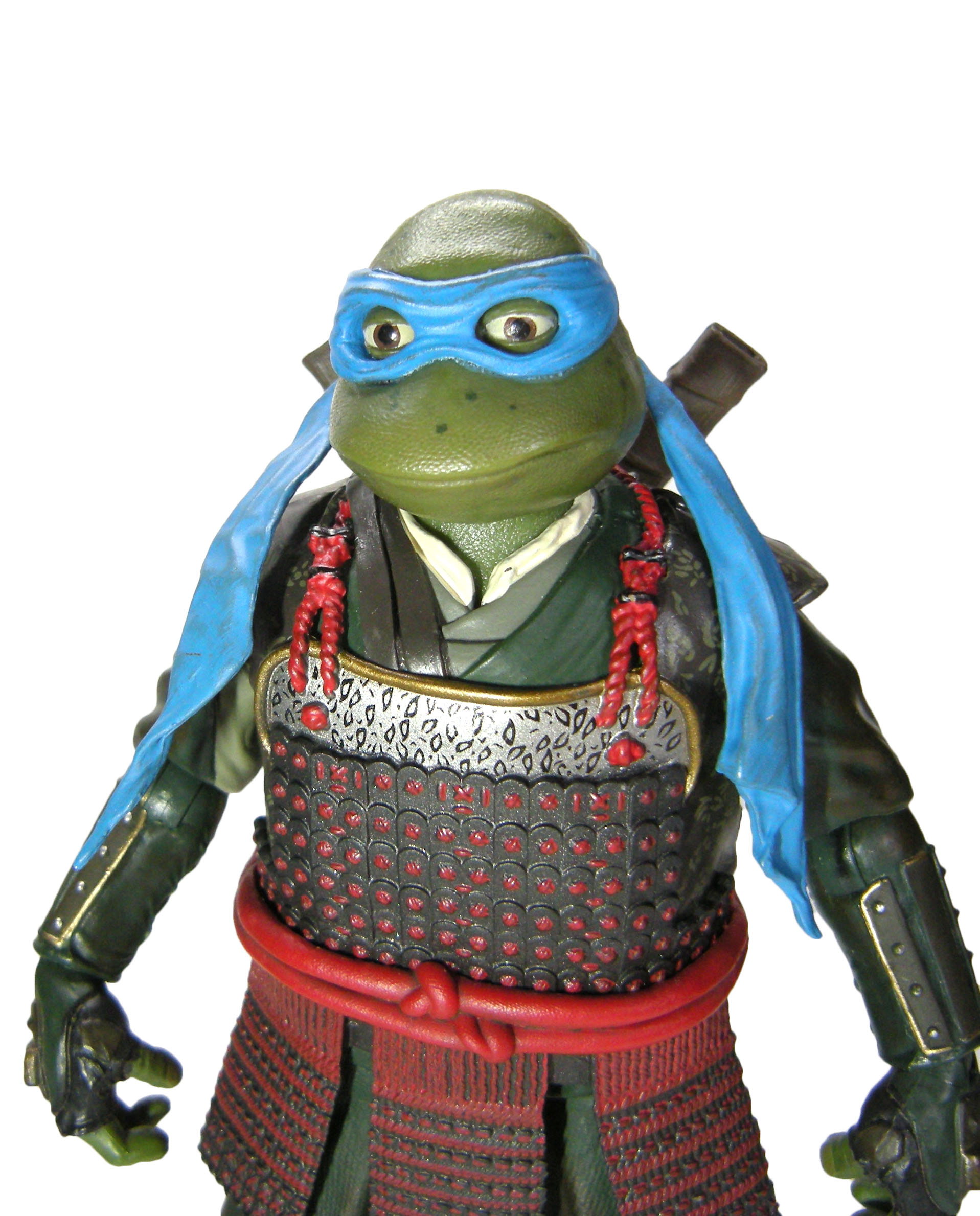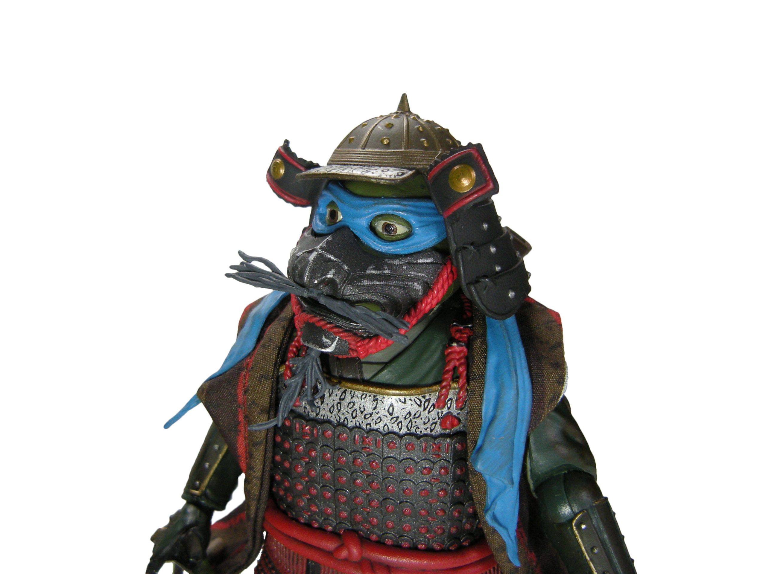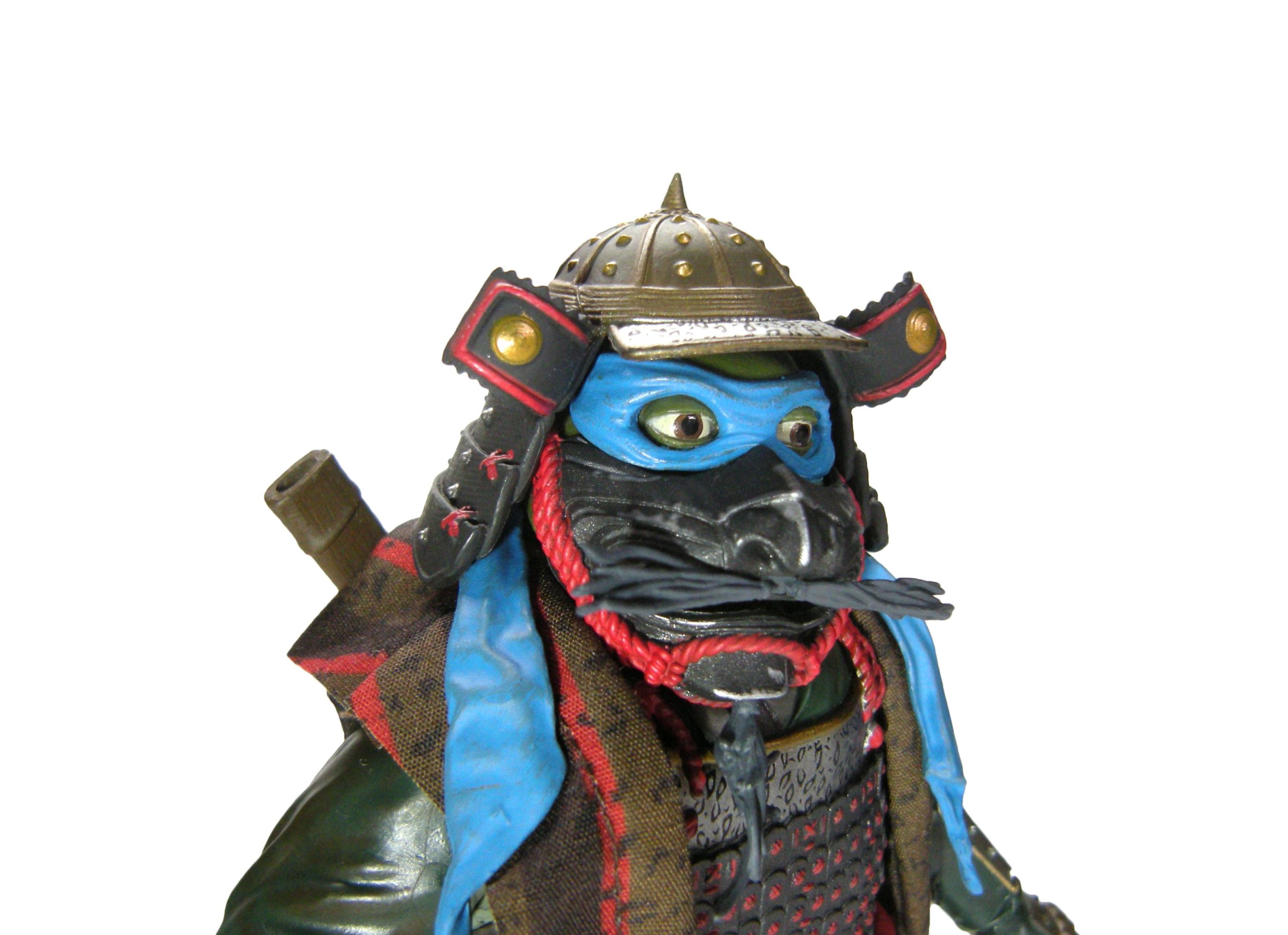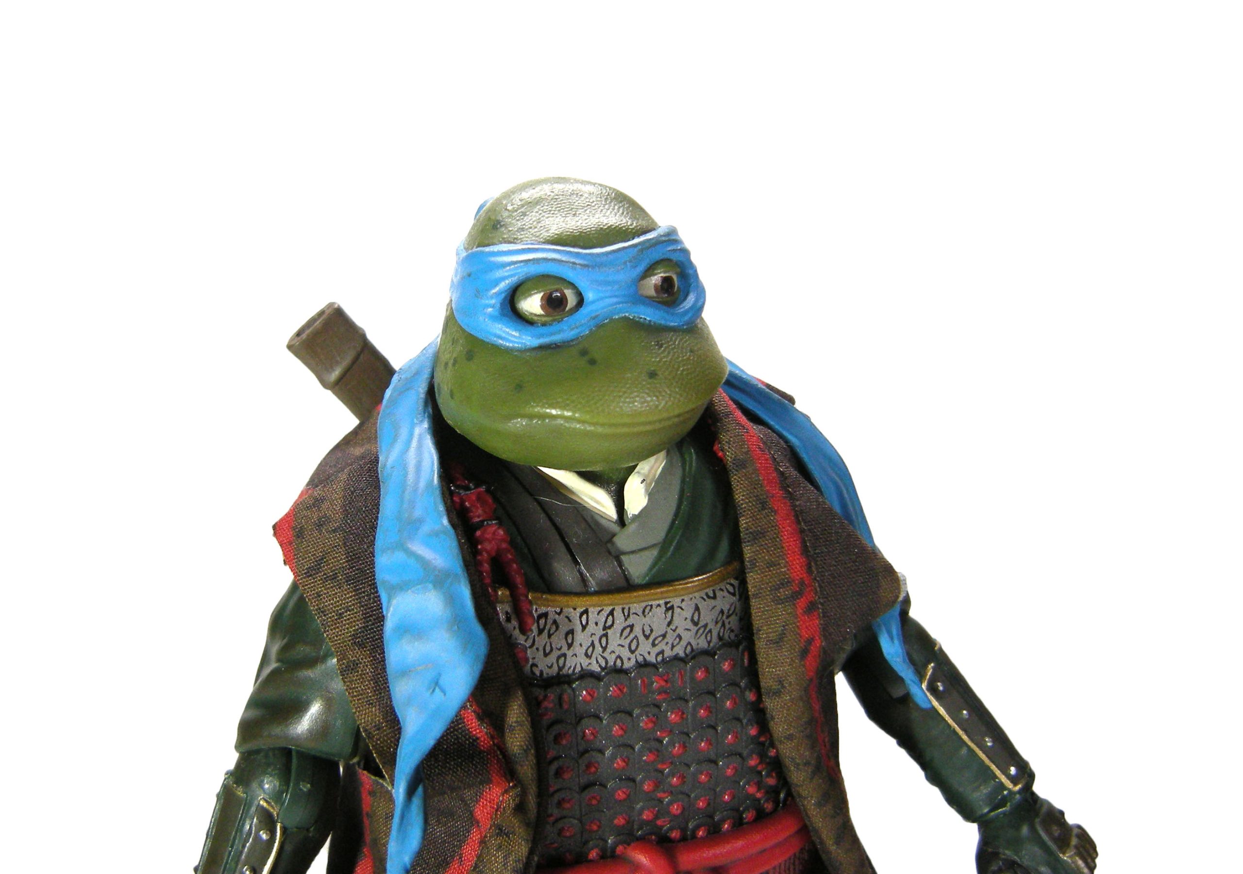 Notre samurai est très détaillé. Le rendu est impressionnant. L’armure présente de nombreuses finitions comme les clous sur les différentes plaques, les cordages qui les resserrent entre eux ou encore les nombreux plis des vêtements. Autre détail vraiment appréciable, la texture des différentes matières est représentée. Le pantalon est grumeleux avec un effet de mailles cousues. Les cuirs sont plissés au niveau des brassards et des jambières. Les différents tissus forment des plis en fonction de leur volume de manière à rendre un effet plus réaliste. On entrevoit la carapace à l’arrière du vêtement. Les lanières de la ceinture de Leonardo s’aperçoivent au niveau de son col, sous ses vêtements. Mon coup de cœur va au visage de la tortue. Lui aussi est texturé. Mais Brodie Perkins s’est attaché à reproduire l’effet des masques bas de gamme réalisés par All Effects Company. Le rendu est donc plus grossier que celui des premières figurines, avec des écailles très apparentes. Génial !