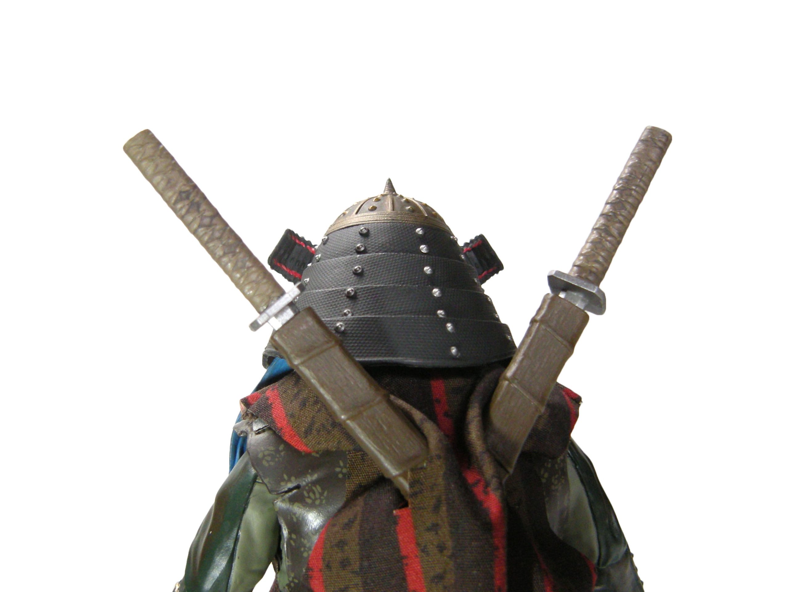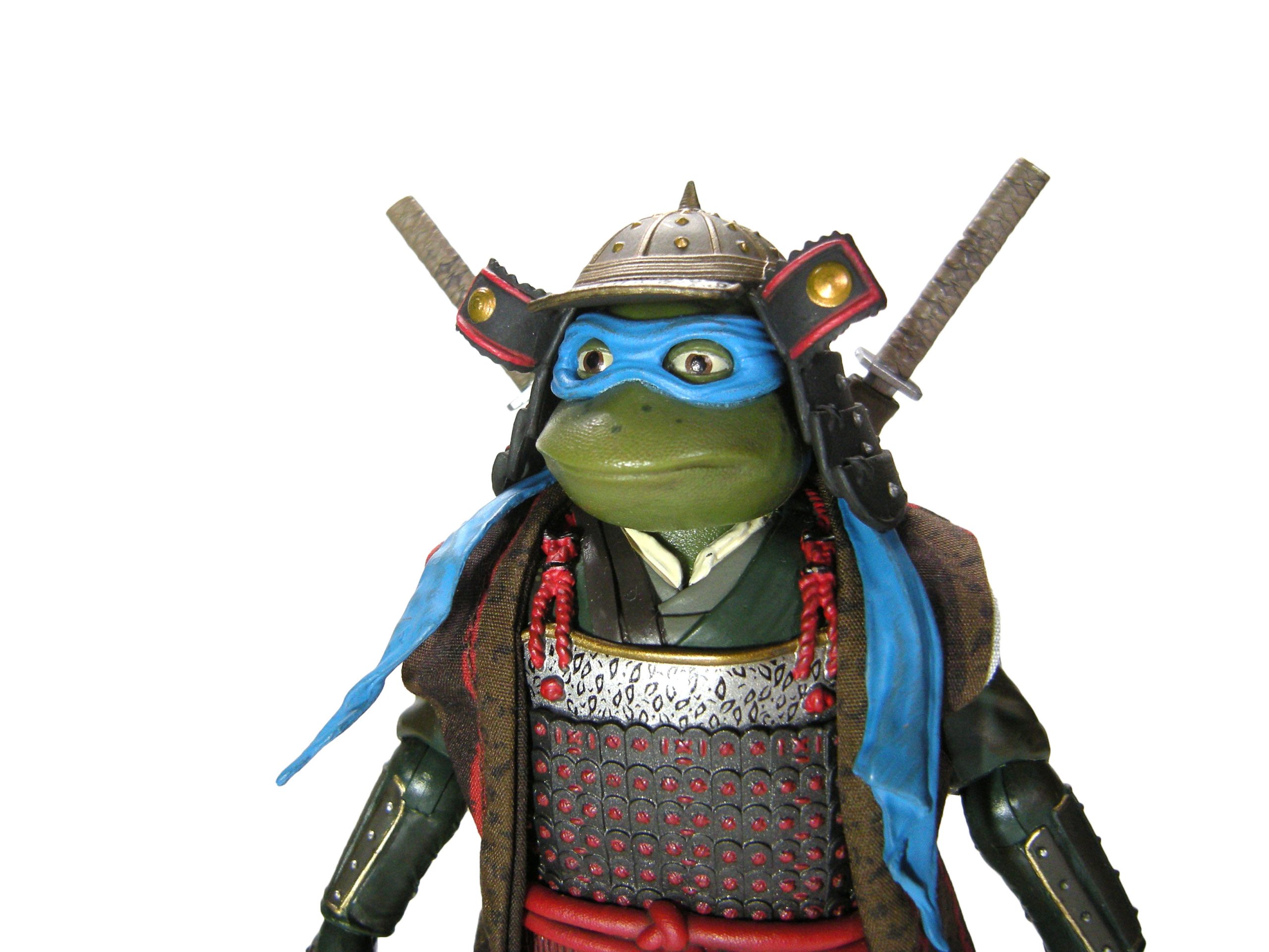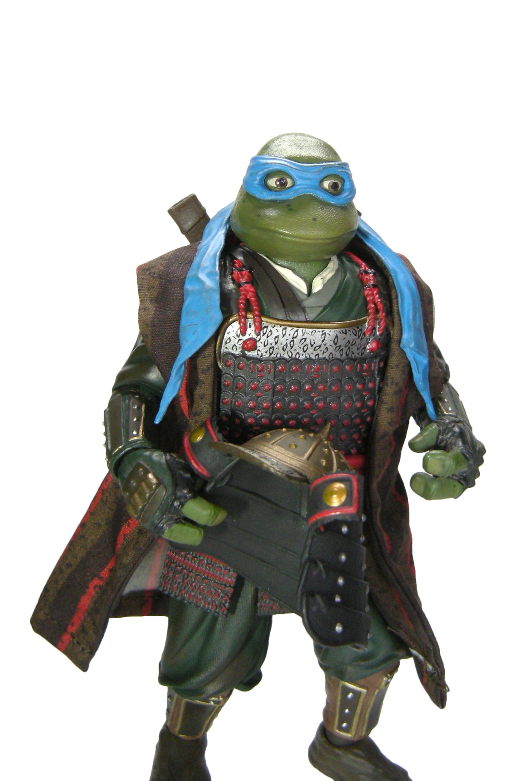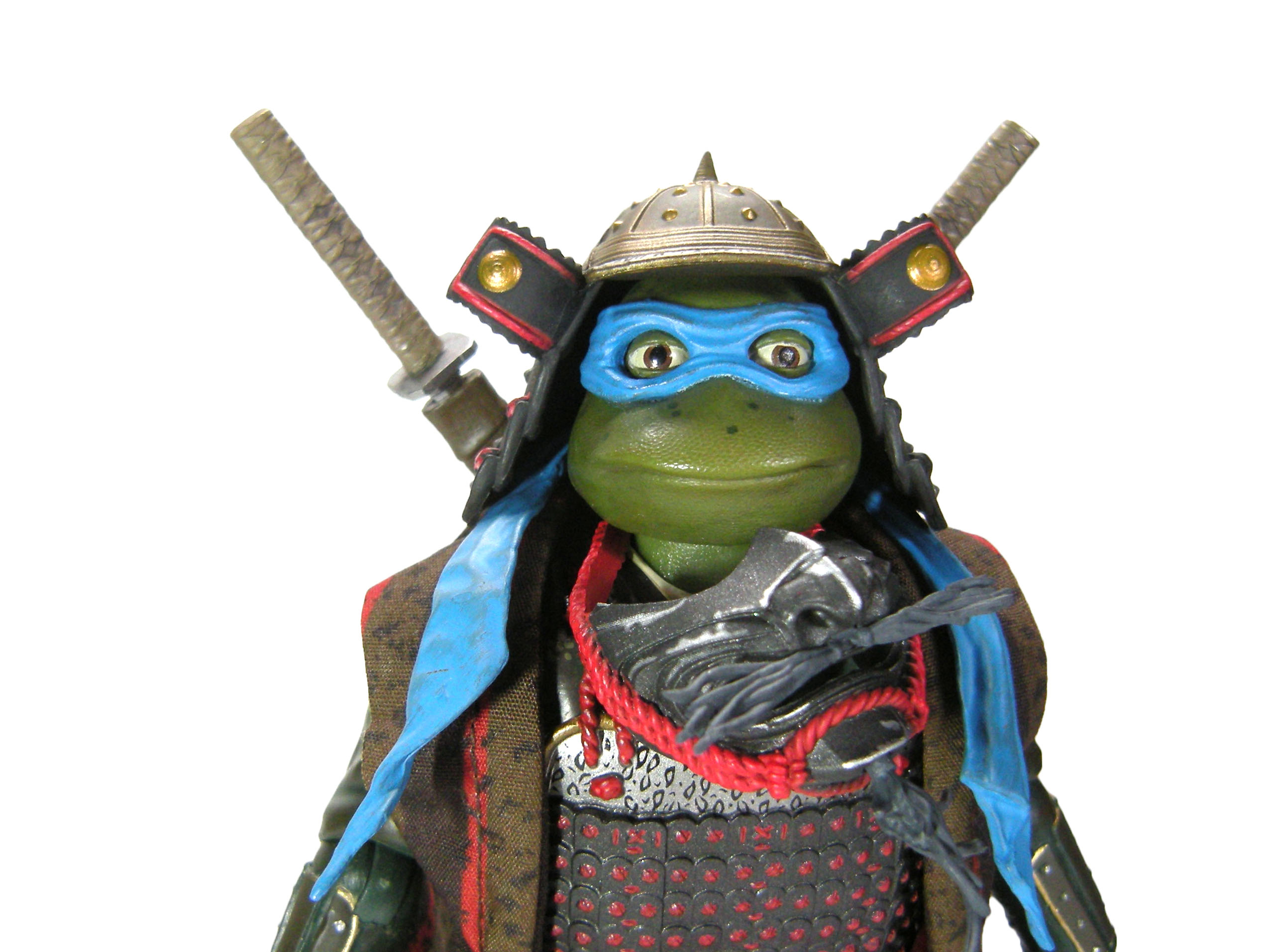Notre samurai est très détaillé. Le rendu est impressionnant. L’armure présente de nombreuses finitions comme les clous sur les différentes plaques, les cordages qui les resserrent entre eux ou encore les nombreux plis des vêtements. Autre détail vraiment appréciable, la texture des différentes matières est représentée. Le pantalon est grumeleux avec un effet de mailles cousues. Les cuirs sont plissés au niveau des brassards et des jambières. Les différents tissus forment des plis en fonction de leur volume de manière à rendre un effet plus réaliste. On entrevoit la carapace à l’arrière du vêtement. Les lanières de la ceinture de Leonardo s’aperçoivent au niveau de son col, sous ses vêtements. Mon coup de cœur va au visage de la tortue. Lui aussi est texturé. Mais Brodie Perkins s’est attaché à reproduire l’effet des masques bas de gamme réalisés par All Effects Company. Le rendu est donc plus grossier que celui des premières figurines, avec des écailles très apparentes. Génial !
