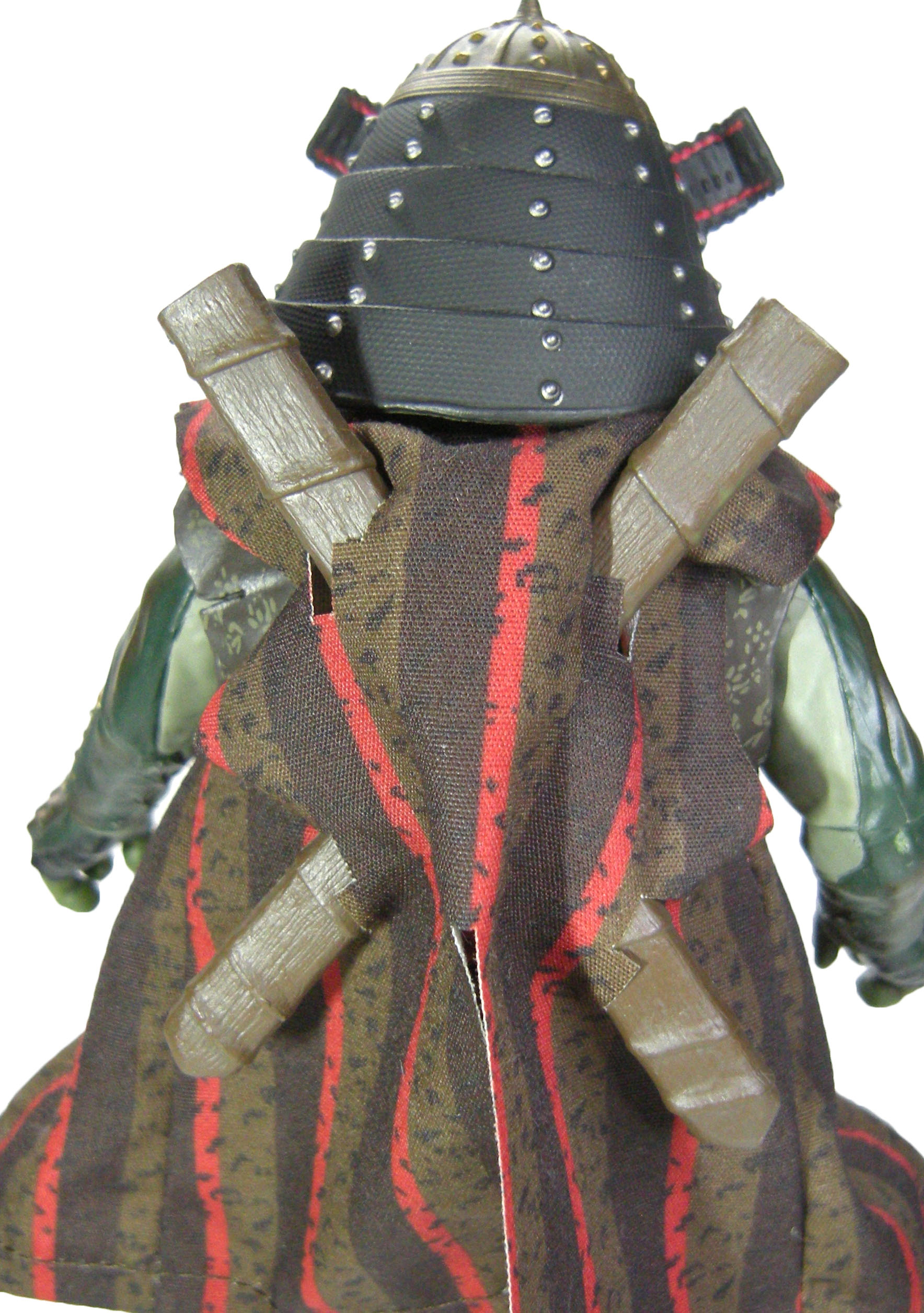 Il est d’ailleurs assez compliqué de mettre le manteau de Leonardo. Celui-ci est légèrement différent de celui des autres frères. Il présente quatre encoches, permettant de faire passer les extrémités des fourreaux. Ces encoches sont trop éloignées les unes des autres. Vous devrez donc forcer un petit peu pour y faire pénétrer les fourreaux. Au risque de déchirer le tissu. Et de ne plus pouvoir retirer facilement le manteau sur la figurine.