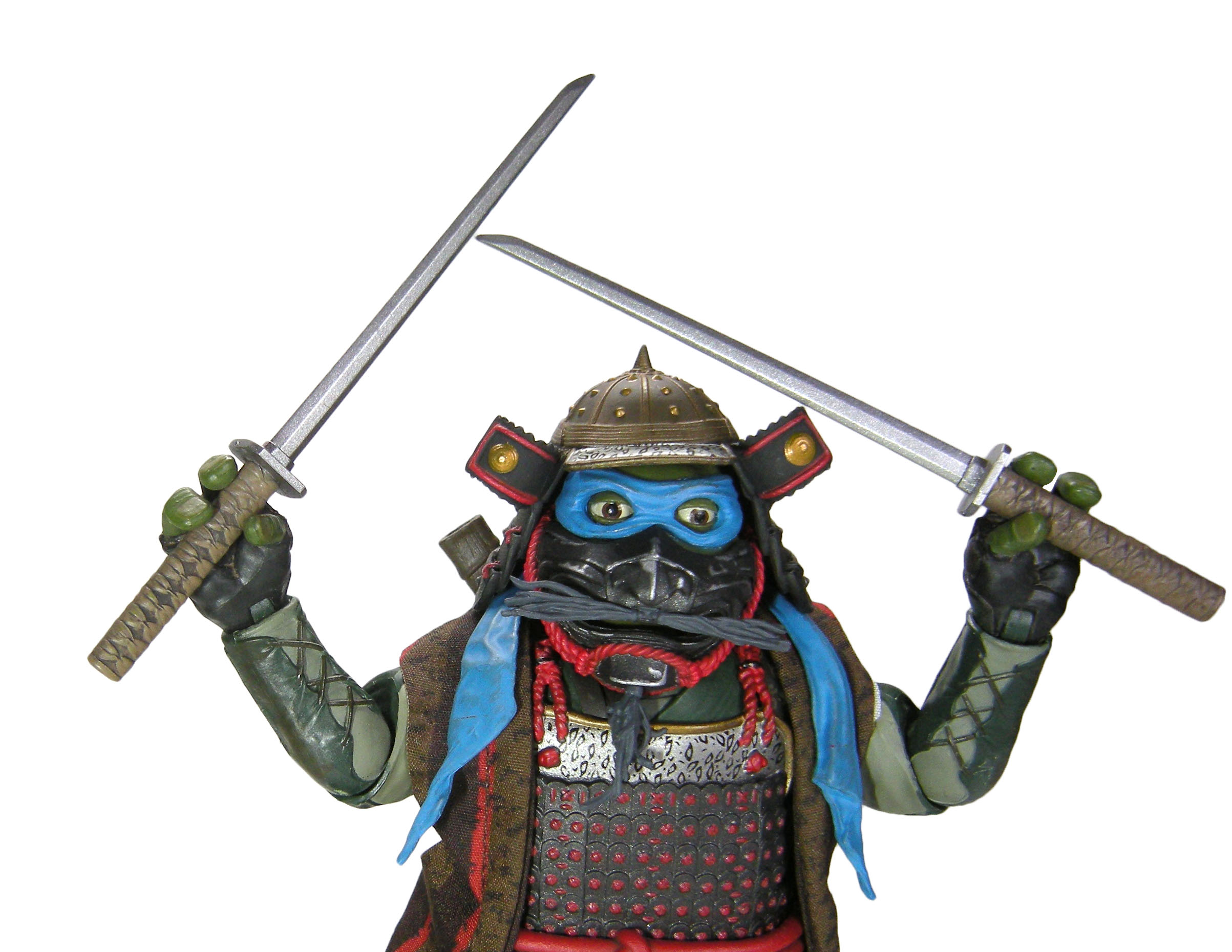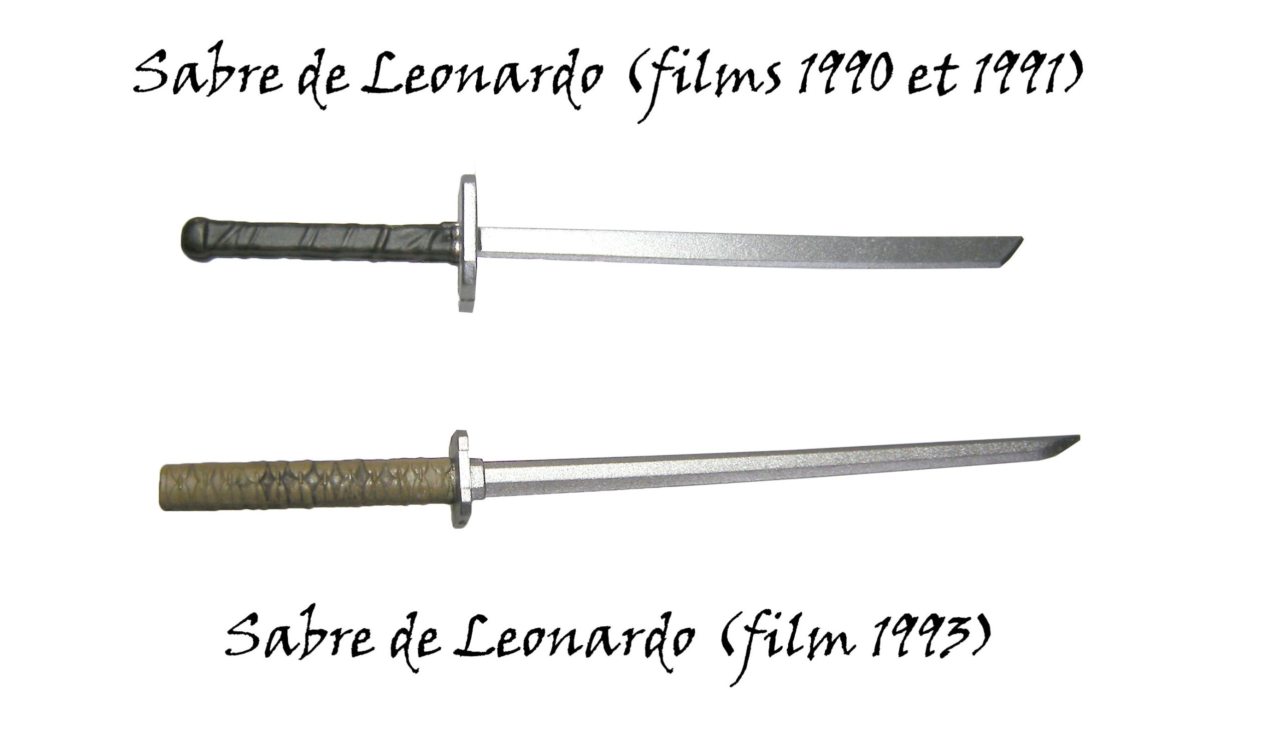 Les sabres de Leonardo sont les seules armes réellement inédites entre les tortues de ce pack. En effet, le ninja change radicalement d’armes entre le deuxième et le troisième film. Ces nouveaux katanas sont plus fins, avec un manche plus épais et long et une garde très étroite.