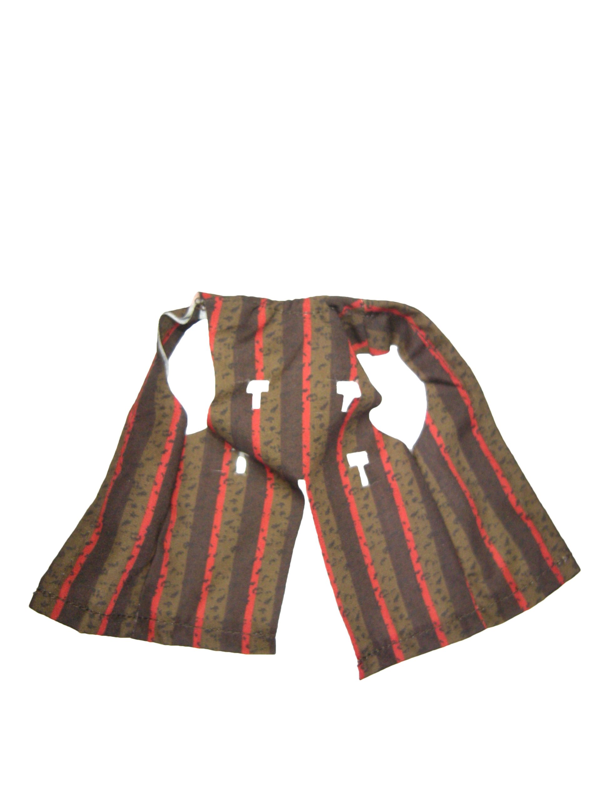 Enfin, le manteau. Aaah ce manteau ! Je suis étonné de voir qu’il rende aussi bien sur mes photos. Sans doute la piètre résolution de mon appareil. Car dans les faits, j’ai été déçu de voir à quel point il faisait faux. Le manteau est ici terriblement fin. Une tige de métal passe sur l’avant afin de donner un effet de mouvement au tissu. Hélas cela fonctionne à proximité de la tige. Mais les parties les plus éloignées ne sont pas affectées par la contrainte du tissu. Les motifs imprimés sur le manteau sont très sympathiques et rappellent ceux se trouvant sur le plastron ou le casque des tortues. Ces motifs étaient à l’origine de types floraux. On peut supposer qu’au vu de l’échelle, il était difficile de faire mieux, et ils sont déjà très bien ! En revanche, dans le film, le manteau était un accessoire épais et très détaillé. Un exemplaire a été vendu aux enchères en septembre 2023 et permettait d’avoir une bonne idée de sa qualité. J’imagine que la production n’a pas eu accès à des images parlantes. Ainsi, trois gros défauts apparaissent.
