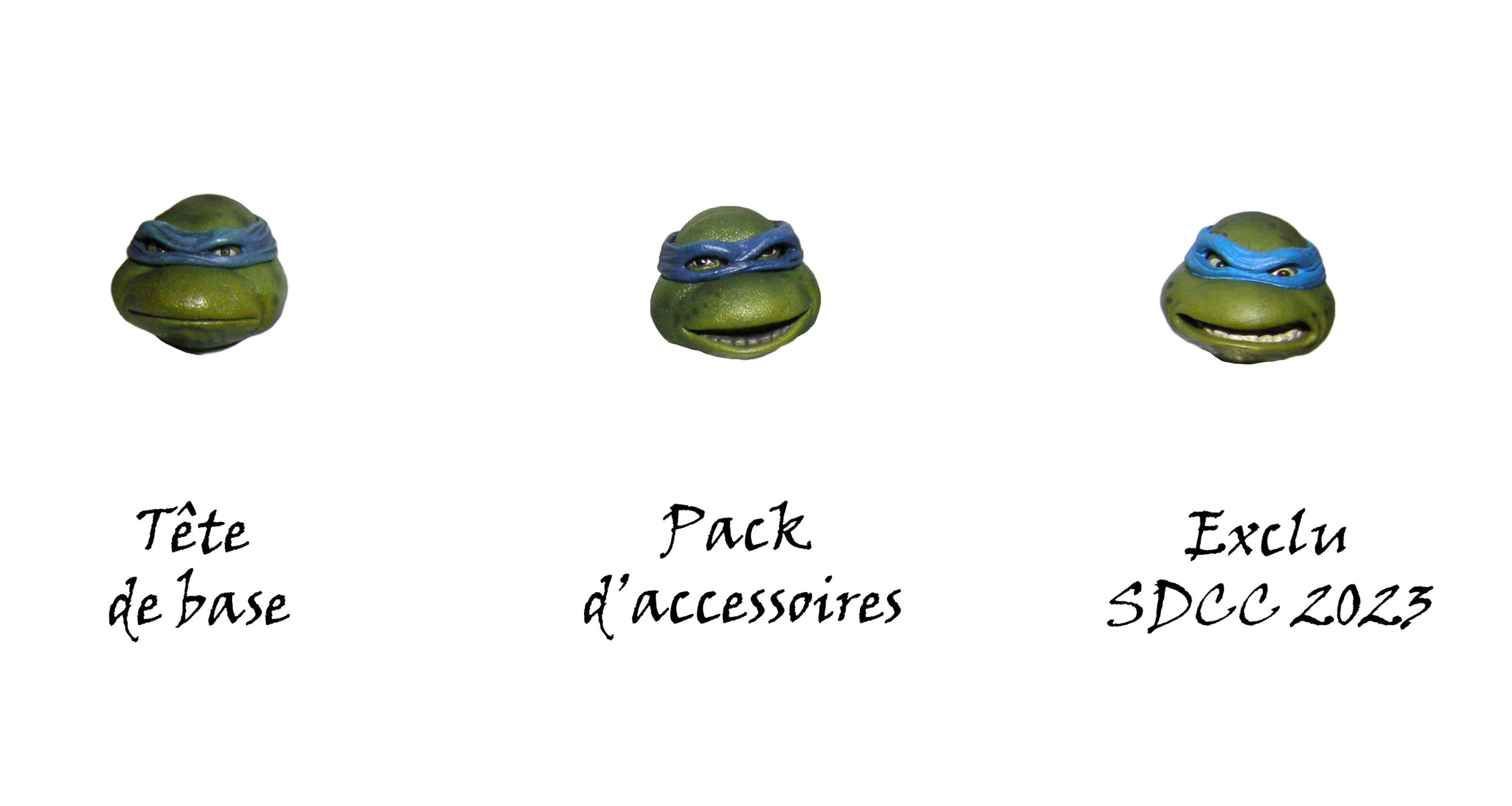 Ces deux sceptres sont réalisés avec des vitres en plastique transparent. Le petit sablier au centre est bien présent et maintenu par une tige horizontale (présente dans le film) et un étai transparent vertical pour le renforcer (propre à la figurine). La version détruite possède les mêmes inscriptions que la version restaurée, bien que très effacées. La version du forgeron est poussée au plus simple, comme dans le film. Même le bout du manche est cassé, comme s’ils s’étaient servis d’un manche d’outil du quotidien. Outre les deux sceptres, NECA a également poussé le vice plus loin en proposant quatre nouvelles têtes de tortues. Sauf qu’elles ne proviennent pas d’expressions du troisième film, comme il est possible de l’entendre dans certaines reviews vidéos. Il s’agit des têtes des tortues du premier film. Les expressions sont principalement reprises du combat final contre Shredder. Leonardo est grimaçant et son regard porte vers le bas. Il s’agit de l’expression de la tortue lorsqu’elle se fait jeter au sol par Shredder, qui le menace de mort. Malheureusement, si l’intention est terriblement louable, ces têtes ont un gros défaut. La peinture !! Ils ont été peints avec les codes couleur des tortues du deuxième film. Il ne sera donc pas possible d’utiliser les bandeaux du premier film, plus foncés et plus courts.