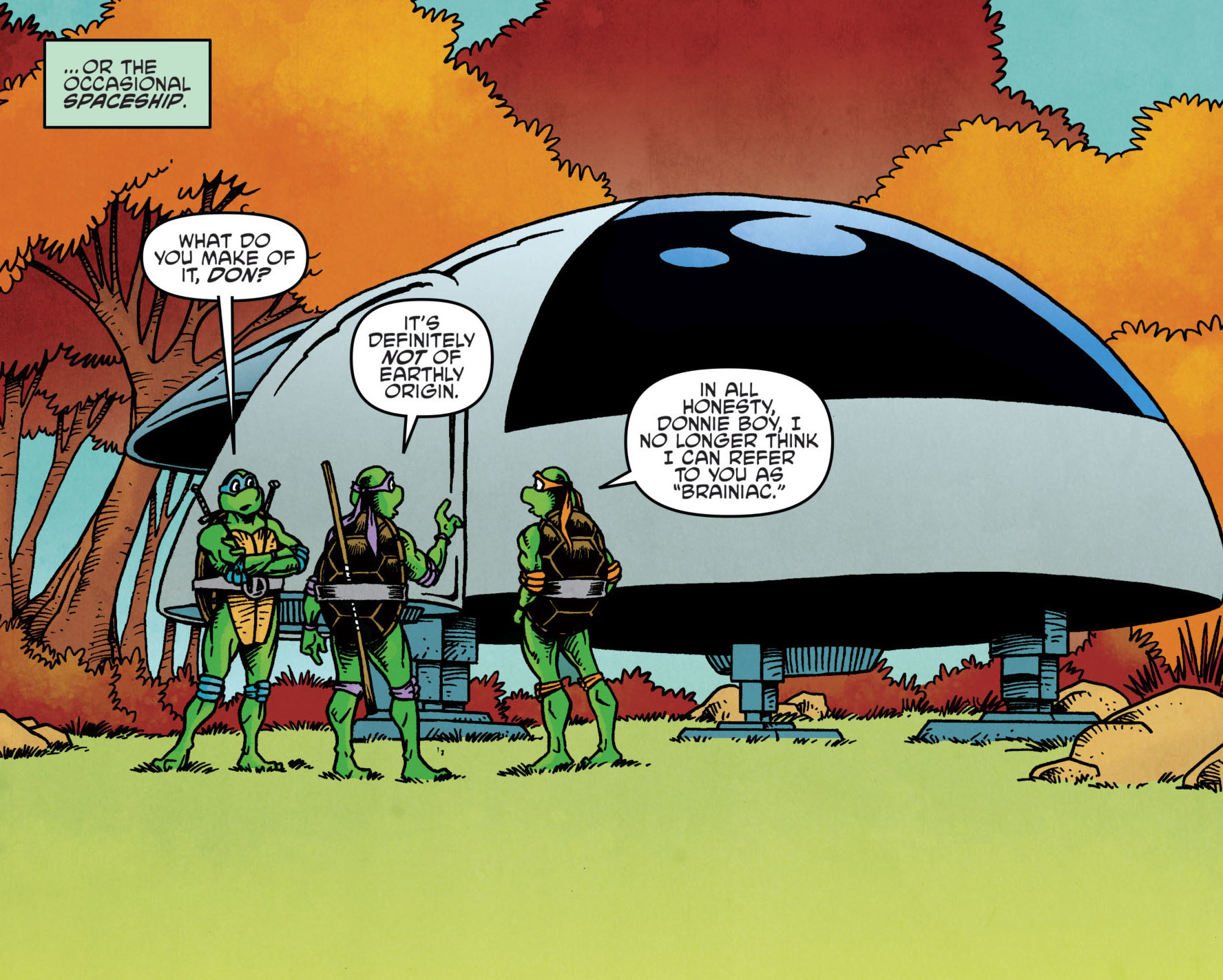 Un étrange vaisseau spatial s’était posé à Central Park. Les tortues s’en approchaient, quelque peu surprises. Seul Raphael manquait à l’appel. Et ses frères le regrettaient, il serait sans doute rentré à l’intérieur pour voir s’il y avait du monde. Leonardo adoptait une attitude plus mesurée, en posant son oreille contre la paroi de l’appareil et cherchant à déceler un bruit. Mais soudain, des cris se firent entendre à l’extérieur du parc. Une foule sortait d’une supérette en hurlant en direction du Colombus Circle. Les tortues essayaient de se frayer un chemin jusqu’à atteindre le supermarché.