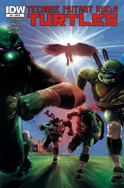 Leur conversation se faisait interrompre par un bruit sourd. Les compagnons voyaient les poutres du toit de la grange s’effondrer et un faucon pénétrer dans la pièce, accompagné de quatre ninjas Foot assassins. Il s’agissait de Koya, le rapace de Shredder (TMNT #25). Seul Splinter connaissait ces nouveaux ninjas Foot. Les plus redoutables guerriers de Shredder. Les tortues allaient devoir rester prudentes et redoubler d’efforts. Pendant leur combat, Raphael apercevait Alopex s’échapper de la grange. Ses doutes reprenaient le dessus et pensait qu’elle avait donné leur position à l’ennemi. Il lui sautait dessus sans plus tarder. Le combat n’était pas simple, les assassins étaient très rapides. Splinter quant à lui ne parvenait pas à prendre le dessus sur Koya avec sa patte cassée.