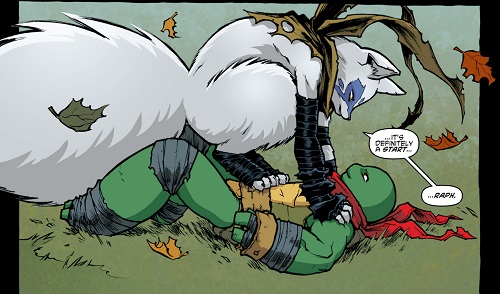 Elle voyait alors le Foot Clan comme sa famille, sans se rendre compte que c’était Shredder qui lui avait ôté la sienne. Cet homme détruisait tout ce qui lui paraissait inutile. Finalement ils n’étaient pas si différents, Raphael avait passé de nombreux mois seuls avant que ses frères ne le retrouvent (Change is constant). Pour détendre l’atmosphère, elle se moquait de nouveau de lui. Pour lui rendre la monnaie de sa pièce, la tortue essayait de la balayer au sol du pied. Son adversaire esquivait l’attaque. Quelques coups amicaux suivaient, puis Alopex renversait Raphael. Les luttes sanglantes des semaines précédentes laissaient place à des chamailleries enfantines.