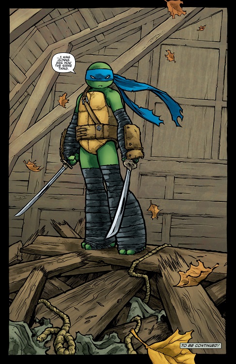 Leonardo s’entrainait au bord du petit lac, repensant à son combat contre Raphael au théâtre (TMNT #28) et la décapitation de Victor (TMNT #27). Splinter le rejoignait timidement. À travers quelques allégories, il lui faisait comprendre que Shredder s’était servi de lui comme de son épée. Yoshi pensait lui aussi être l’épée du Foot Clan, jusqu’à ce que Tang Shen lui ouvre les yeux et lui annonce qu’elle était en ceinte de Leonardo (TMNT Micro-series : Splinter). Son allégeance au Foot Clan était du passé. Sa famille avait dorénavant besoin de lui plus que jamais. Le rongeur lui donnait un bandeau bleu avant de s’en aller. Leonardo restait immobile, regardant son présent.tmnt-31-idw-comic-4-splinter-leonardo-tortues-ninja-turtles-tmnt
