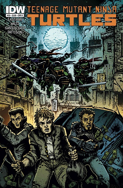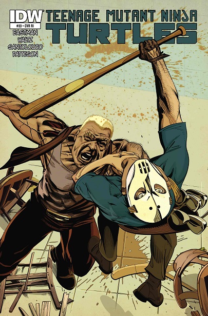 Afin d’avoir un peu de tranquillité, Hun et Casey étaient partis s’entretenir à l’extérieur du pub. D’un ton très calme, le père expliquait la situation compliquée dans laquelle ils se trouvaient tous deux. L’ancien ivrogne suppliait presque Casey de rejoindre le Foot Clan, pourvu qu’il survive. Il utilisait l’exemple de l’exécution de Victor (TMNT #27) pour le convaincre. Il était totalement hors de question pour le jeune homme de tomber aussi bas et s’allier à ce groupe d’assassin, et de trahir les siens.