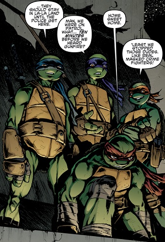 De retour au sommet d’un immeuble, les tortues étaient surprises d’avoir trouvé aussi vite des bandits pendant leur ronde. Lourdement armés qui plus est ! Il était grand temps qu’elles reviennent à New York ! Michelangelo aurait bien continué la chasse, mais ses frères n’étaient pas de cet avis. Leur but n’était pas de jouer aux héros. Plutôt de retrouver la forme et leurs talents afin de reprendre le combat contre le Foot Clan.