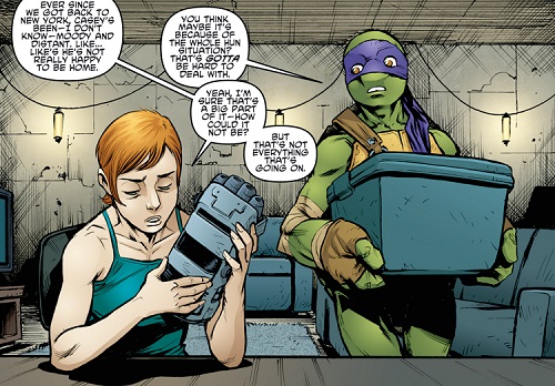 Au repaire des tortues, April travaillait sur le gantelet anti-gravité. Casey venait d’éteindre la télévision et partait pour le Skara Brae pour parler avec Angel à propos des Purple Dragons. April le retenait car ils devaient parler de leur avenir, à eux en tant que couple mais aussi de celui de Casey et de ses cours à l’université. Ils allaient bientôt reprendre. Pressé, le jeune homme promit à sa compagne d’évoquer le sujet à son retour. D’autres problèmes le tracassaient pour l’heure. Il adressait à peine quelques mots à Leonardo et à Donatello qui venaient de rentrer. Les tortues sentaient tout de suite un certain malaise. Leonardo était attendu dans les souterrains par Splinter qui méditait. Seul, Donatello en profitait pour poser quelques questions à April sur leur ami bagarreur. Il voyait bien que quelque chose n’allait pas, et supposait que c’était en lien avec la renaissance de Hun (TMNT #27). April savait qu’il y avait autre chose, il fuyait le sujet de son retour en cours. Avec son hospitalisation (TMNT #23), il avait perdu sa bourse pour jouer au hockey. Il pouvait bénéficier d’aides sociales, mais ne semblait pas emballé par cette idée. S’il se rendait jusqu’alors en cours, c’était pour jouer au hockey et non l’inverse. Ce qui attristait April qui adorait au contraire étudier.