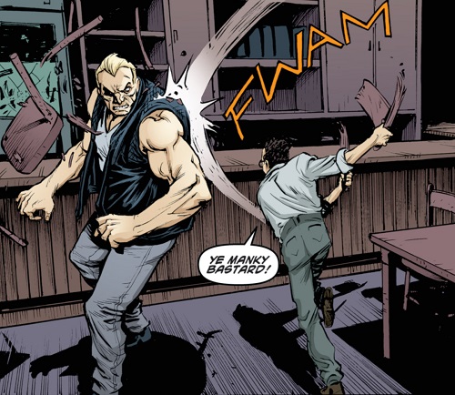 Angel savait pertinemment que le combat serait vain, et suppliait la brute d’arrêter le massacre. Le colosse prétextait vouloir parler à Casey, ce que la jeune femme refusait de croire. C’est au même moment que la porte du pub s’ouvrait. Le fils Jones entrait, le sac à son dos rempli de crosses et battes pour le combat. Il était prêt à parler.