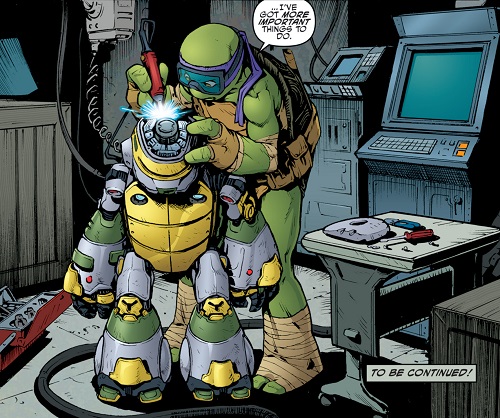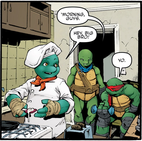 Leonardo entrait dans la cuisine au même moment demandant des nouvelles de Donatello. La tortue travaillait d’arrache-pied avec Harold Lillja sur quelque chose. Splinter entrait à son tour et demandait à ses fils de ne plus attendre leur frère qui avait à présent choisi son camp. Il ne suivait pas la même ligne directrice, mais respectait le choix de la tortue. Ils devaient en faire de même et avancer dans leur combat.