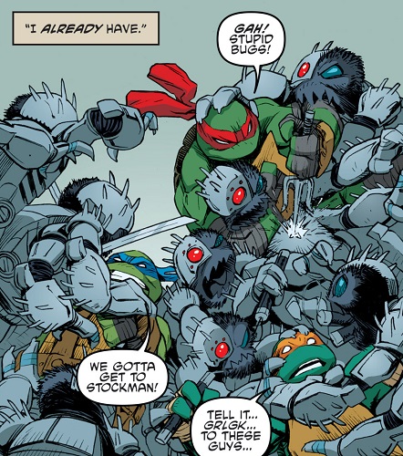 Le combat faisait rage entre le Foot Clan et les armées de Krang. Non loin de là, Leonardo et ses frères observaient les affrontements, cachés dans les fourrés, à l’aide de jumelles. Si les deux factions ennemies étaient bien présentes, le Fugitoid manquait à l’appel. Et ce qui n’était pas pour rassurer Michelangelo qui espérait qu’ils ne s’étaient pas trompés de dimension une nouvelle fois (TMNT / Ghostbusters). Ils n’avaient guère le temps de l’attendre, il leur fallait atteindre le Technodrome au plus vite.