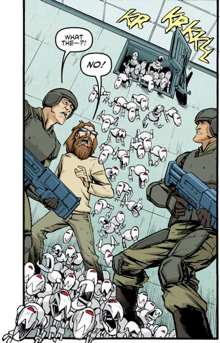 Le Fugitoid ne pouvait laisser cela se faire et devait trouver une solution alternative. En quelques instants, il se changeait en Chet Allen et frappait à la porte pour annoncer aux gardes que le Fugitoid s’était échappé. Deux hommes venaient ouvrir la porte à un scientifique de Krang sans comprendre ce qu’il se passait réellement dans cette cellule. Baxter quant à lui était stupéfait de voir que son associé de l’époque de StockGen était finalement le Fugitoid. Hors de question qu’il se fasse doubler, il activait un émetteur sur sa montre. Les grilles d’aération de la pièce sautaient pour laisser entrer des dizaines de petits Mousers qui déferlaient à leurs pieds. Soudain, une puissante onde de choc était émise, plongeant dans le coma tous les occupants de la pièce. Seul Stockman, qui avait tout prévu, restait indemne. Une nouvelle victoire à son tableau de chasse.