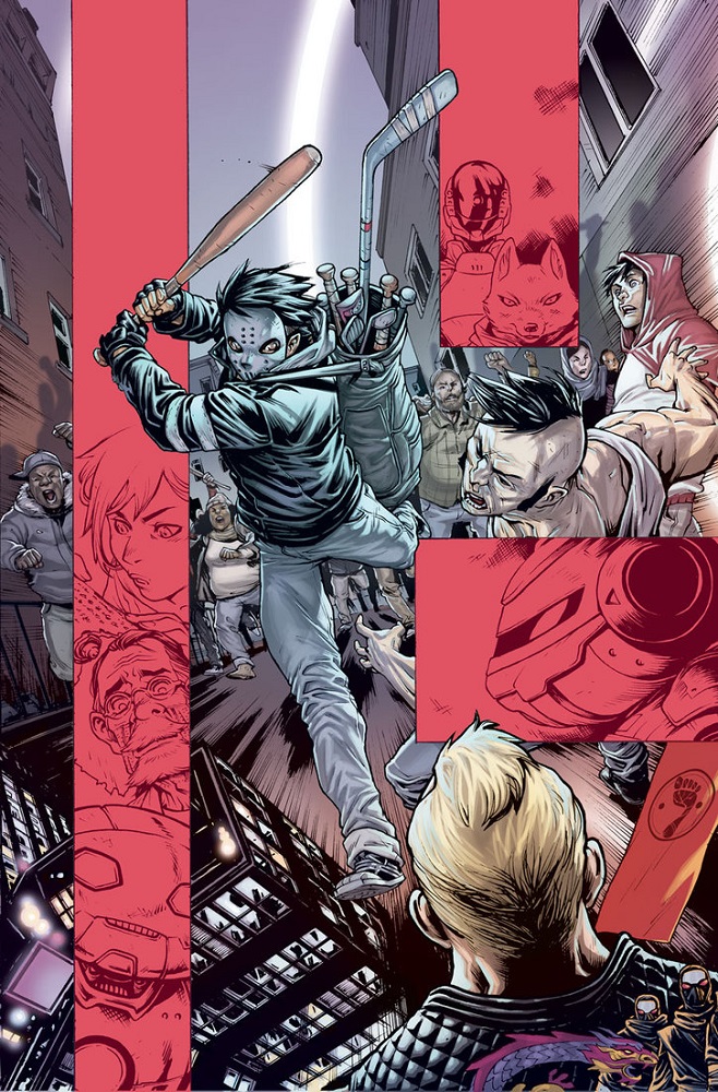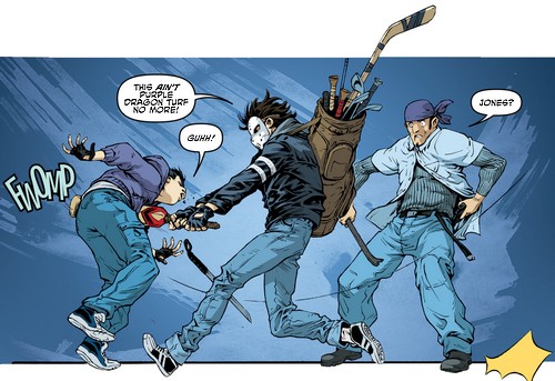 Il n’était pas question uniquement des tortues, lorsque Karai parlait de traitrise. Elle faisait également référence à Hun, qui s’en était effectivement allé. Ses Purple dragon terrorisaient de nouveau la ville, mais cette fois sans le soutien intéressé du Foot Clan. Trois de ses hommes, Chun, Malo et Link, dévalisaient une supérette tenue par une famille. Deux d’entre eux étaient restés à l’extérieur et n’avaient pas vu une ombre s’approcher à toute vitesse. Casey Jones, brandissant une batte de cricket, s’attaquait aux hommes. Le raffut attirait Link, resté à l’intérieur pour menacer l’un des commerçants. À peine était-il sorti qu’il reçut un coup de batte dans les jambes. Ripostant avec une chaîne, celle-ci s’enroulait sur l’arme de bois du justicier avant d’être envoyé au tapis. La victime du larcin venait remercier son sauveur ; Casey était là pour protéger le quartier et n’hésiterait pas à recommencer si d’autres délinquants s’en prenaient de nouveau à l’un des habitants. Il était temps que quelqu’un leur tienne tête, unique moyen de leur faire comprendre. En attendant, il lui remettait sa batte de cricket, au cas où il ne puisse intervenir à temps la prochaine fois. Avant de s’en aller, Arune tenait à le prévenir de la présence d’une quatrième personne ce soir-là. Un homme de grande carrure, rien à voir avec les trois autres. Mettant du temps à comprendre, Casey voyait Hun devant la boutique des O’Neil.