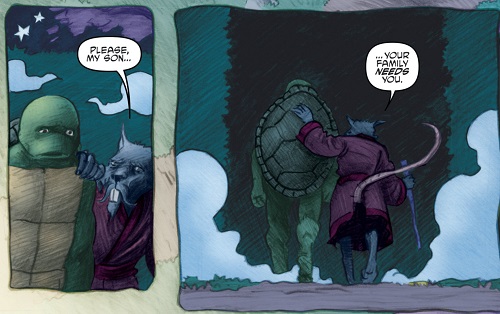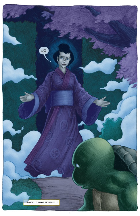 Ouvrant les yeux, Donatello se demandait où il était. Des arbres, un sentier, de l’herbe, une lueur chaleureuse au loin. Rien à voir avec le vieux laboratoire d’Harold et la tension du combat auquel il avait pris part. Une voix féminine s’adressait à lui alors qu’il s’avançait vers ce chemin ; il s’agissait de Tang Shen, sa mère, qui l’accueillait à bras ouverts et l’invitait à visiter ce paisible lieu.