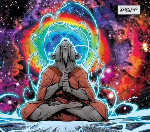 Le portail s’enclenchait au même instant et le Fugitoid en sortait avec d’excellentes nouvelles pour son ami Donatello. Le général Krang avait été capturé et remis aux autorités neutrinos pour un procès qui ne saurait tarder. La Terre était sauve ! S’avançant vers ses amis, il constatait avec effroi que les tortues, Splinter et leurs amis étaient tous recueillis au chevet du corps inerte de Donatello (TMNT #44). Raphael, comme les autres, se lamentait de sa mort, n’ayant rien pu faire. S’approchant de son ami tortue, le robot sentit un pouls, bien que très faible. L’espoir renaissait dans le cœur des siens. Sans tarder, il devait être déplacé vers une pièce froide, ce que possédait justement le laboratoire afin refroidir certaines unités centrales de Harold Lillja. Le robot voulait ralentir le métabolisme du blessé mais le temps jouait contre eux. Il allait repartir immédiatement pour le Technodrome afin d’y prendre quelques objets en urgence. Splinter regardait leur ami s’en aller. Préoccupé par l’état critique de son fils, il se posait dans un coin de la pièce froide où reposait la tortue convalescente pour méditer. Son esprit se transportait au même endroit que celui de son fils. Il restait à présent à le retrouver et le ramener avec lui.