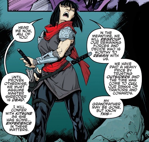 Mais les problèmes n’allaient pas s’arrêter de si tôt. Koya et Bludgeon venaient de rentrer de Burnow Island et avaient une terrible nouvelle à révéler à leur supérieur ; Krang les attendait, il s’agissait d’une embuscade et Donatello était de mèche. Leur armée avait été décimée par l’arme secrète de l’utrom et ils étaient les seuls survivants. Shredder avait péri au combat. Hors de question pour Karai, qui avait déjà redoré le blason de son clan une fois, de baisser les bras. Ils avaient payés le prix fort pour avoir fait confiance à des étrangers et avaient perdus leur maître. Le Foot Clan n’était pas éteint pour autant et les traitres payeraient leur geste.