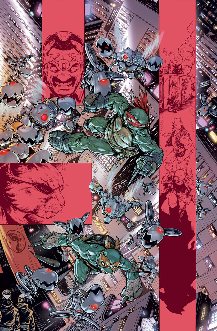 Baxter se trouvait un casque de contrôle mental. N’attendant plus qu’un feu vert, il n’en avait rien à faire des réclamations de Karai qui ne voyait aucun honneur dans ce que s’apprêtait à faire Shredder. Une fois l’ordre donné, le casque fut posé sur la tête de Baxter et une nuée de Mousers et de Flyborgs volèrent du T.C.R.I. à travers toute la ville en direction de la vieille église où se cachaient les tortues. Kara Lewis les apercevait dans le ciel depuis sa voiture, tout comme Alopex et Nobody qui se tenaient sur le sommet d’un immeuble, scrutant la ville à l’affut de la moindre alerte. Ils survolaient encore le quartier où habitaient les parents d’April, qui était venue leur dire au revoir ; elle partait avec Casey pour l’ouest du pays.
