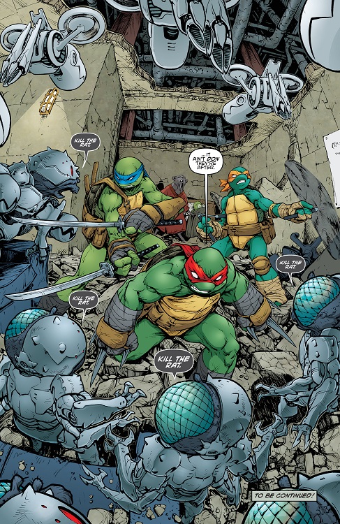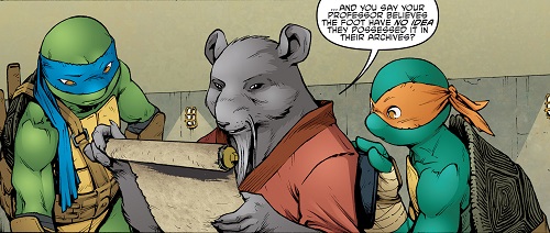 - Leonardo trouve étrange l’individu au visage de rat sur le parchemin ramené par April. Il s’agit évidemment du Rat King, qu’il a rencontré avec Splinter dans le TMNT #36. Avant de disparaître dans l’ombre, l’être immortel leur avait effacé la mémoire, ce qui explique pourquoi il ne se souvient pas exactement de qui il est.