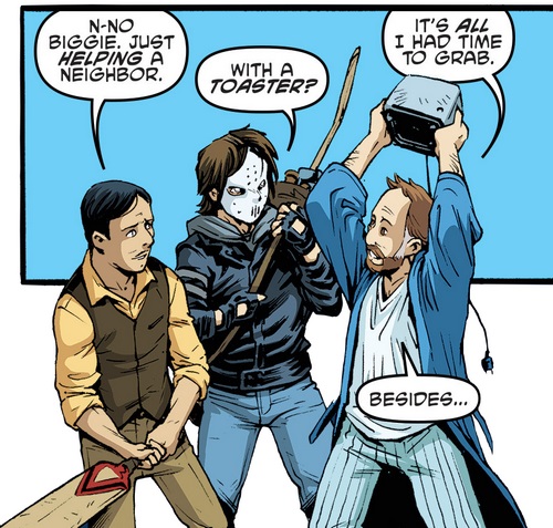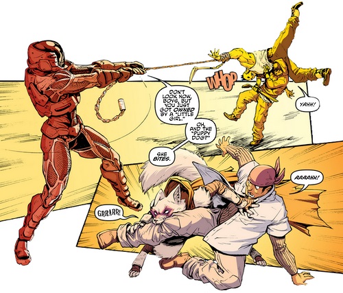 Déçu de ne voir personne lui répondre, Hun s’apprêtait à lancer les hostilités sur la maison des O’Neil avec ses Purple Dragons. Casey sortait alors, escorté d’Angel et d’Alopex. À l’intérieur, Elizabeth s’empressait d’appeler les secours, voyant le nombre incroyable de délinquants devant leur maison. Les acolytes de Hun se moquaient du jeune homme et de ses deux amies, certains de leur victoire. Après avoir bu quelques gorgées de la nouvelle bouteille de Zack Baniel’s, le colosse provoquait son fils pour qu’il vienne lui montrer de quoi il était capable au combat. Fondant sur leurs adversaires, les trois amis étaient totalement dépassés en nombre malgré leurs aptitudes particulières au combat. John O’Neil descendait les escaliers, enfilant une veste, pour leur prêter main forte. De l’autre côté de la rue, Arune saisissait derrière son comptoir la batte de cricket que Casey lui avait donnée quelques heures auparavant. Il ne pouvait rester les bras croisés après ce que le jeune homme avait fait pour lui (TMNT #46).